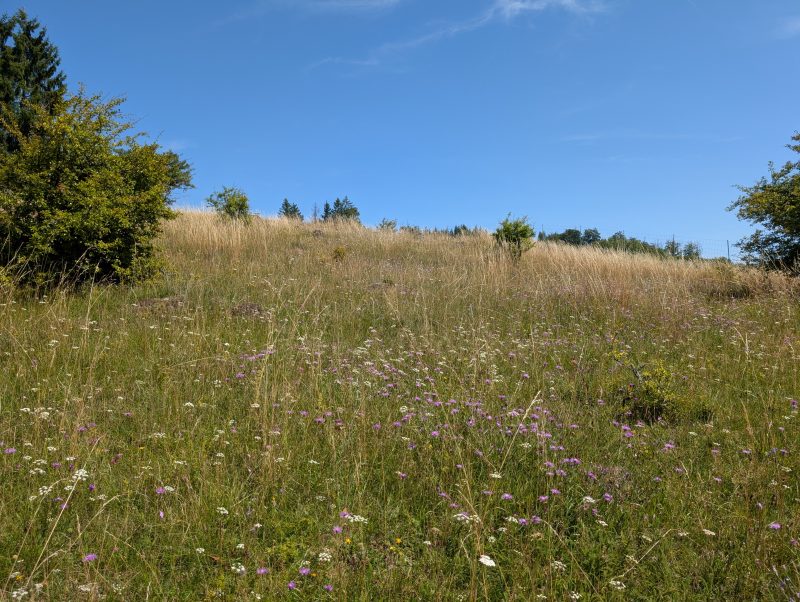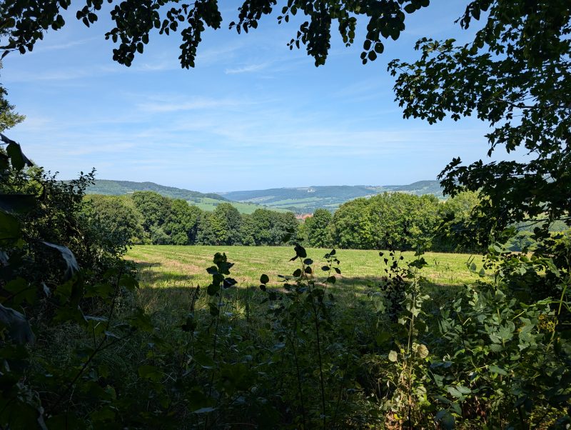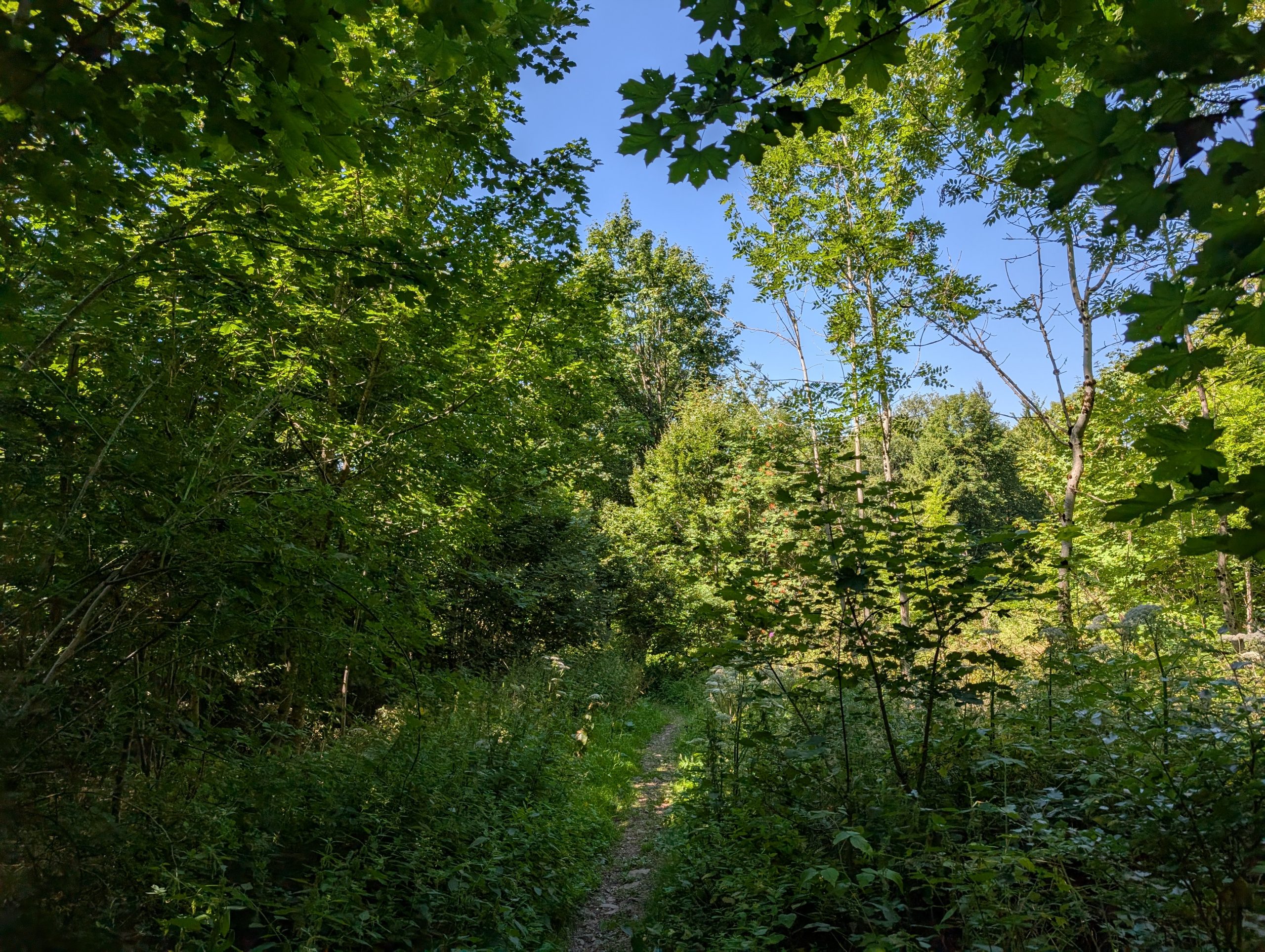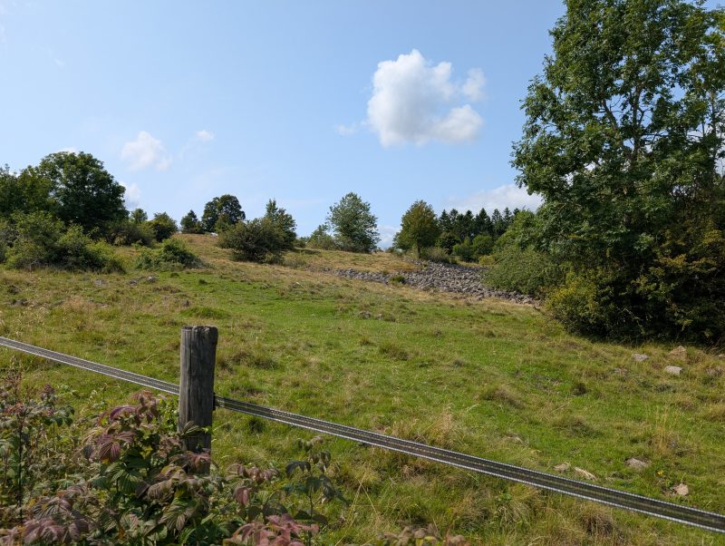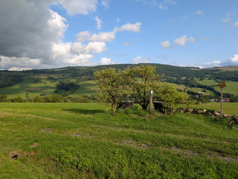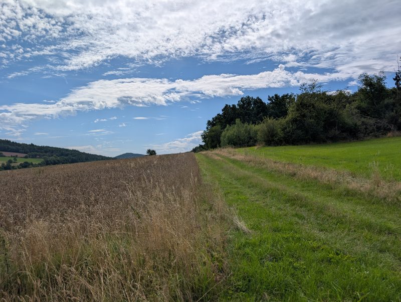 Die Hügelkette im Westen verläuft parallel zur A4 und verteilt die Höhenmeter recht sanft. Da kein Übernachtungsgepäck zu transportieren ist, erfolgt der Aufstieg schnaufend und laaangsam aber stetig. Laxberg (408), ok, aber an der Stellerskuppe (481) hat der Routenplaner nicht aufgepasst. Nein, das war nicht komoot, auf die Radwegemarkierungen gebe ich nichts, es geht nur nach den Wegeklassifizierungen auf den OSM oder Topo Karten. Und da habe ich einen Pfad in die Tour eingebaut, der nicht begehbar weil zugewachsen war.