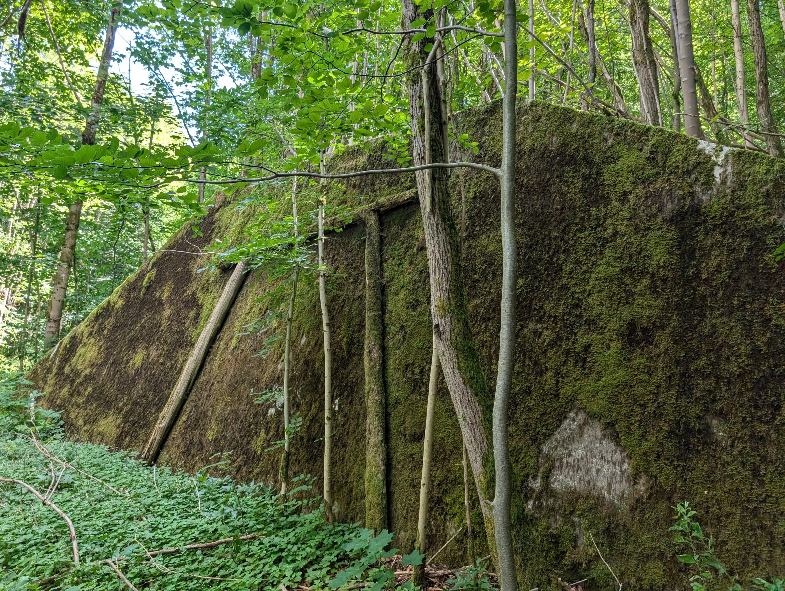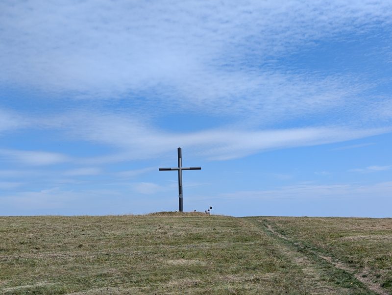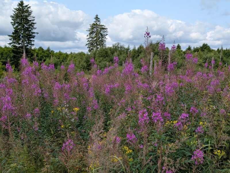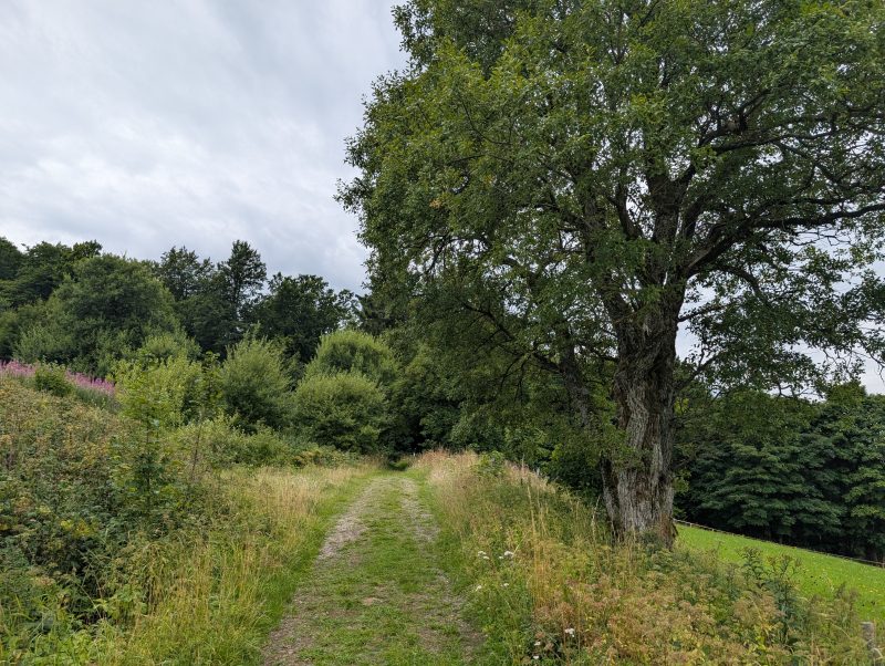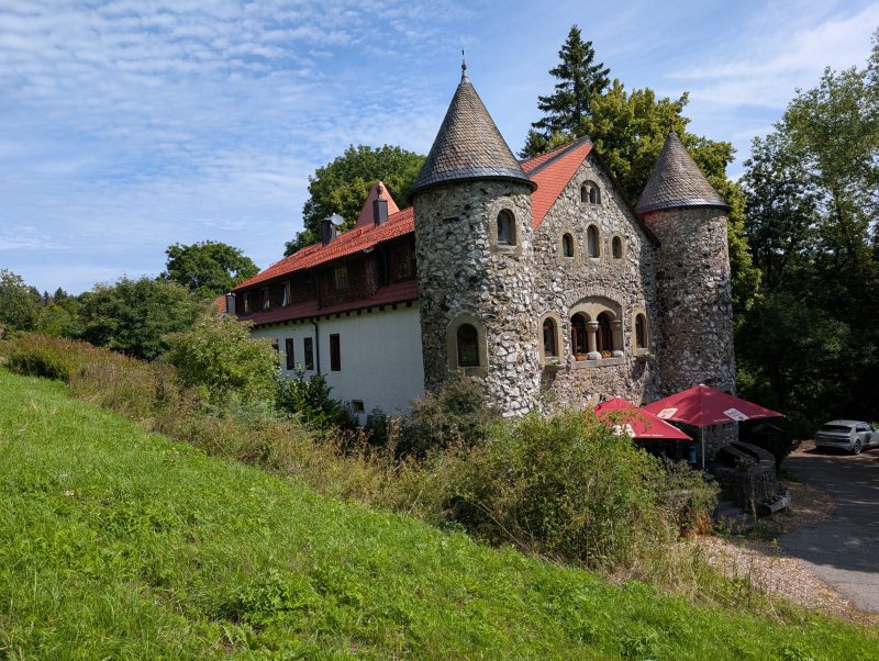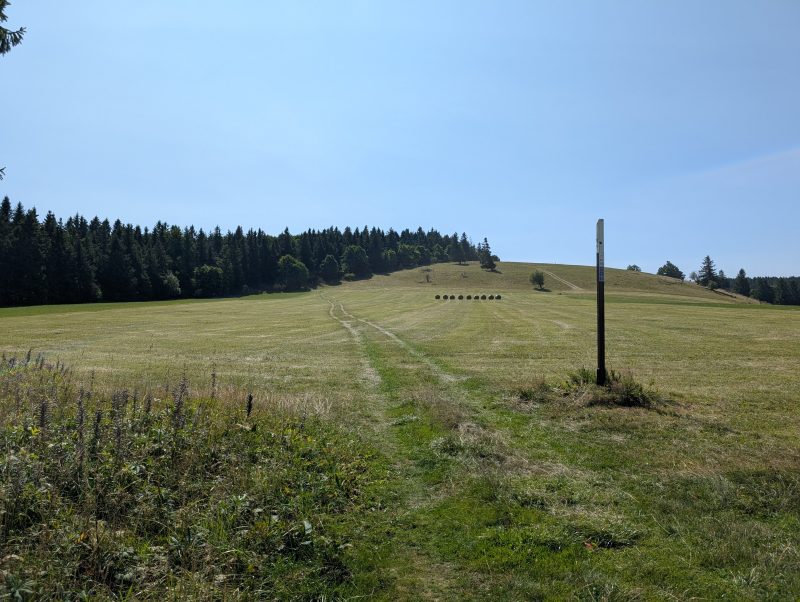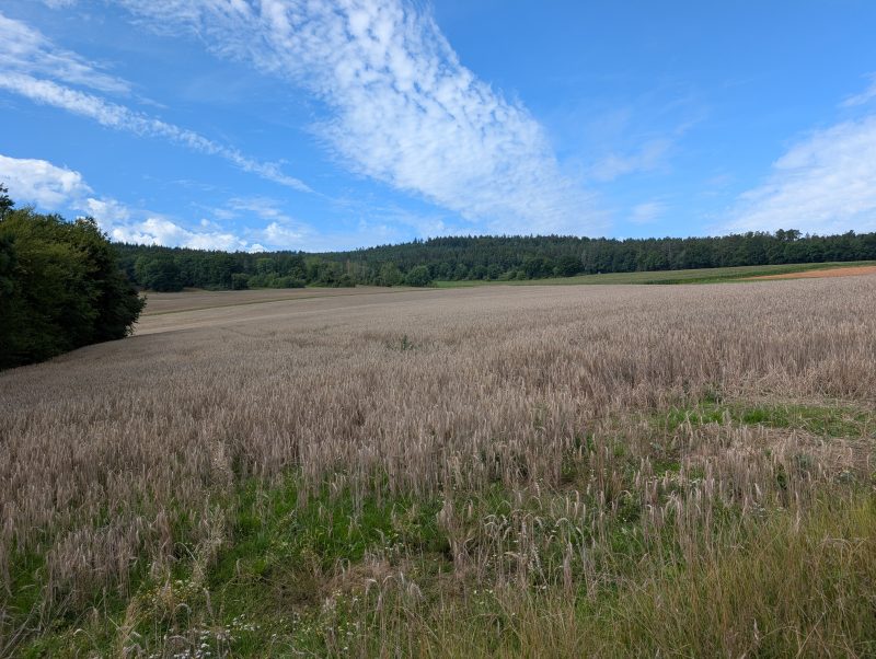 Die Hügelkette im Westen verläuft parallel zur A4 und verteilt die Höhenmeter recht sanft. Da kein Übernachtungsgepäck zu transportieren ist, erfolgt der Aufstieg schnaufend und laaangsam aber stetig. Laxberg (408), ok, aber an der Stellerskuppe (481) hat der Routenplaner nicht aufgepasst. Nein, das war nicht komoot, auf die Radwegemarkierungen gebe ich nichts, es geht nur nach den Wegeklassifizierungen auf den OSM oder Topo Karten. Und da habe ich einen Pfad in die Tour eingebaut, der nicht begehbar weil zugewachsen war.