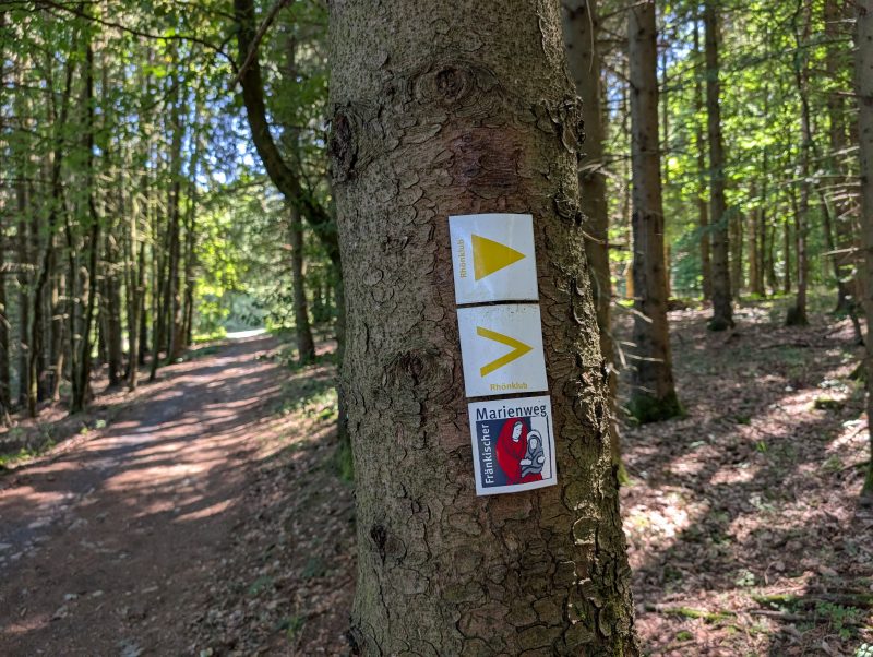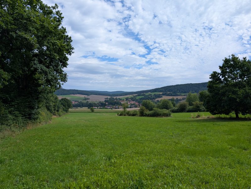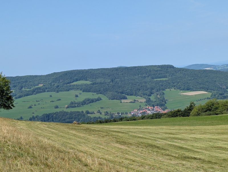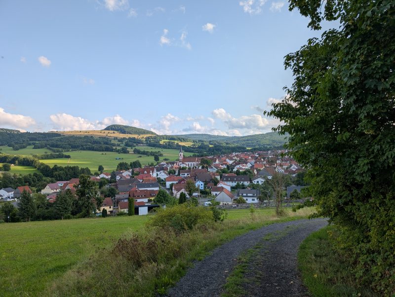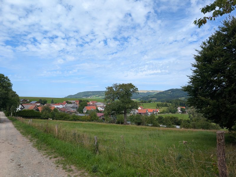Die Strecke führt von Osten zu dem in Schlüchtern startenden Eselsweg hin, erreicht ihn aber noch nicht. Der Blick geht noch zurück auf die Kegel der hessischen Rhön und voraus auf den Höhenzug des Vogelsberges. Auch ein paar kleine Dörfer wegen durchquert.