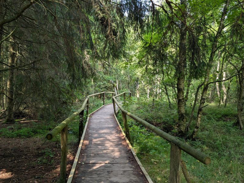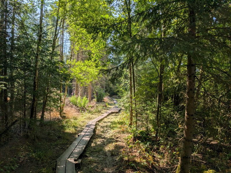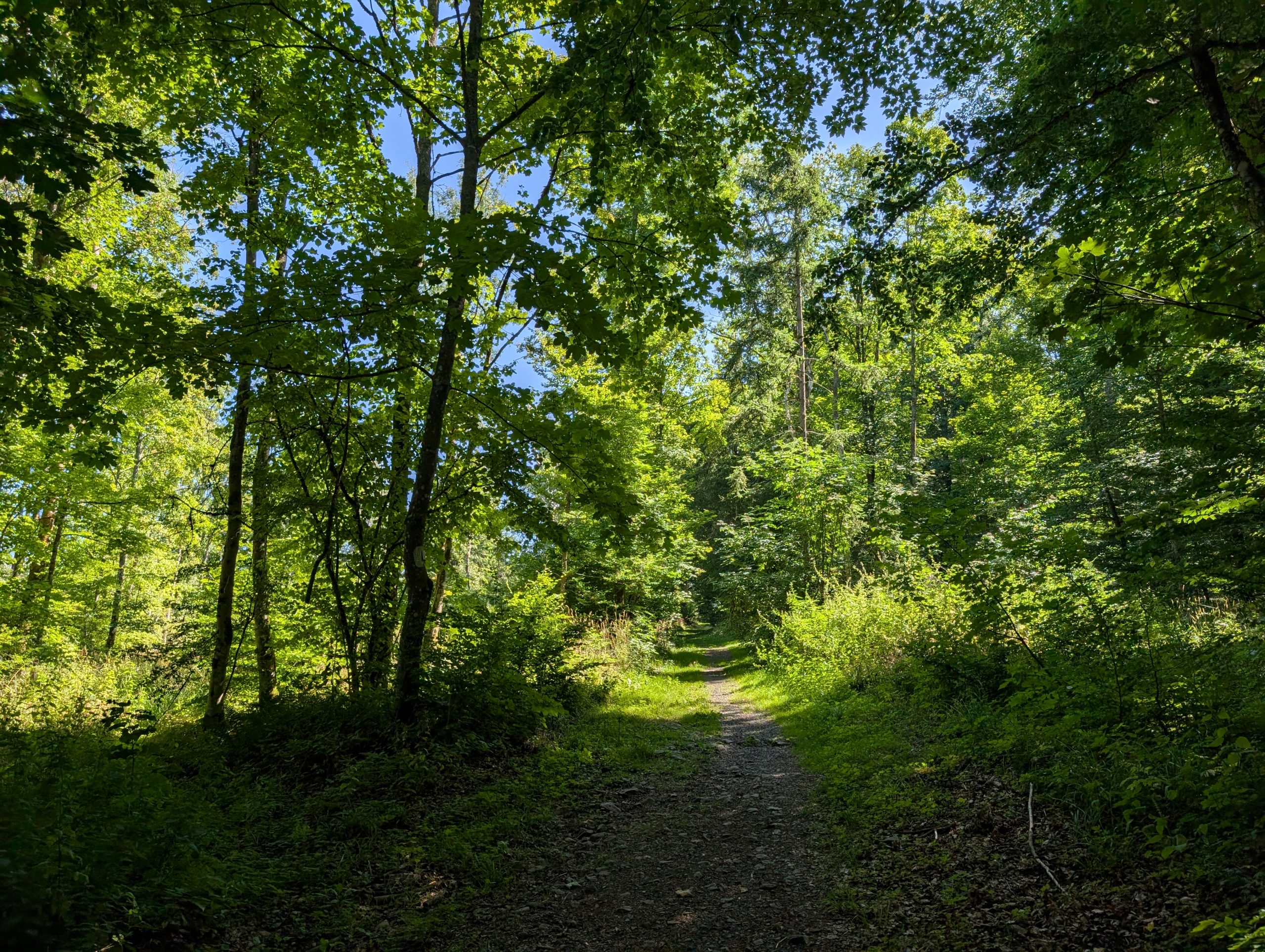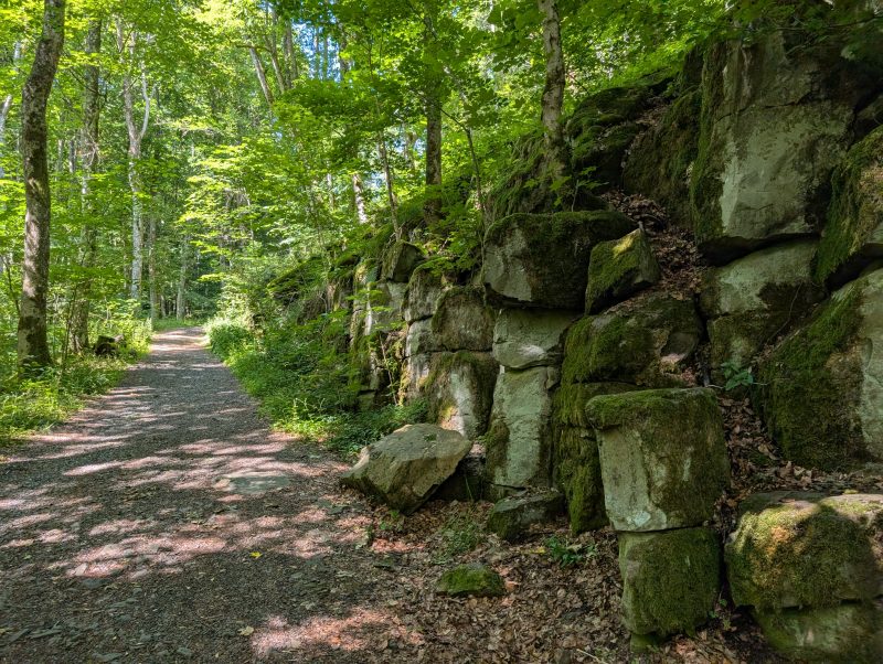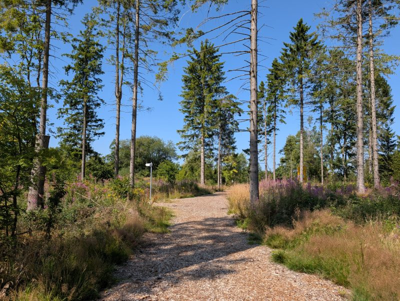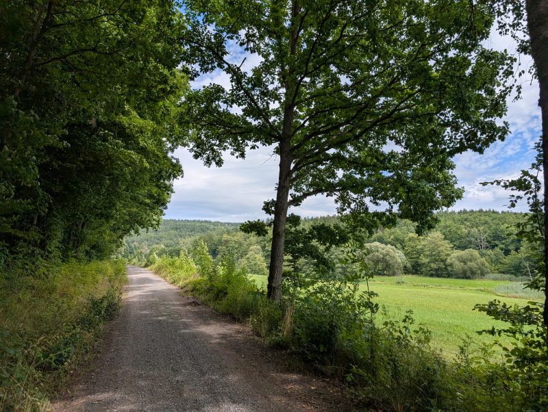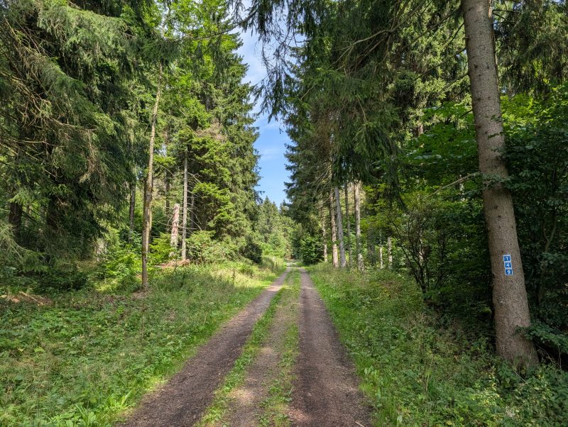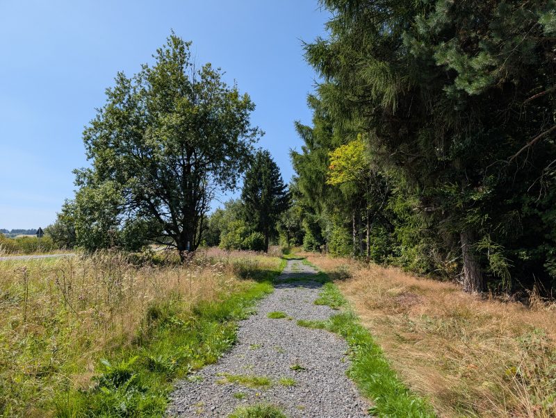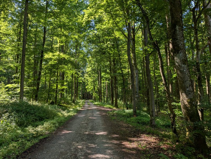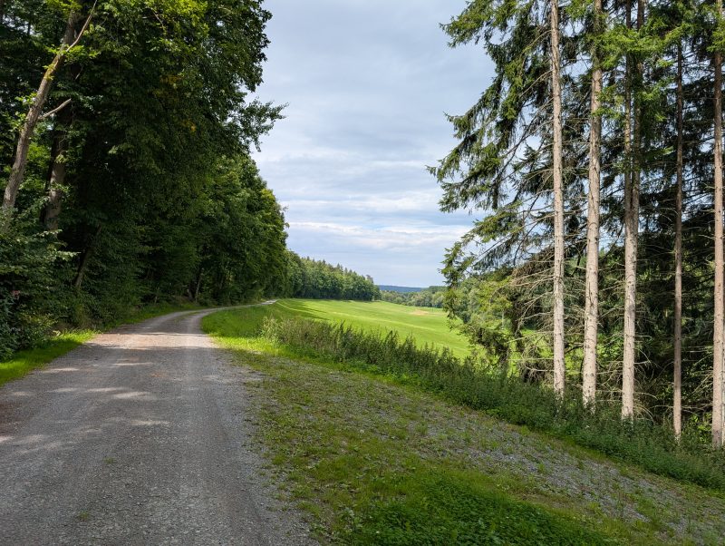 Der Radweg hat heute wieder ordentliche 450 Höhenmeter und schlängelt sich eher breit und schotterig durch den Forst.