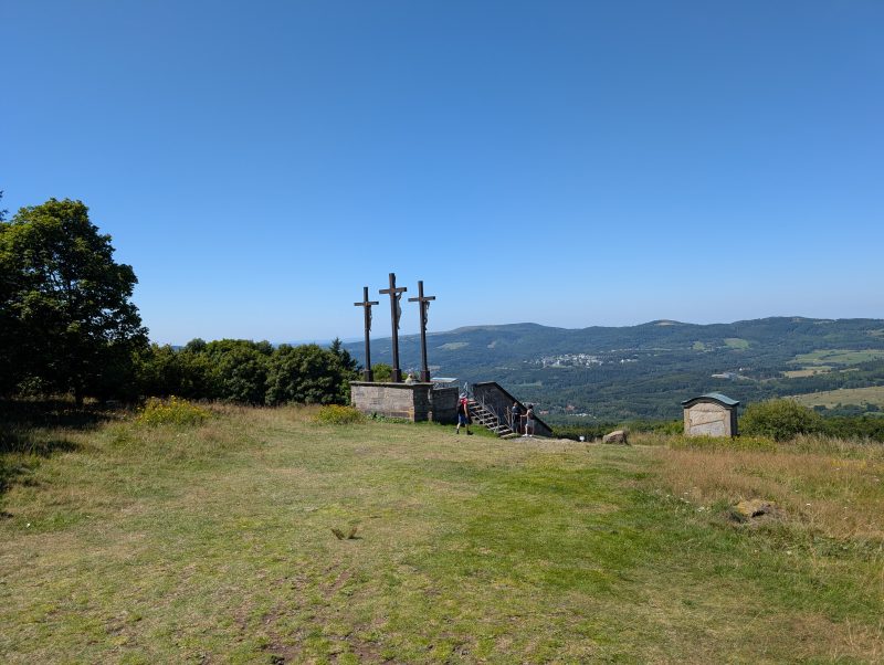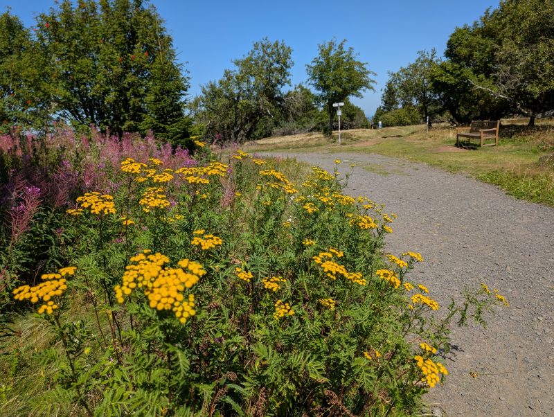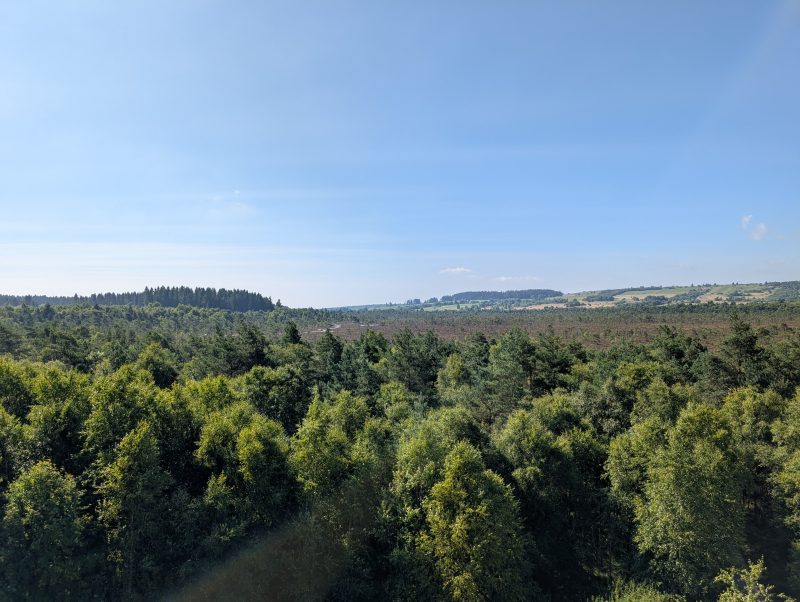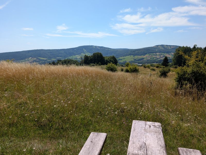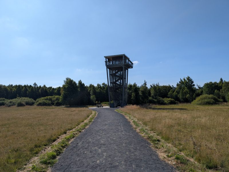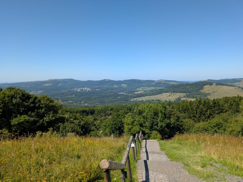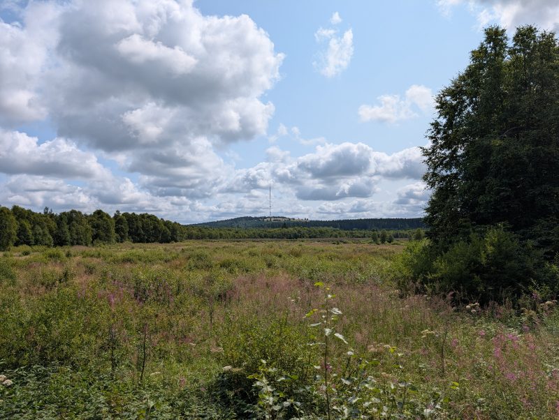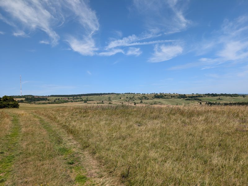 Hier hätte ich besser die Füsse kühlen sollen, denn bis Kilometer 11 geht es weiter bergauf. Das Knüllköpfchen ist mit 634 Meter nur minimal kleiner gewachsen als der Eisenberg. Daher gibt es auch hier einen Guckturm und einen Sendeturm.