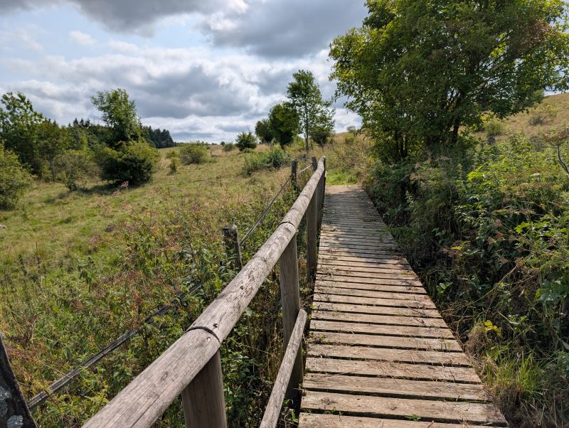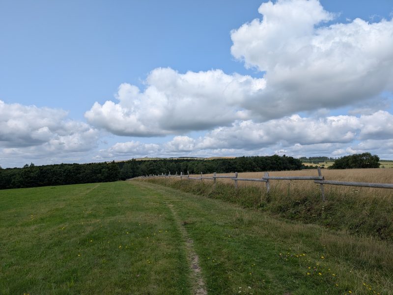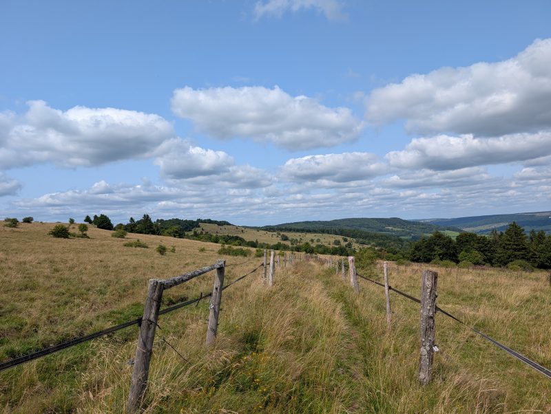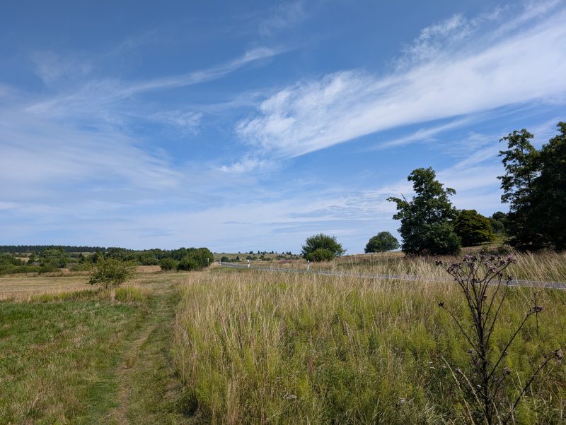 Auf der anderen Talseite schlängeln sich die Wanderwege zwischen Truppenübungsgeländen und Hügelkuppen dahin. Für ein paar Kilometer müssen auch Landstraßen begangen werden. Die Routenplanung mit Outdooractive hat lokale Rund und vorhandene Fernwanderwege genutzt, die zwei auf Google Maps verifizierte Parkplätze miteinander verbinden.