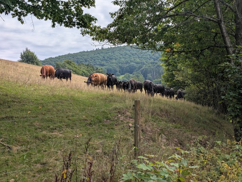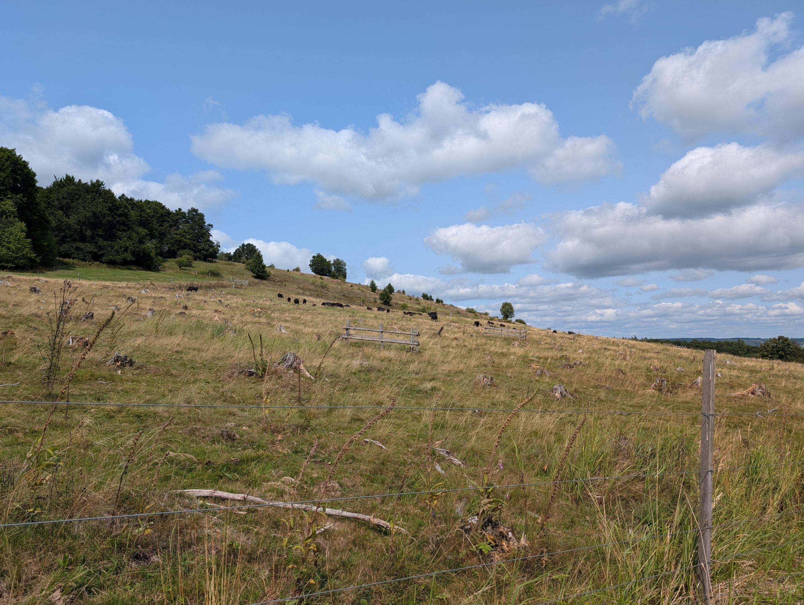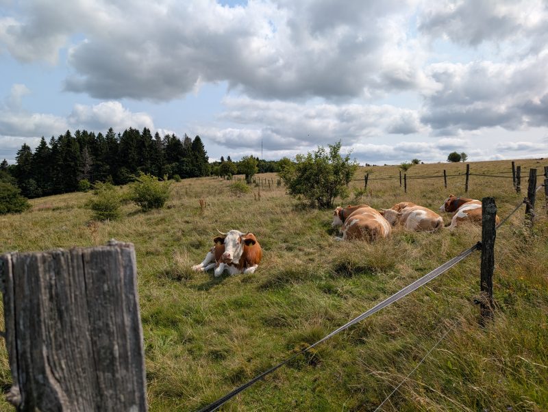 Am dritten Tag steht die erste Etappe an, die komplett auf dem Eselseg verläuft. Also der Rückweg, der Hinweg beginnt wieder mit dem Rad vom Parkplatz am Sportplatz. Das Wetter bleibt noch warm und trocken, im Auto ist es in der Nacht eher zu warm für den Schlafsack. Mangels Bildern mit Eseln hier die eher verfügbaren Weiderinder.