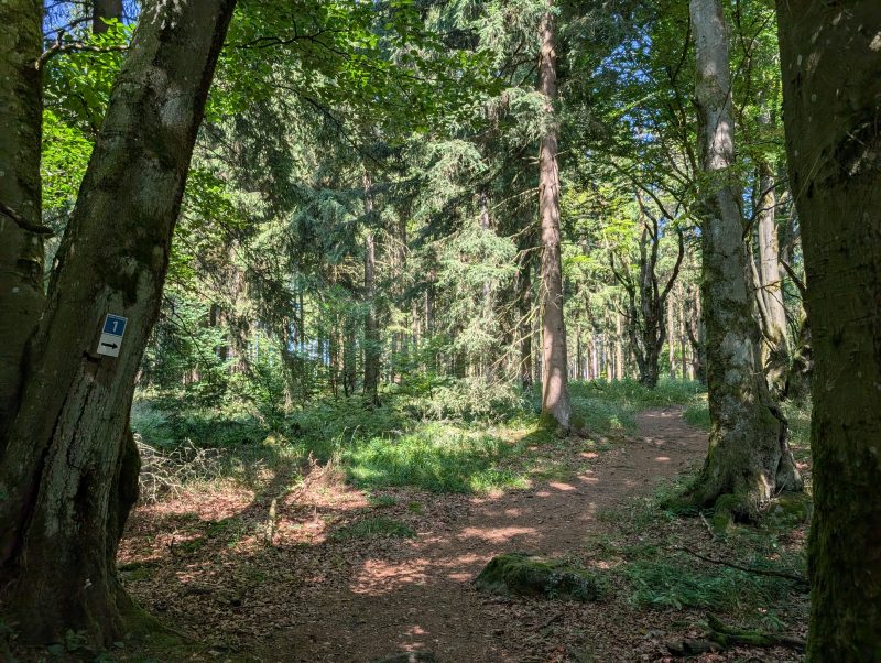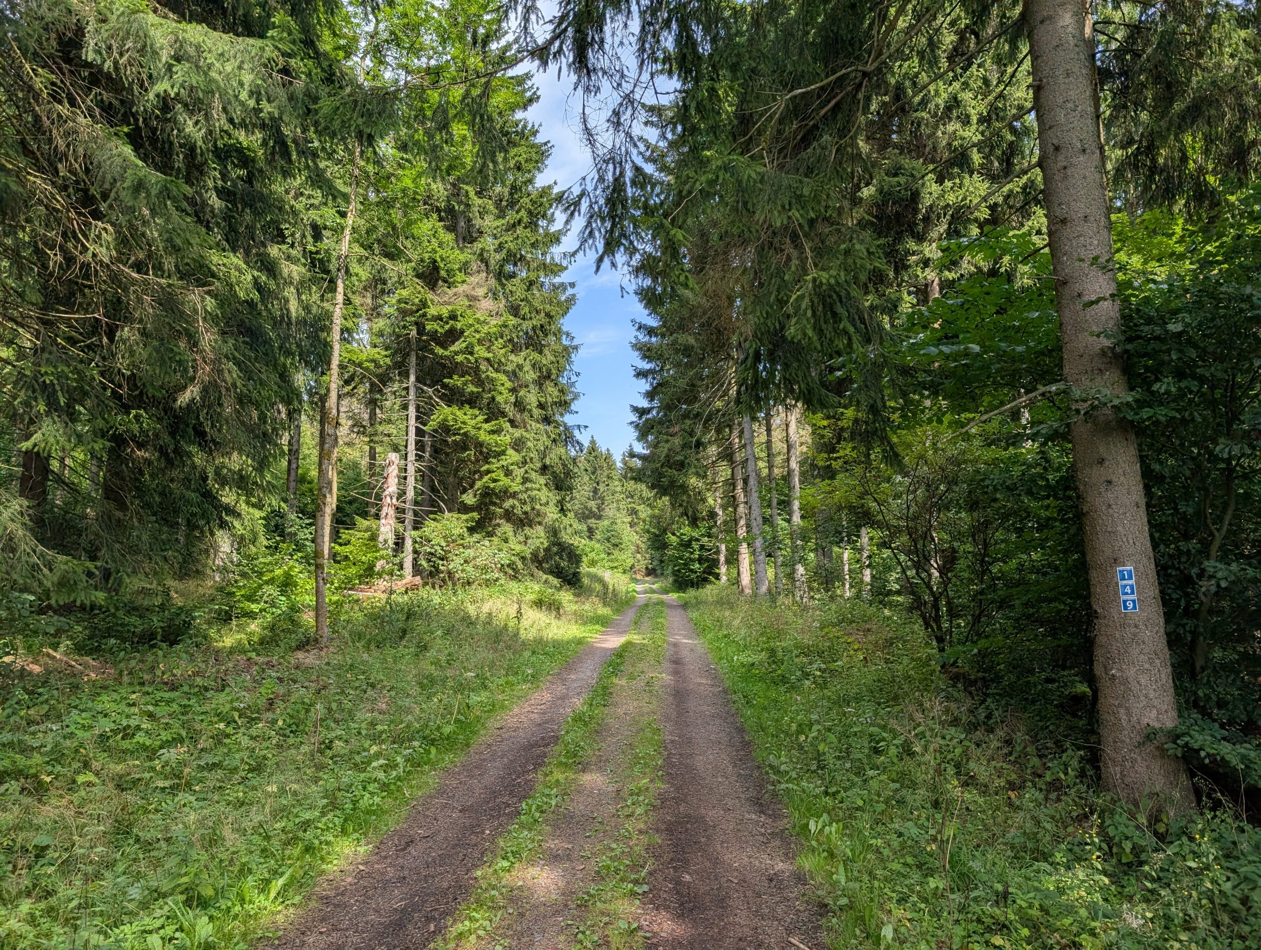 Die Wege sind teils breit geschottert, teils schmal und pfadig. Gut zu gehen und leicht wellig. Die Zehen schmerzen daher nicht so sehr, vielleicht auch weil ich jetzt eher Wanderschuh ähnliches Material an den Füßen habe. Fichten wechseln mit Buchen und Mischbeständen.