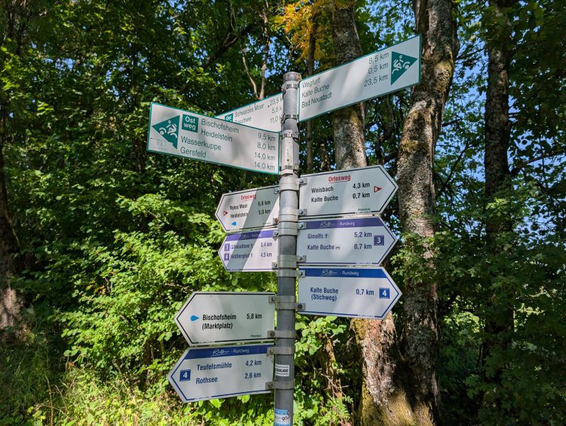 In der Beschreibung zum Eselsweg sind es 6 Etappen mit 110 Kilometern und 3609 Höhenmetern. In der Umsetzung waren es mit dem Rad 130 Kilometer mit 2530 Höhenmetern und zu Fuß 116 Kilometer und 2340 Höhenmeter. Die Garmin Daten sind bezüglich der Höhenmeter bei 2558. Die 3609 Höhenmeter auf der Seite von Wanderbares Deutschland erscheint mir überschätzt. Die Strecke beginnt nicht in Schlüchtern, denn quasi vom Rhön Campingurlaub in Hünfeld kommend und der noch nicht absolvierten Rhöndurchquerung anschliessend geht es am ersten Tag ab Motten am Südrand der Rhön auf eigener Strecke auf den Eselsweg zu, der auf der zweiten Etappe erreicht und dem ab dann gefolgt wird.