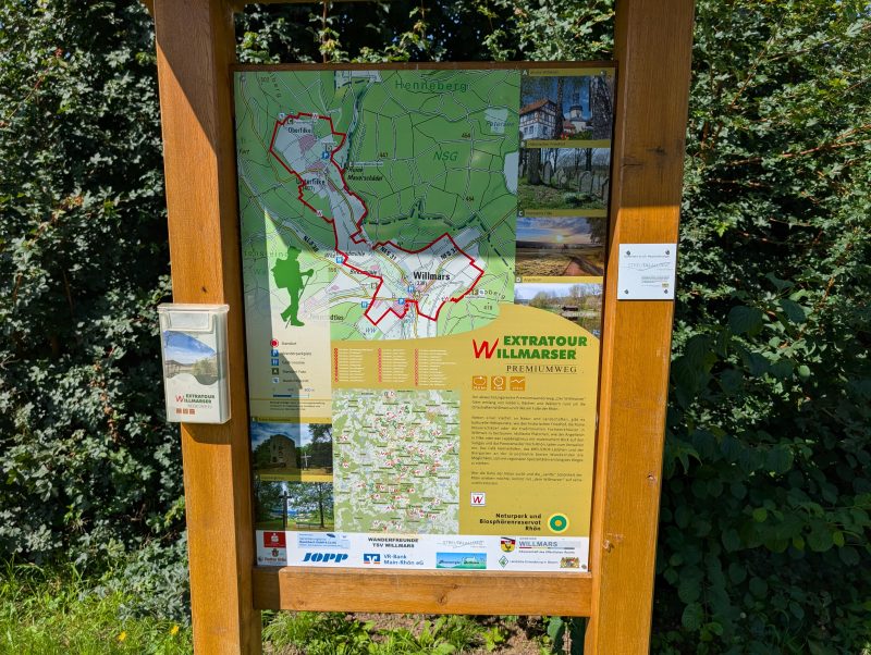Wir wandern vom Wanderparkplatz in Willmars aus. Von diesem Punkt aus startet auch die “Extratour Willmarser”, der wir allerdings nur zu Beginn der Wanderung folgen. Wir biegen am Wald ab und folgen dem Europäischen Fernwanderwegen 3 bis zur Burg Lichtenberg. Leider finden im Sommer 2025 umfangreiche Baumaßnahmen sowohl auf der Zufahrt zur Burg als auch im Gaststättenbereich statt, so dass eine Bessichtigung der Burg nicht möglich und sogar der weitere Wanderweg von der Burg hinab gesperrt ist. Über einen kleinen Umweg können wir dann aber unseren E 3 Weg weiter folgen. Kurz vor dem Sulzbachtal bringt uns der Radweg nach Willmars zurück zum Wanderparkplatz.