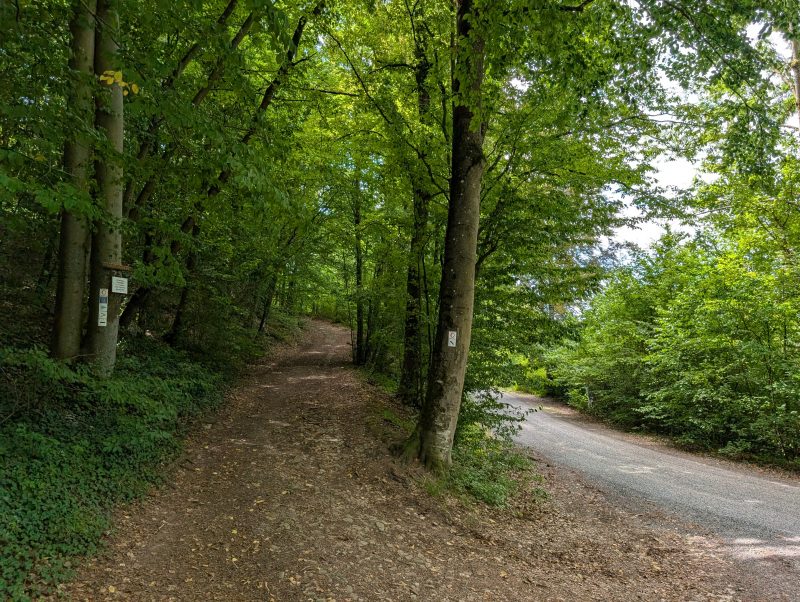 Der Eselsweg geht direkt am Radparkplatz vorbei, am Anfang noch idyllisch durch Buchenniederwald und hält sich östlich vom Hinweg und spart damit ein paar Höhenmeter.