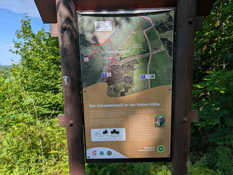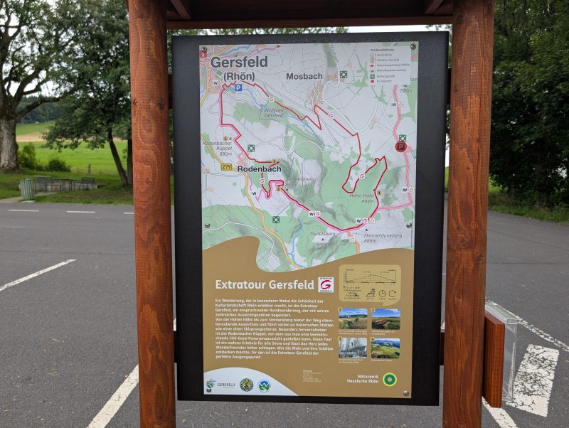 Vom Wanderparkplatz Schwedenwall aus startet die “Extratour Gersfeld”, der wir auch zum größen Teil folgen. So geht es zuerst mit der Extratour den Berg hinauf und weiter bis nach Moosbach. Kurz hinter Moosbach verlassen wir die Extratour Gersfeld und folgen dem Röhnrundweg Nr. 4 und lassen damit den Rodenbacher Kuppel (680hm) aus. Wir wandern mit dem Rundwanderweg bis Rodenbach und treffen dort wieder auf die Extratour. Nun geht es hinauf zum Simmelsberg (842 hm) mit traumhaften Aussichten und wunderschönen Bergwiesen. Weiter hinauf zum “Himmeldunkberg” (888 hm). Hier haben wir die meisten Höhenmeter geschafft. Allerdings folgt noch ein kurzer Anstieg zur “Hohe Hölle” (894 hm). Danach geht es steil hinab bis wir wieder am Wanderplarkplatz ankommen.