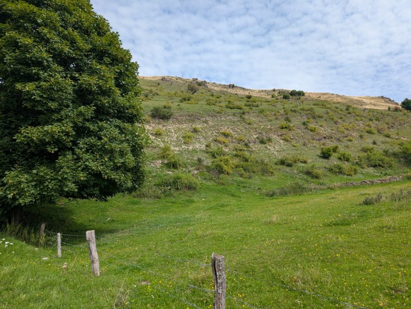 Der Weg ins Tal der Geis wird mit Aussicht belohnt. Die Hänge werden als Mähwiesen genutzt und unten ist man nur noch 400 Meter hoch.