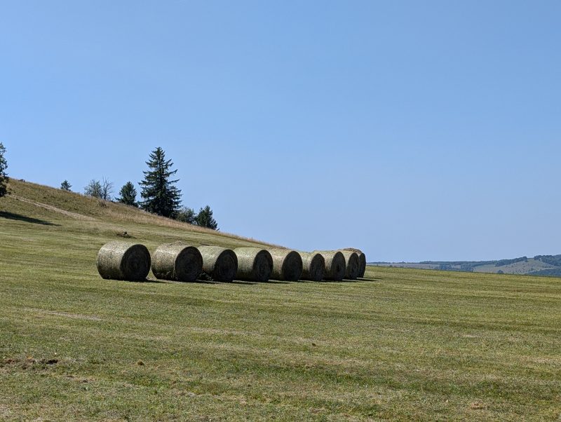 Unterwegs alte einsame Höfe mit sich langweilenden Mähmaschinen. Jedenfalls schienen sie an vorbeiziehenden Wanderern nicht interessiert.