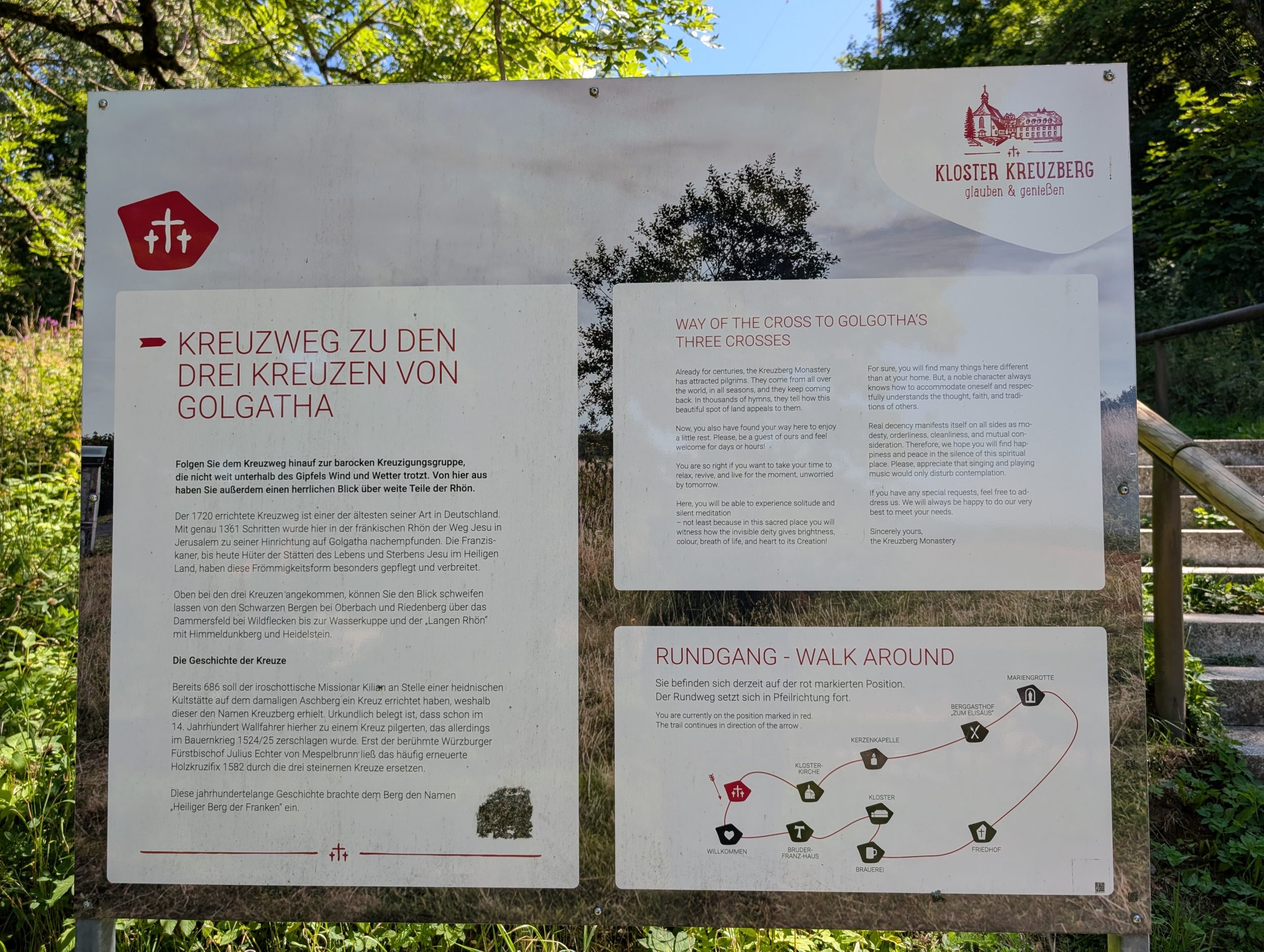 Diese Wanderung startet am Wanderparkplatz bei Oberwildflecken. Zuerst folgen wir dem Rhönrundweg Nr. 1, der uns hinauf in den Wald führt. Nach ca. 3 Kilometer stoßen wir im Wald an einer Kreuzung auf den Fränkischen Marienweg, der uns weiter hinauf zum Kloster Kreuzberg bringt. Von hier aus steigen wir weiter über den Kreuzweg hinauf zum Kreuzberg (928 hm) und genießen die phantastische Aussicht. Mit der “Extratour Kreuzberg” geht es hinunter zur Bergwacht und weiter bis zu den Parplätzen am Kloster. Hier folgen wir zuerst dem Hochröhner, biegen dann aber ab und wandern mit dem Wanderweg Oberwildflecken den Berg hinunter bis zum Wanderparkplatz.