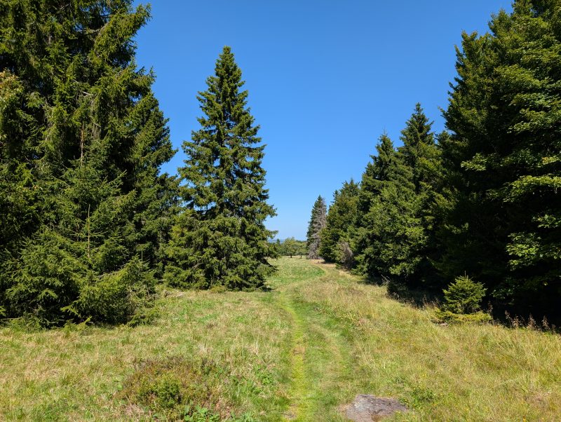 Die verringern dann auf dem Anstieg aus dem Jossatal hoch zum Markrberg entsprechend die Durchschnittsgeschwindigtkeit auf 5,5 km/h. Ja, auf dem Rad. Ich bin ja nicht auf der Flucht. Wobei die Fichten hier den Eindruck erwecken, sie wären auf der Flucht vor dem Borkenkäfer