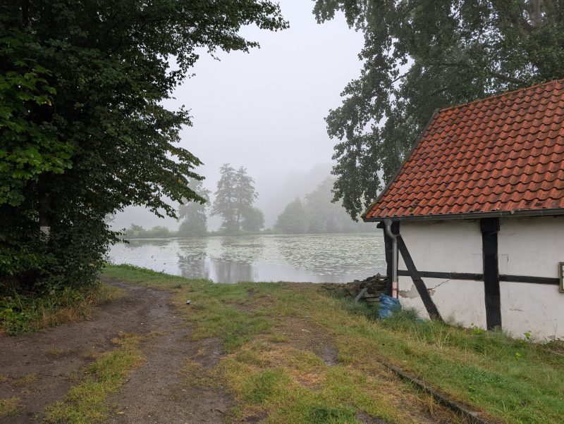 Nach der ungewohnten Aufwachphase mit Dachbettkrabbelei und Kramtüten ist der Bäckerlaufstart leicht verspätet. Es ist klar und bald auch sonnig mit Nebelfetzen über den Wiesen. Die Lauftemperatur liegt bei acht Grad und ist an der unteren T-Shirt mit Weste Grenze. Die Runde am Seeufer auf dem Deichpfad und der Rückweg auf geteertem Wirtschaftsweg ist auch wegen des flachen Geländes ein Laufgenuss.