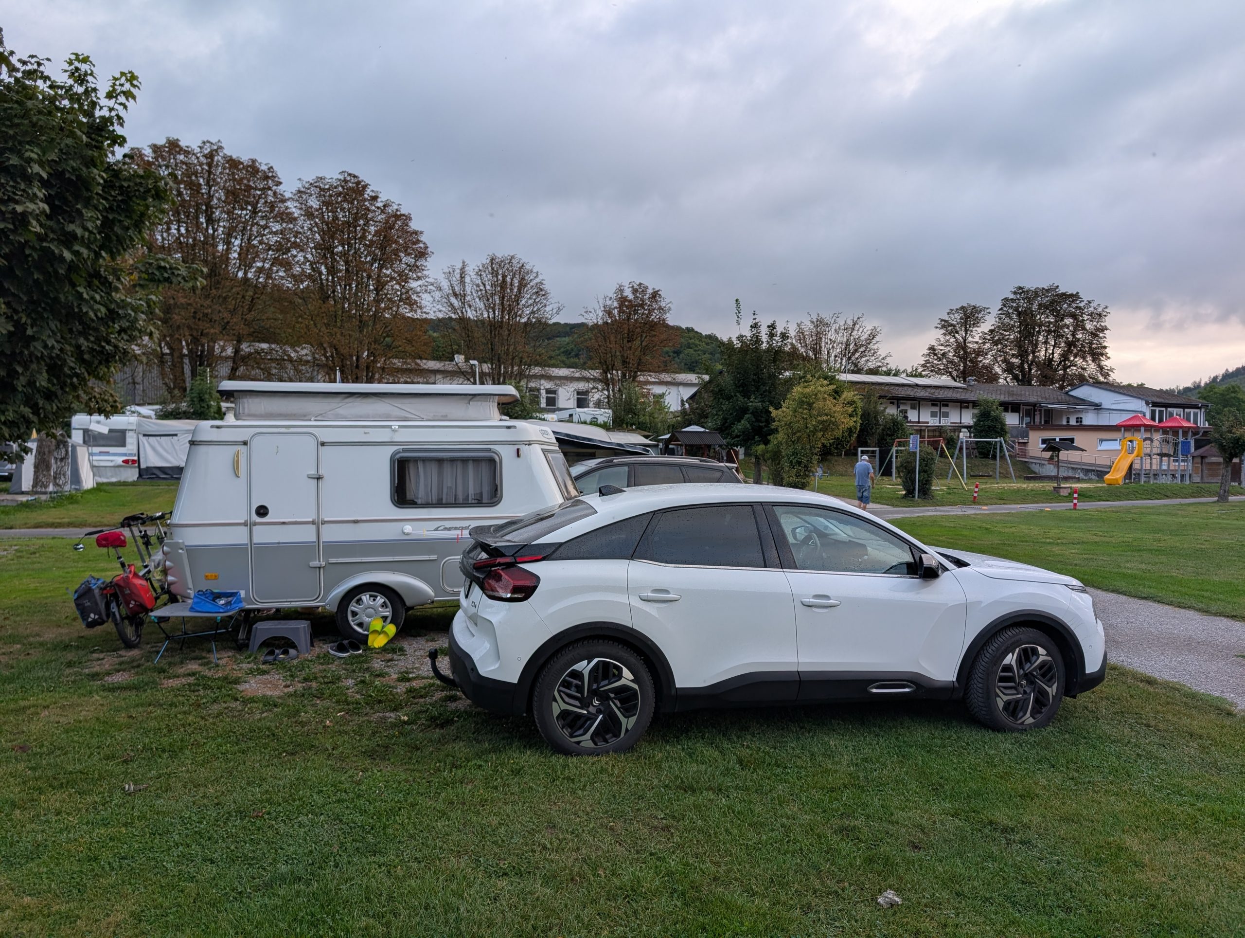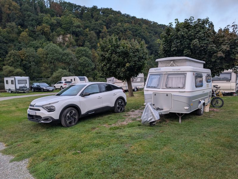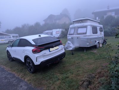 Obwohl wir so gerne mit unserem kleinen Eriba Puck unterwegs sind, wollen wir doch einmal herausfinden, ob ein Ford Nugget mit Hubdach auch eine Möglichkeit bietet, länger unterwegs zu sein mit häufigeren Campingplatzwecheln. Vor allem bleibt die Frage, bietet der Ford auch mehr Komfort als unser Nissan Evailia mit Vorzelt. Somit müssen wir einfach einmal ein entsprechendes Auto mieten. Aber schon das Einräumen erweist sich als überaus schwierig, es gibt so wenig Möglichkeiten die Kleidung und das sonstige Equipment zu verstauen. Wir entschließen uns daher auch erst einmal auf das Tandem und die dazugehörigen Taschen einschließlich Fahrradkleidung zu verzichten. Und dann geht es los zu unserem ersten Campingplatz.