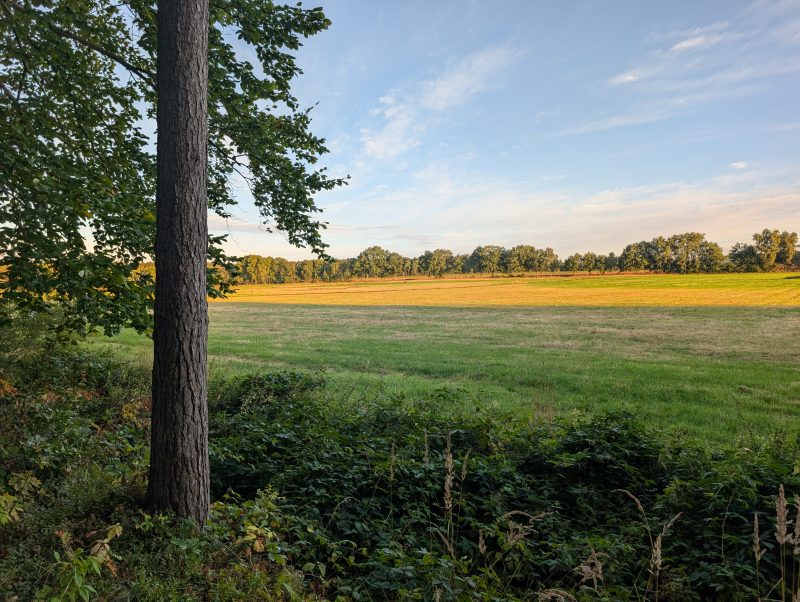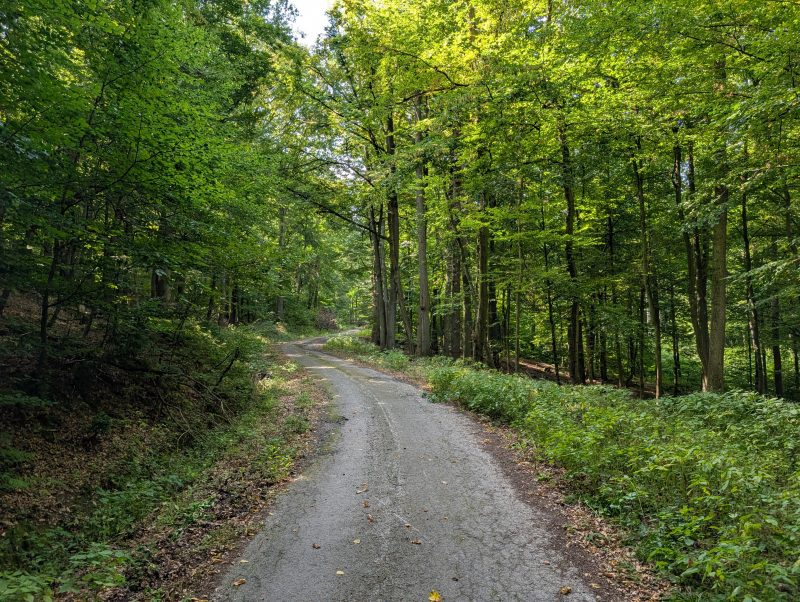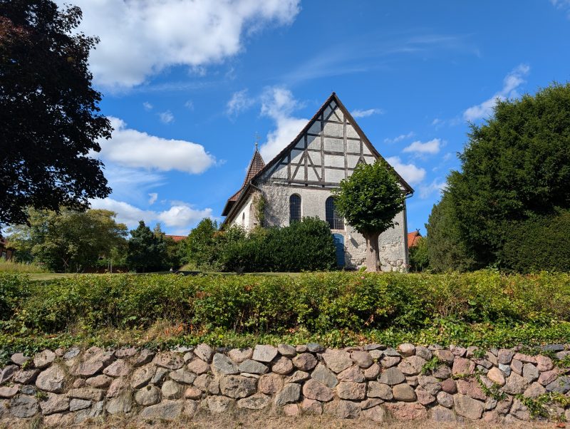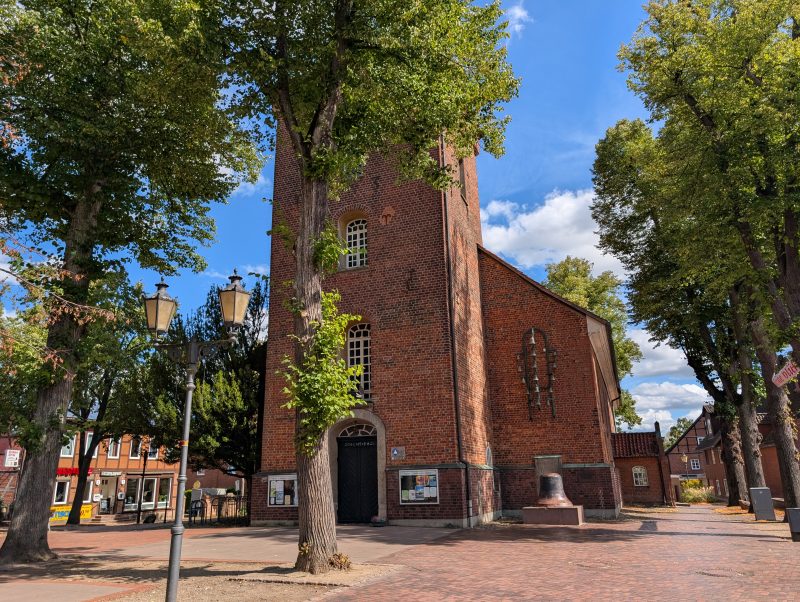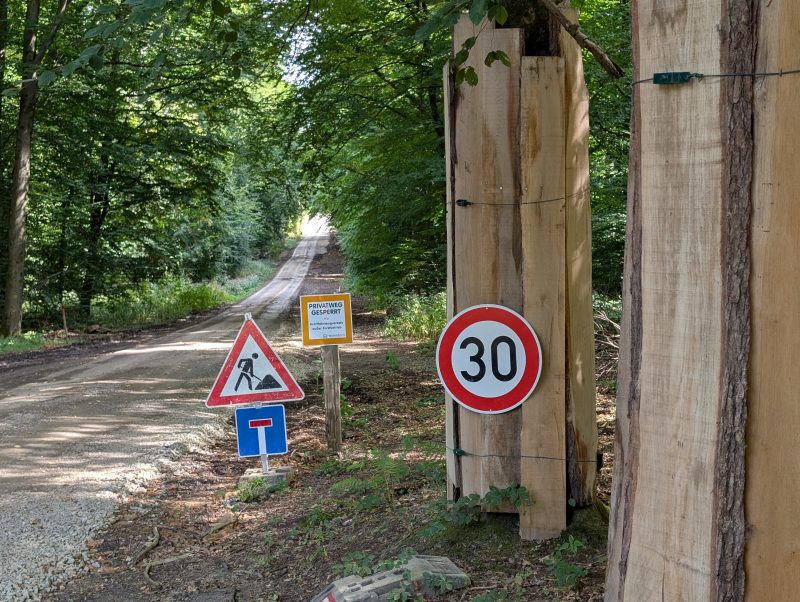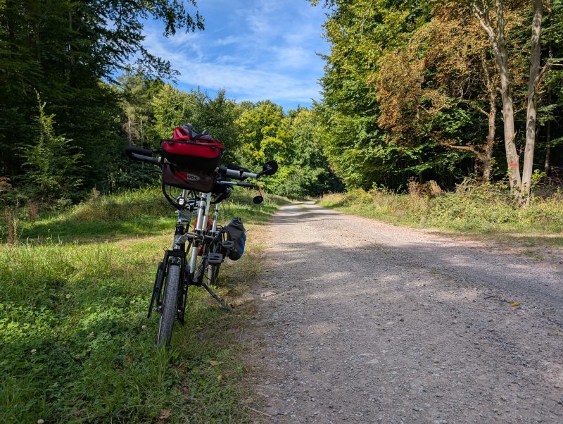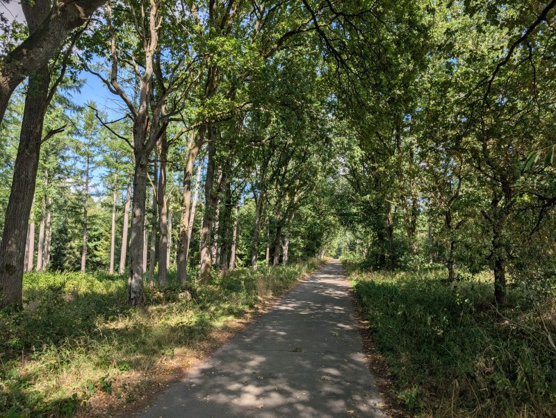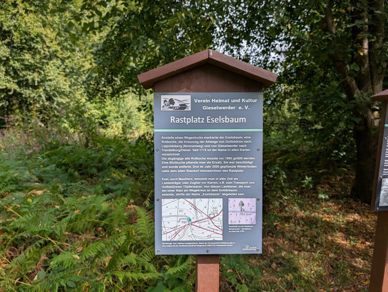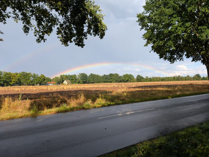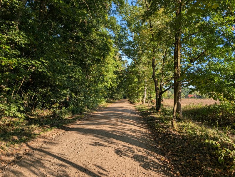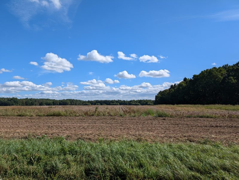 Auf der Fahrt von Burhave zum nächsten Campingplatz halten wir in Drangstedt. Von einem Waldparkplatz aus gibt es eine ruhig Wanderung. Es geht durch ein größeres Waldgebiet, entlang vieler Maisfelder und auch an einem Ruhewald vorbei.