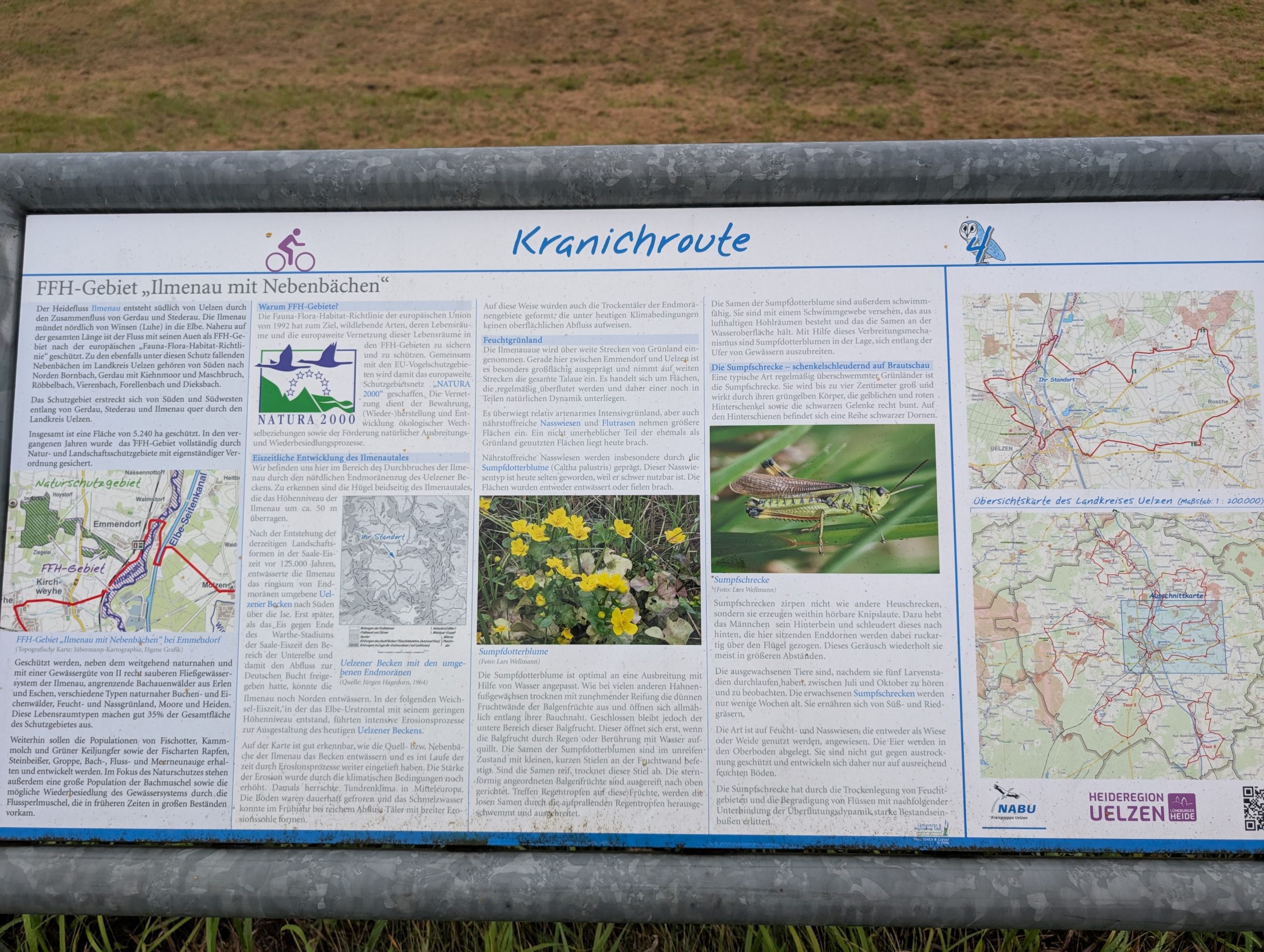 Wir fahren vom Campingplatz zuerst durch den Uelzener Stadtforst am Buchenberg und Wildgehege vorbei bis Uelzen. Nach einer kurzen Stadtbesichtigung geht es entlang der Illmenau und durch ein Industriegebiet bis zum Elbe-Seiten-Kanal. Diesem folgen wir in nördlicher Richtung bis Emmendorf. Hier verlassen wir den Kanal und kehren über Emmendorf, Siedlung Reimer und Kirchweyhe wieder zurück zum Campingplatz.