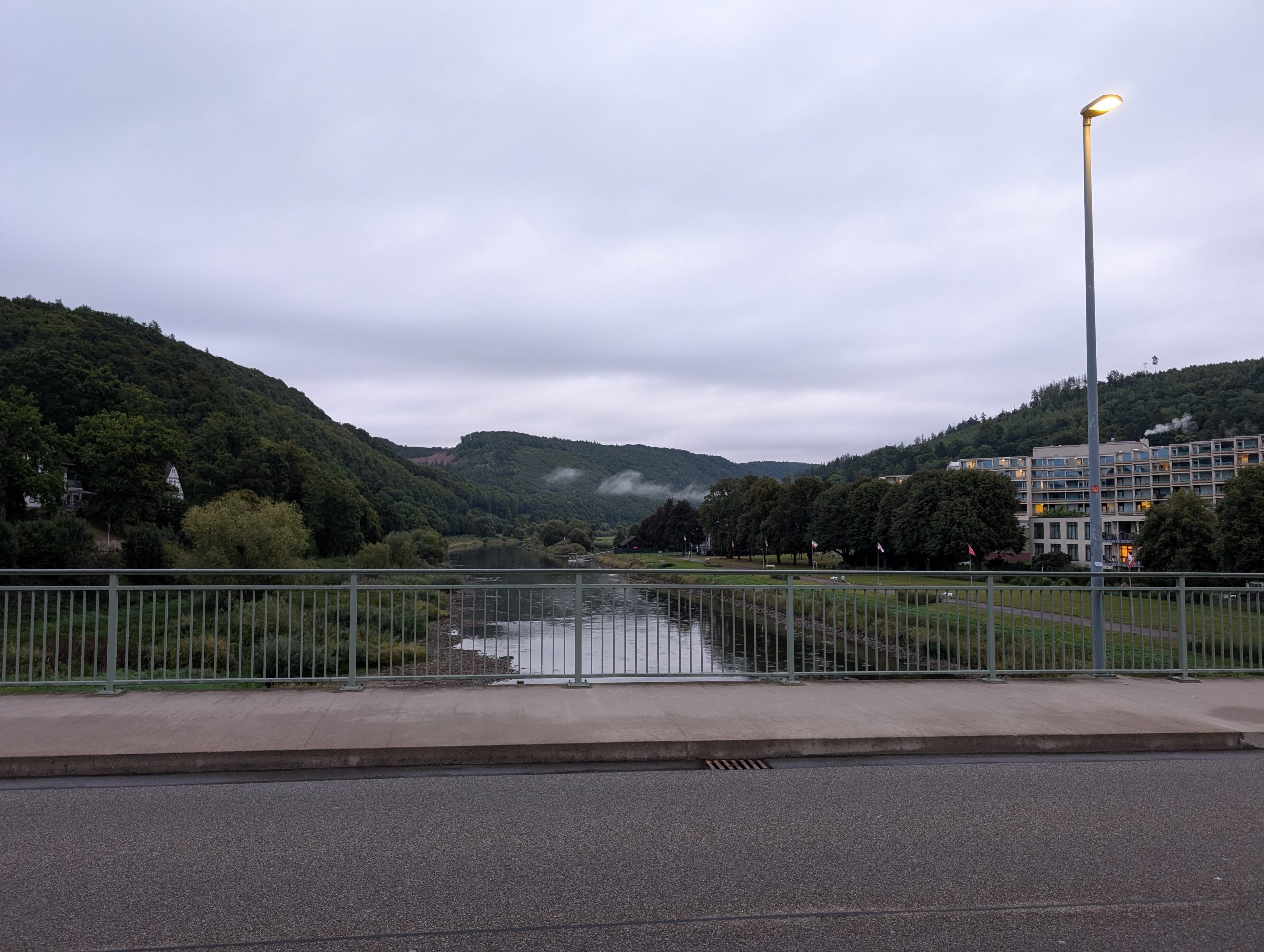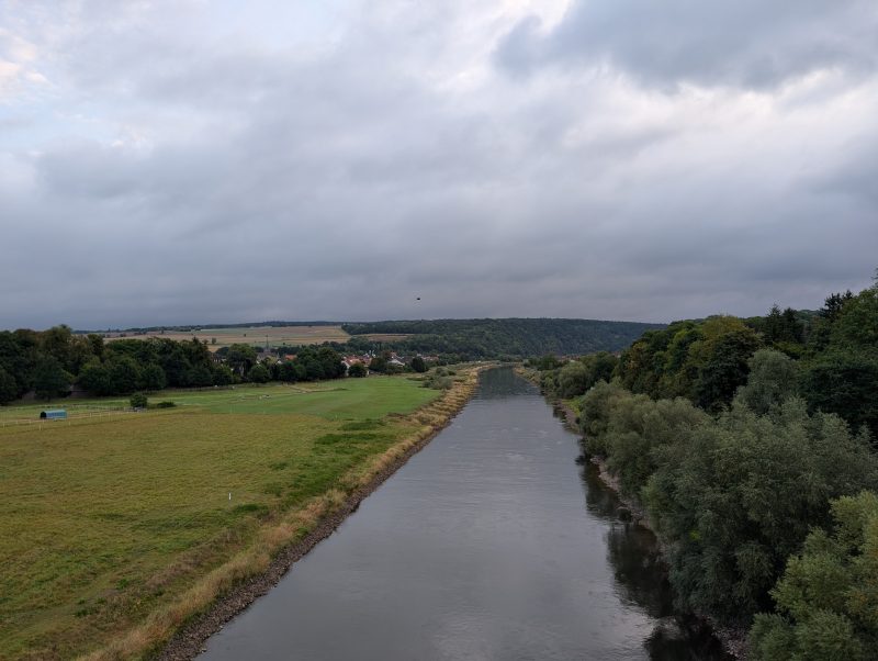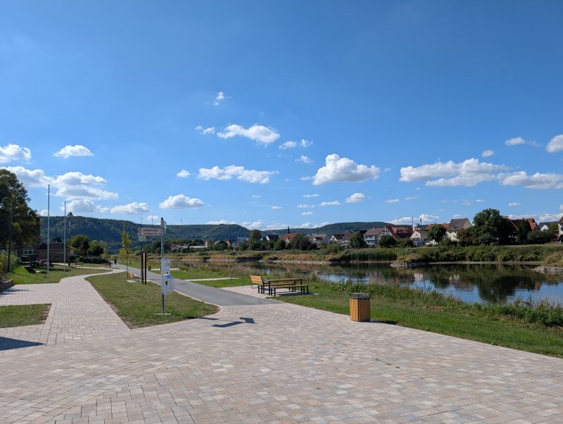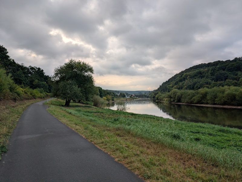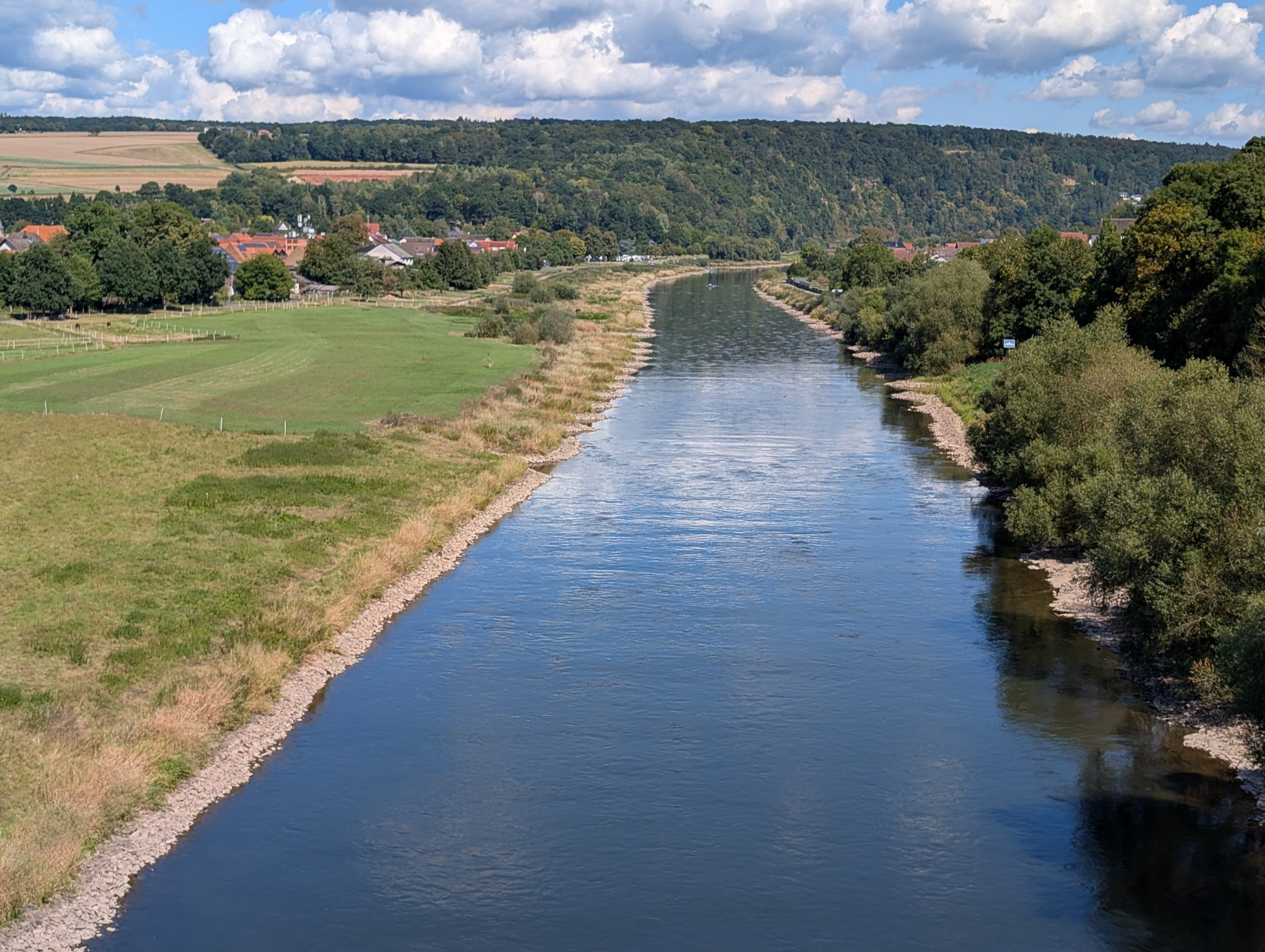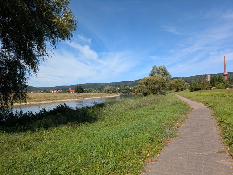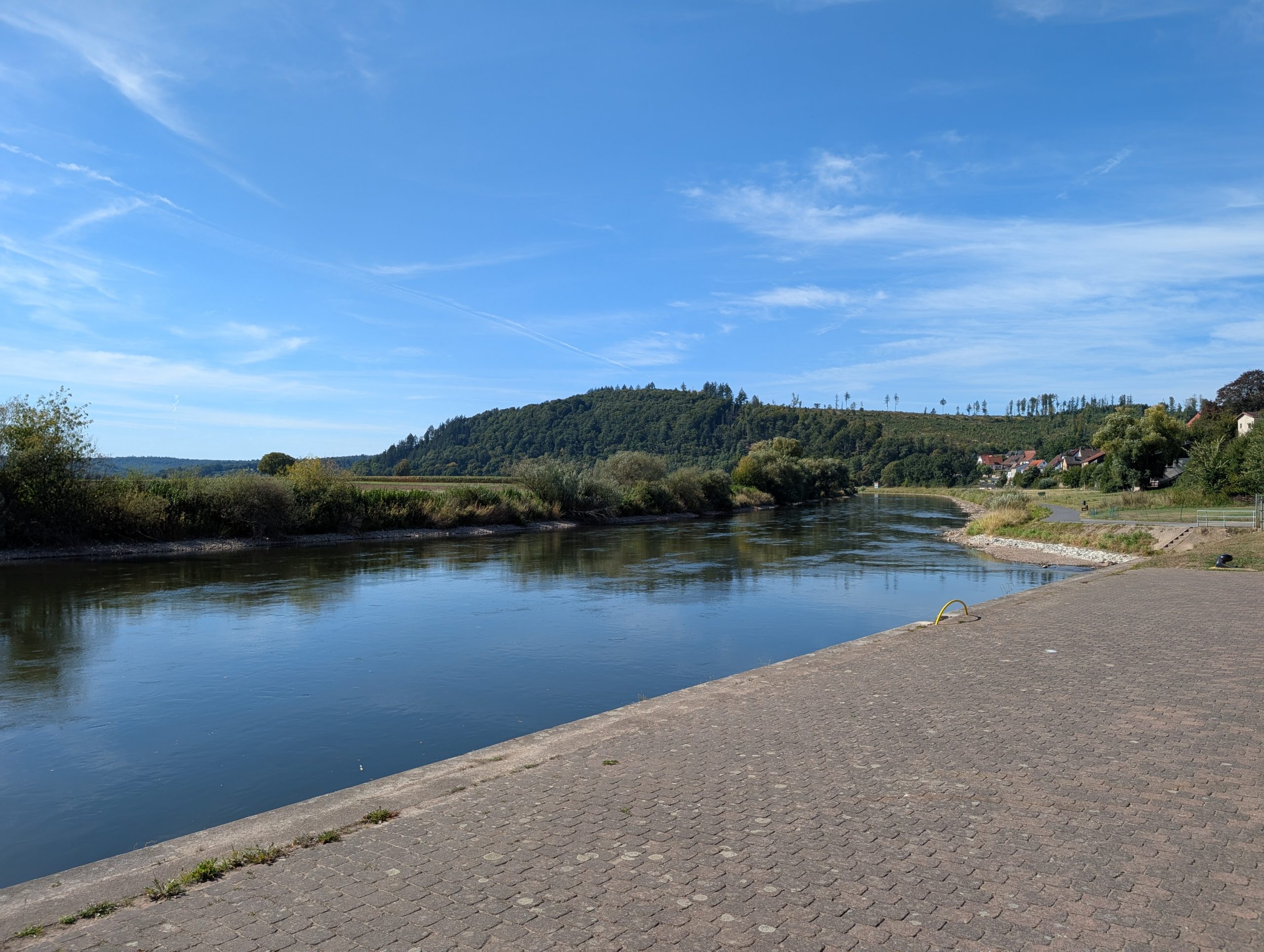 Der Bäcker nahe der Weserbrücke mit Blick auf den Campingplatz am Weserufer schnell erreicht. Als Laufrunde bietet sich dann erst der Radweg an der Bundesstraße 80 bis zur Weserbrücke L763 an. Der Rückweg am anderen Weserufer über den Weserradweg ist dann etwas kürzer. Bis auf den steilen Weg zur Weserbrücke ist die Strecke flach und eben, ideal für einen 10K Trainingslauf. Wenn ja nur die Beine in der früh nicht so müde und unwillig wären.