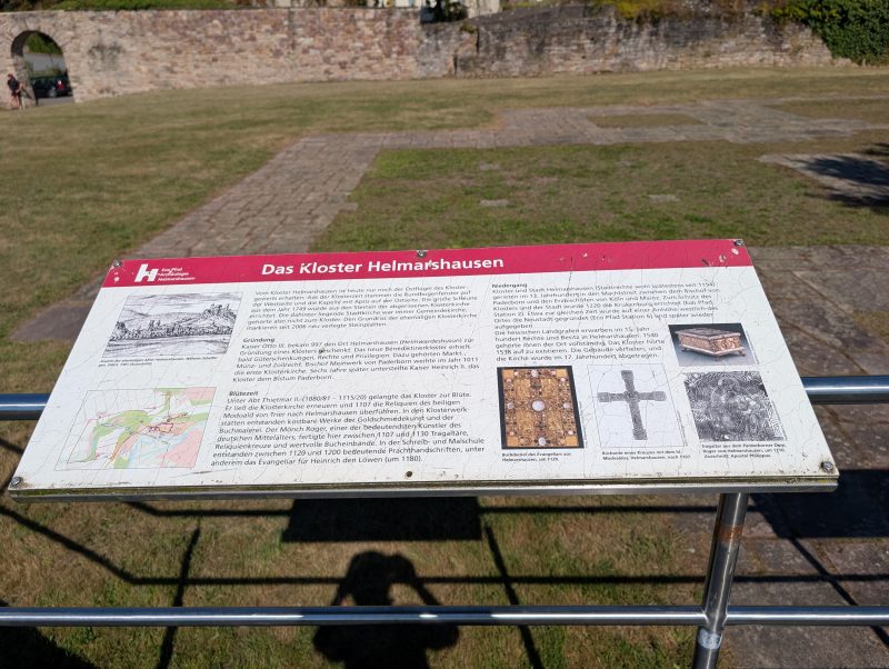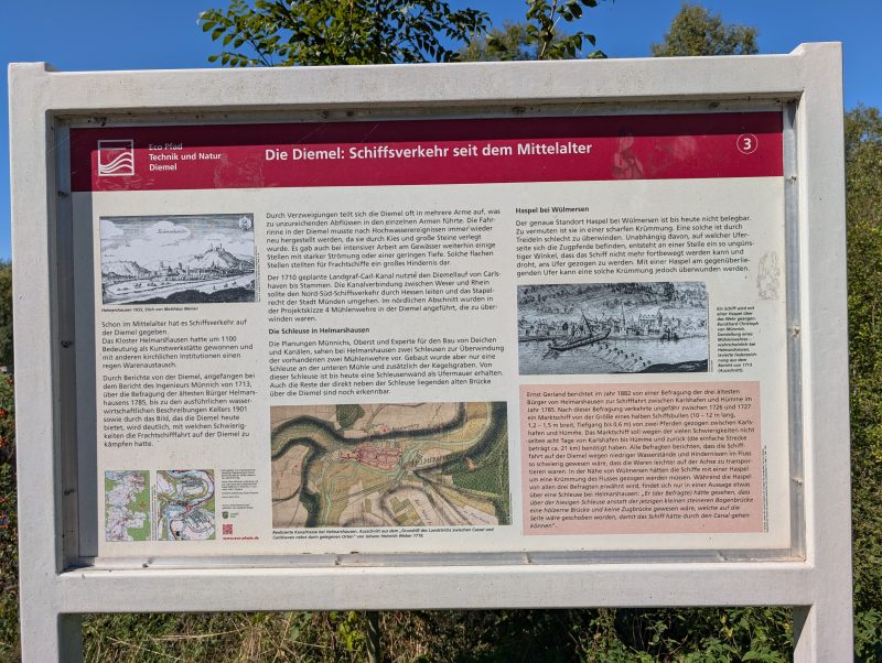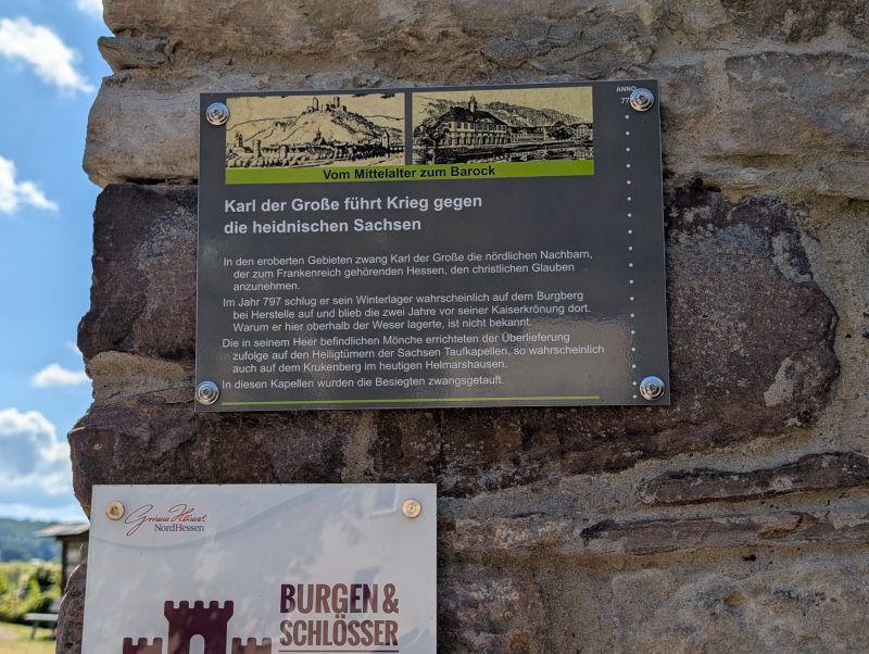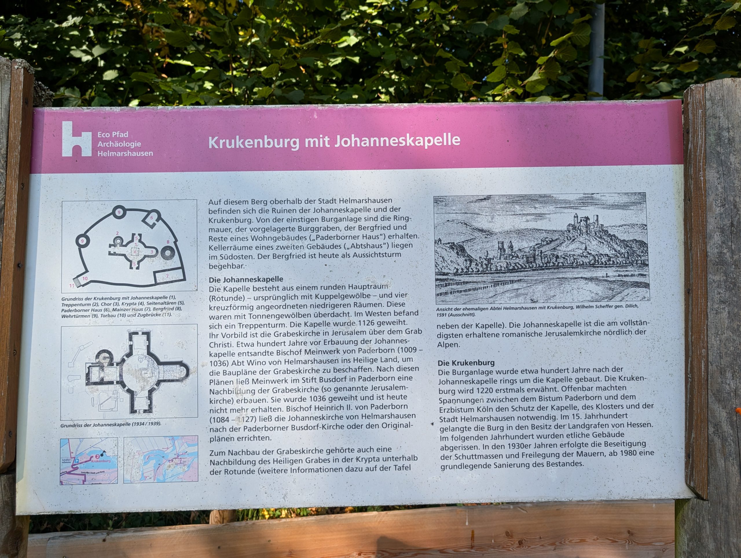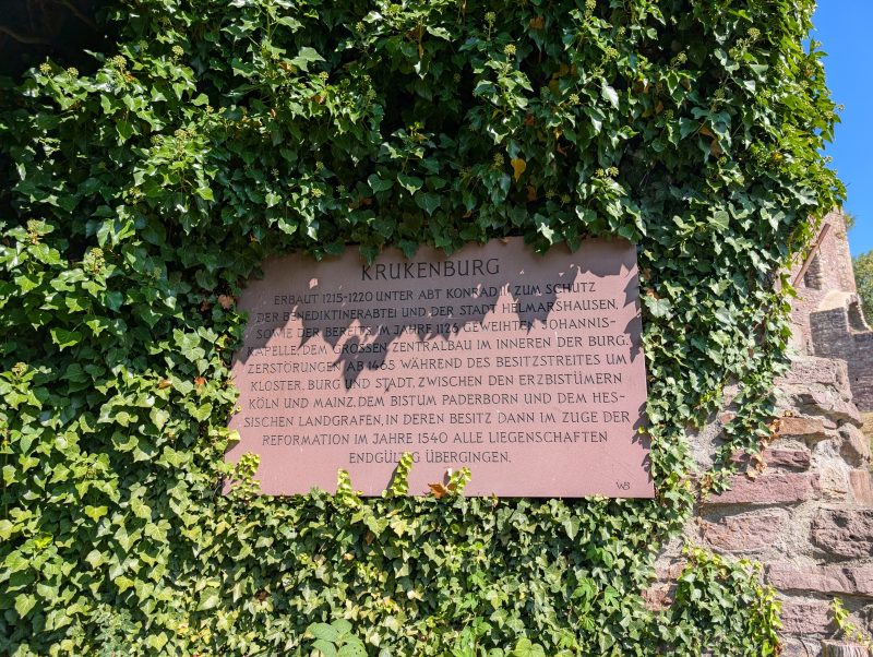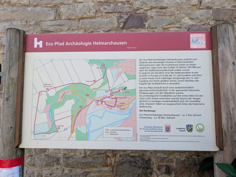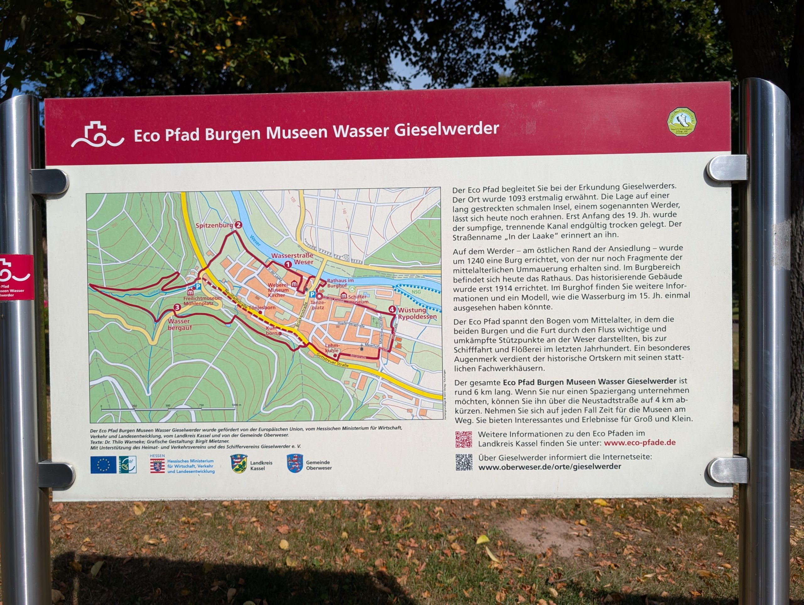 Vom Campingplatz aus fahren wir zuerst wieder in Richtung Bad Karlshafen, am Barockhafen und Invalidenhaus vorbei zum Diemel-Radweg. Mit dem Diemel-Radweg geht es weiter bis Helmarshausen und nach Überquerung der Diemel zum Kloster Bad Karslheifen Helmarshausen. Nach kurzer Besichtigung schieben wir das Tandem den Berg hinauf zur Krukenburg. Die Besichtigung dieser Anlage kostet einen kleinen Eintrittspreis, der aber auf jeden Fall lohnenswert ist. Nun führt uns der Weg über die Höhe am Lindenhof vorbei bis hinunter nach Herstelle. Hier kann man mit der Fähre auf die andere Uferseite der Weser gelangen. Wir aber fahren Weserabwärts bis zur nächsten Brücke bei Würgassen und dann über den Radweg zurück zum Campingplatz.