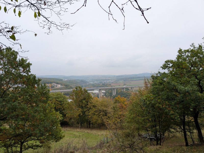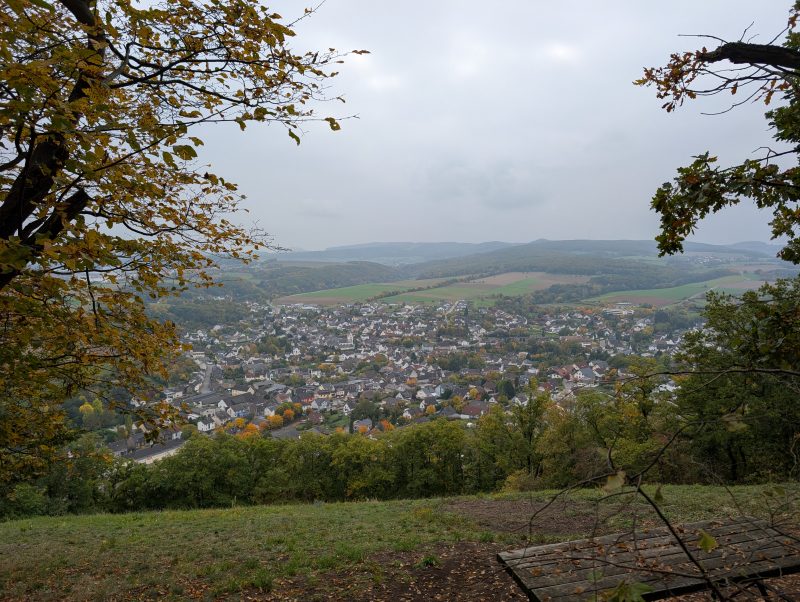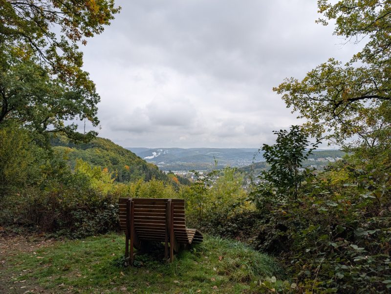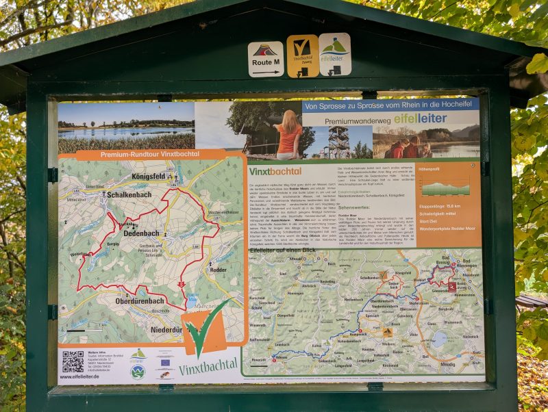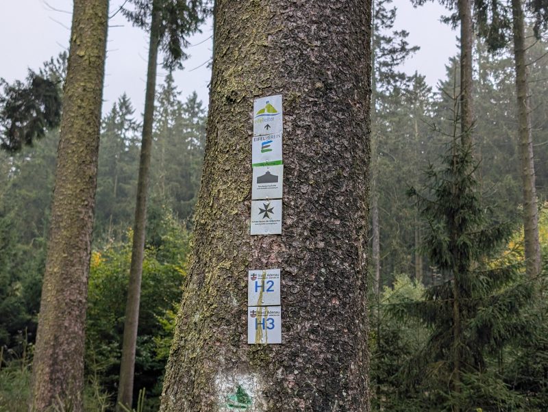 Die Eifelleiter ist ein naher Fernwanderweg mit übersichtlicher Länge. Da kann man gut alle Etappenabsolvierungsansätze ausprobieren, die so gerade einfallen. Mit Auto anfahren und ein Stück hin und wieder zurück laufen oder mit dem Rad fahren. Mit dem Auto übernachten und das Rad am Baum anbinden. Mit dem Auto anfahren und mit ÖPNV zum Etappenstart.