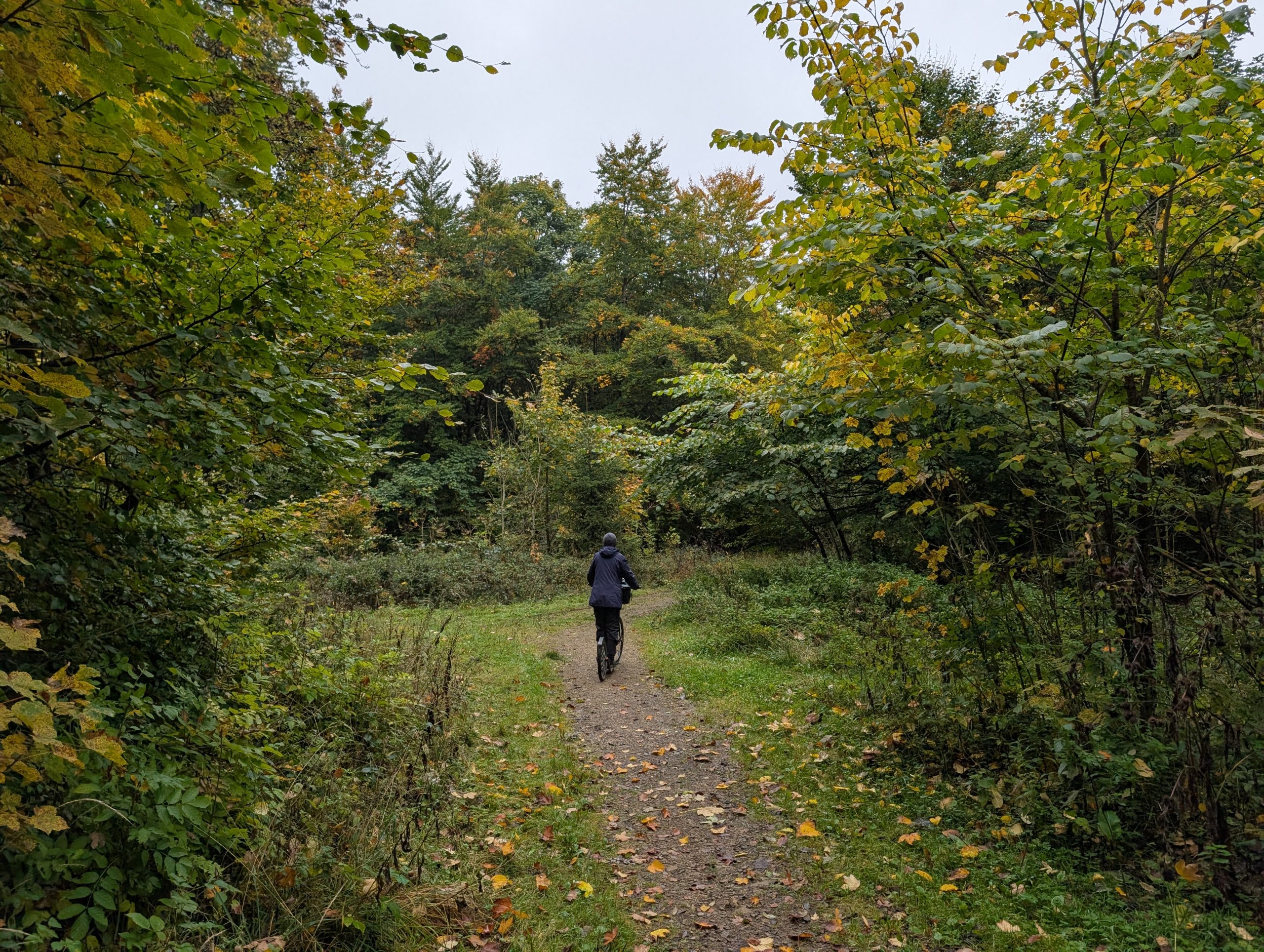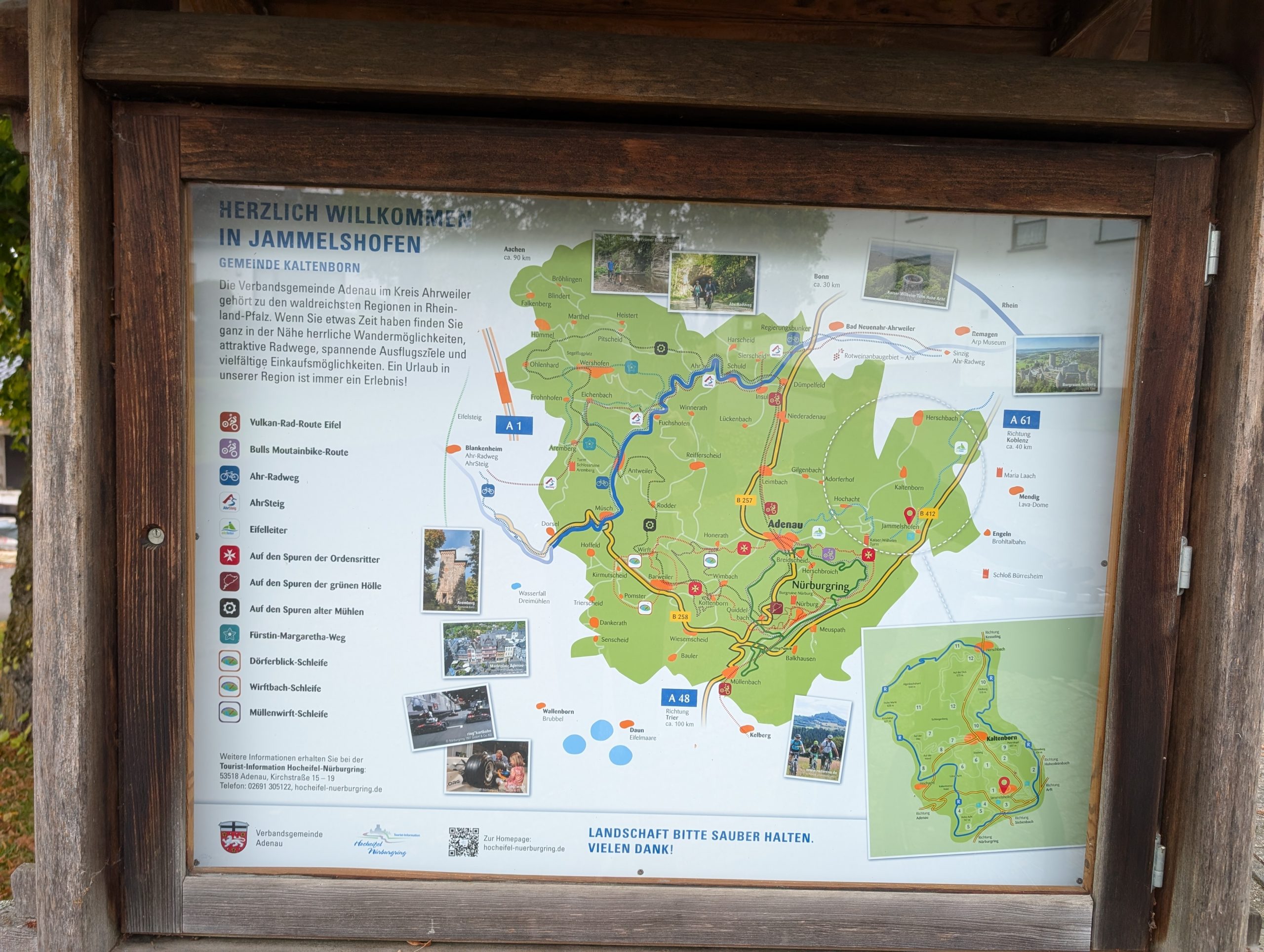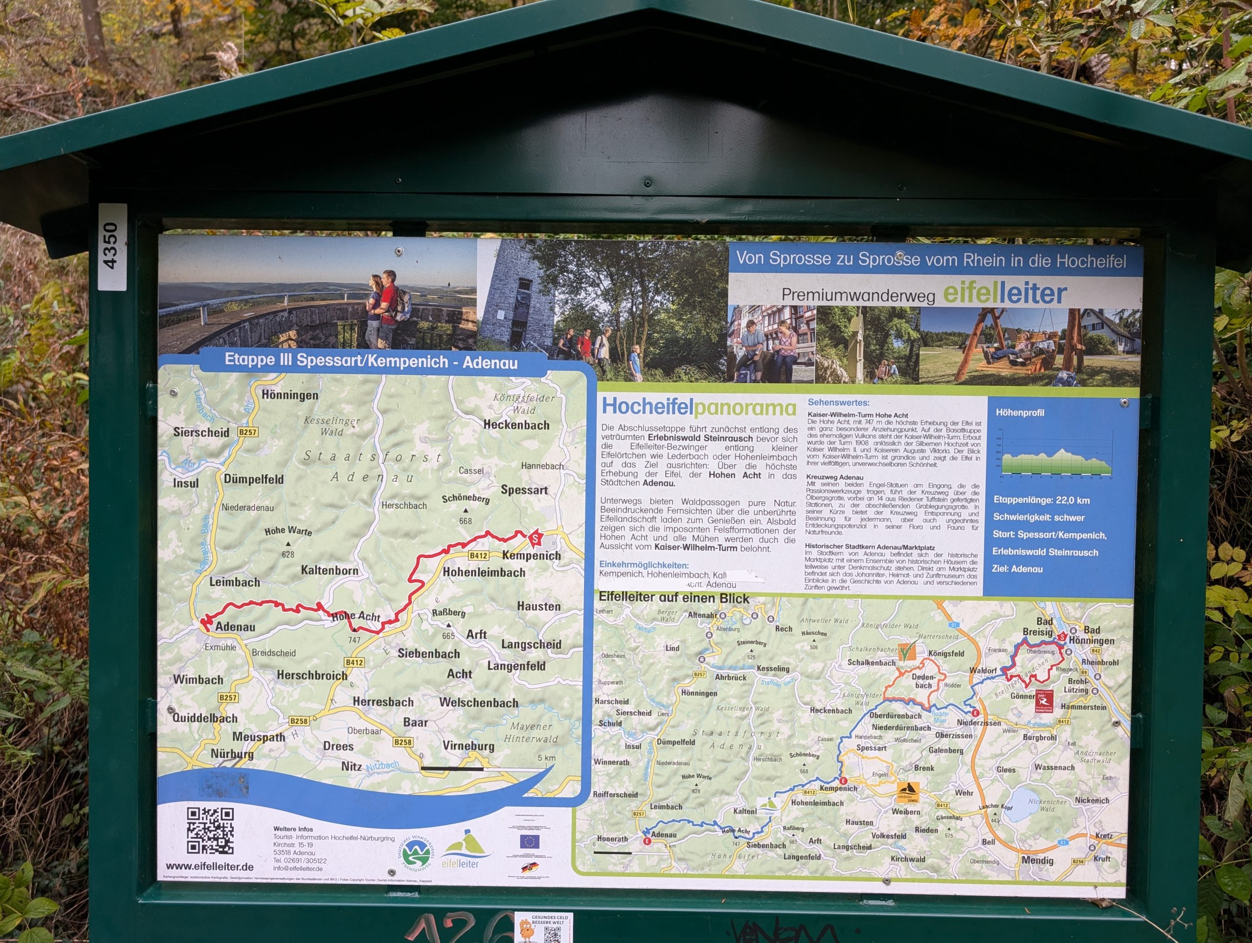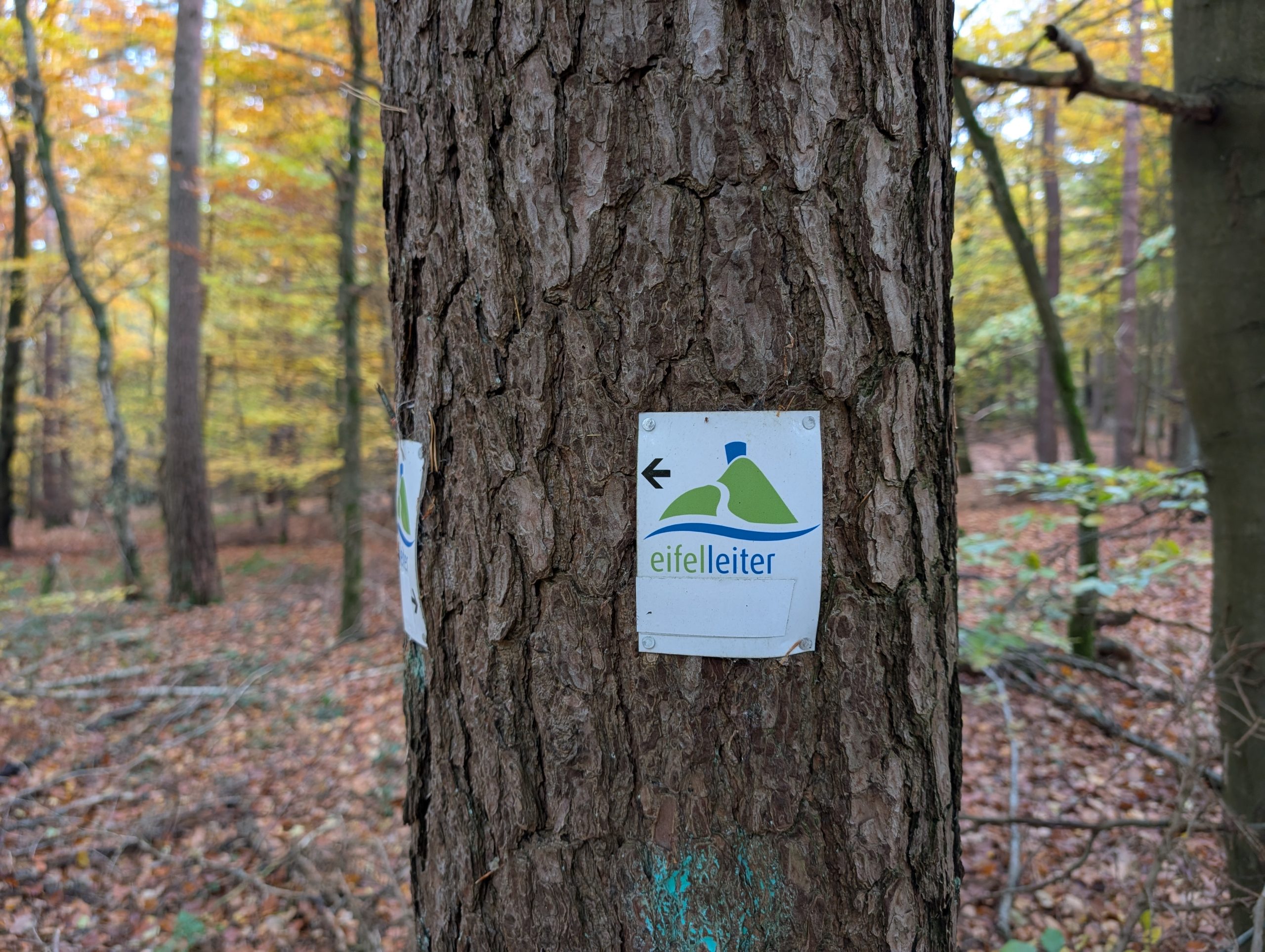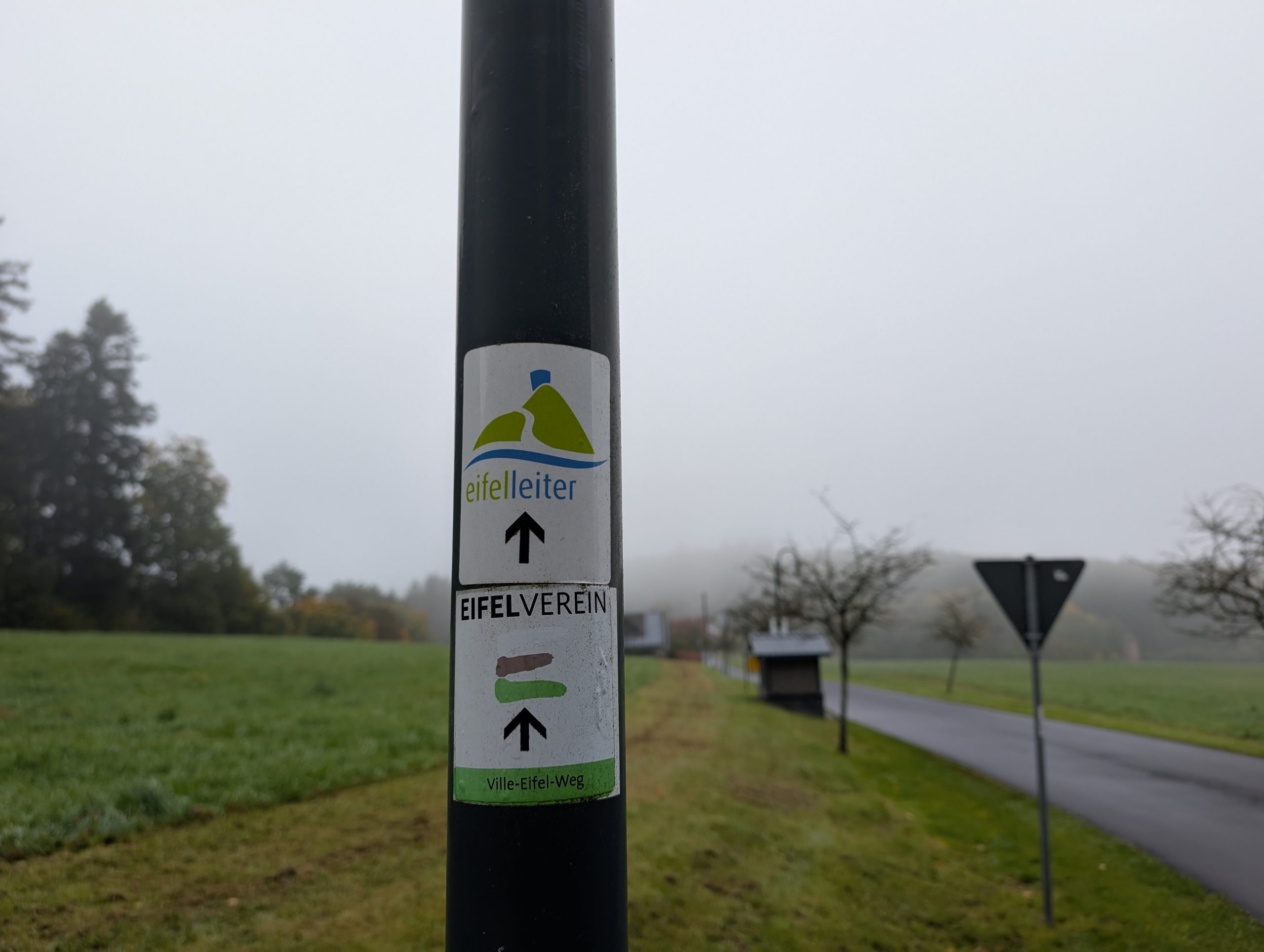 Die Eifelleiter ist ein naher Fernwanderweg mit übersichtlicher Länge. Da kann man gut alle Etappenabsolvierungsansätze ausprobieren, die so gerade einfallen. Mit Auto anfahren und ein Stück hin und wieder zurück laufen oder mit dem Rad fahren. Mit dem Auto übernachten und das Rad am Baum anbinden. Mit dem Auto anfahren und mit ÖPNV zum Etappenstart.