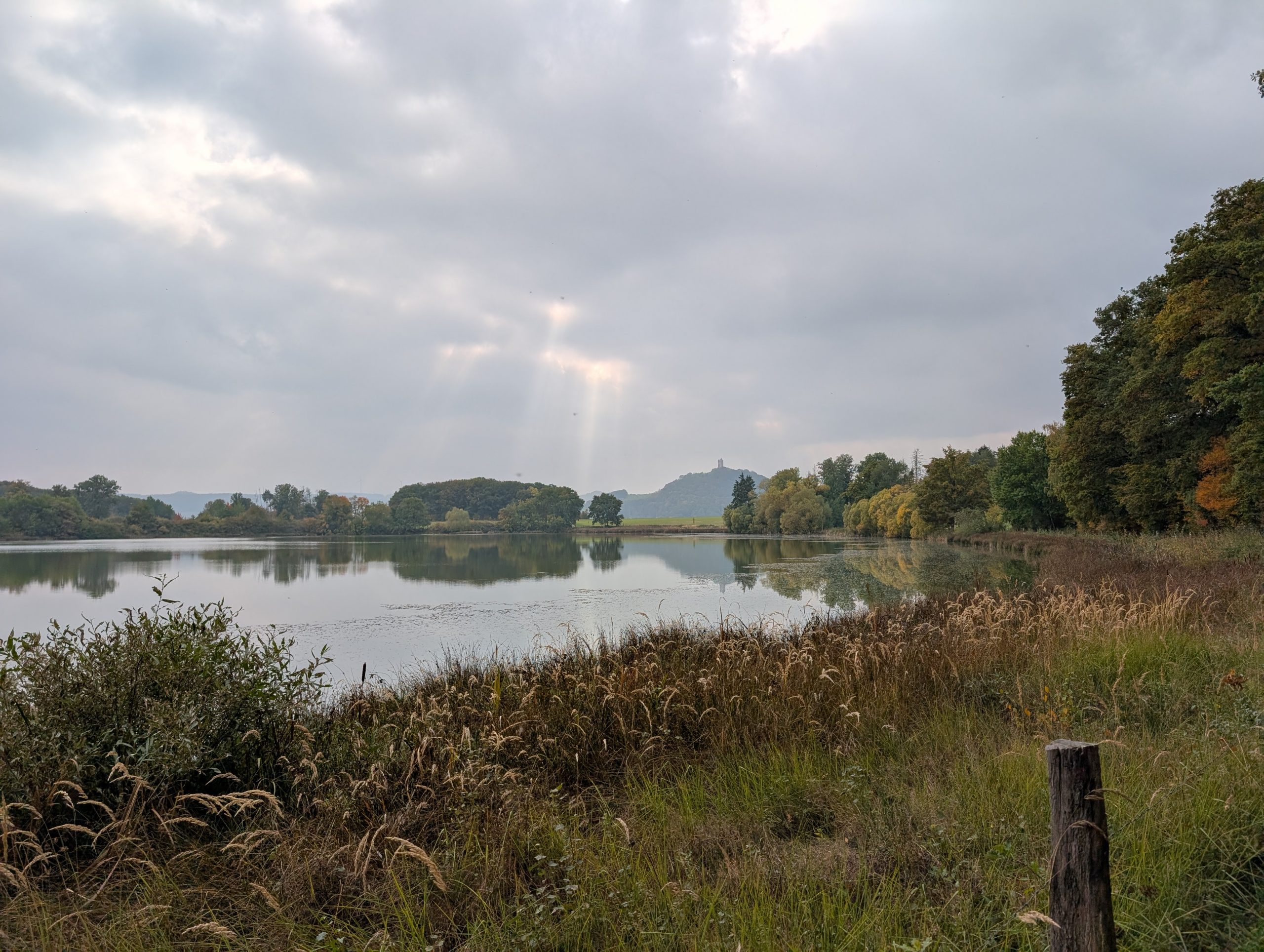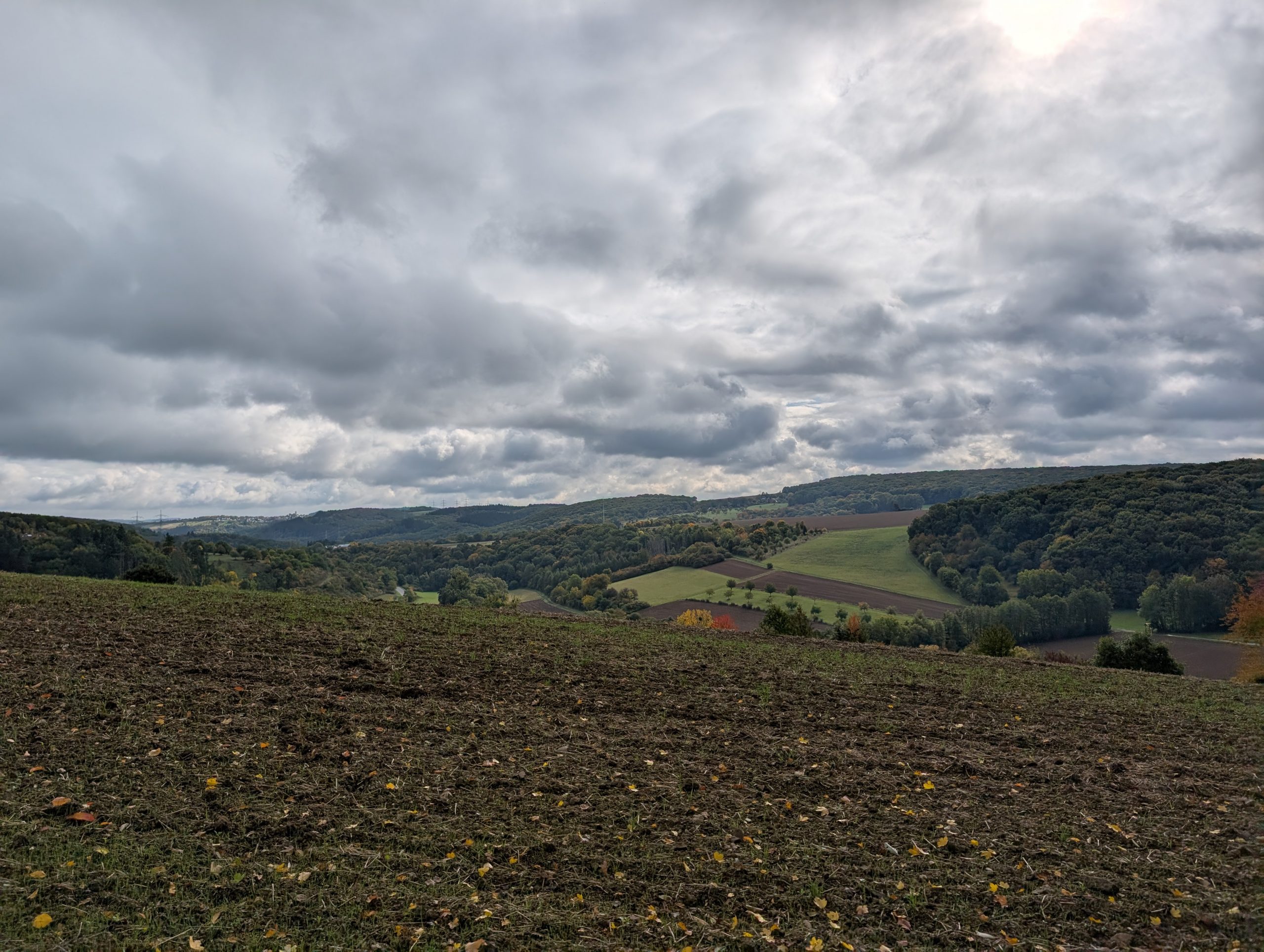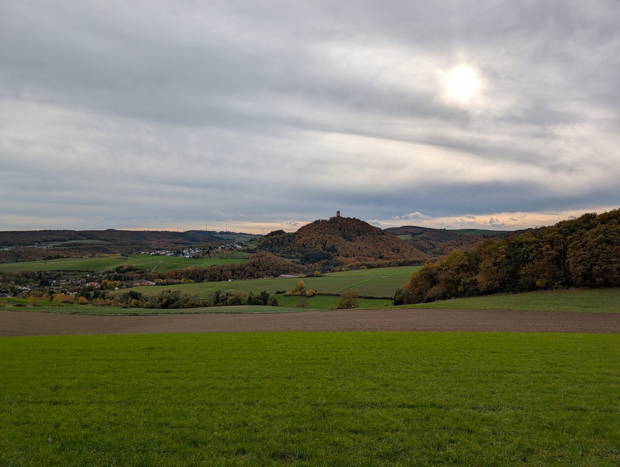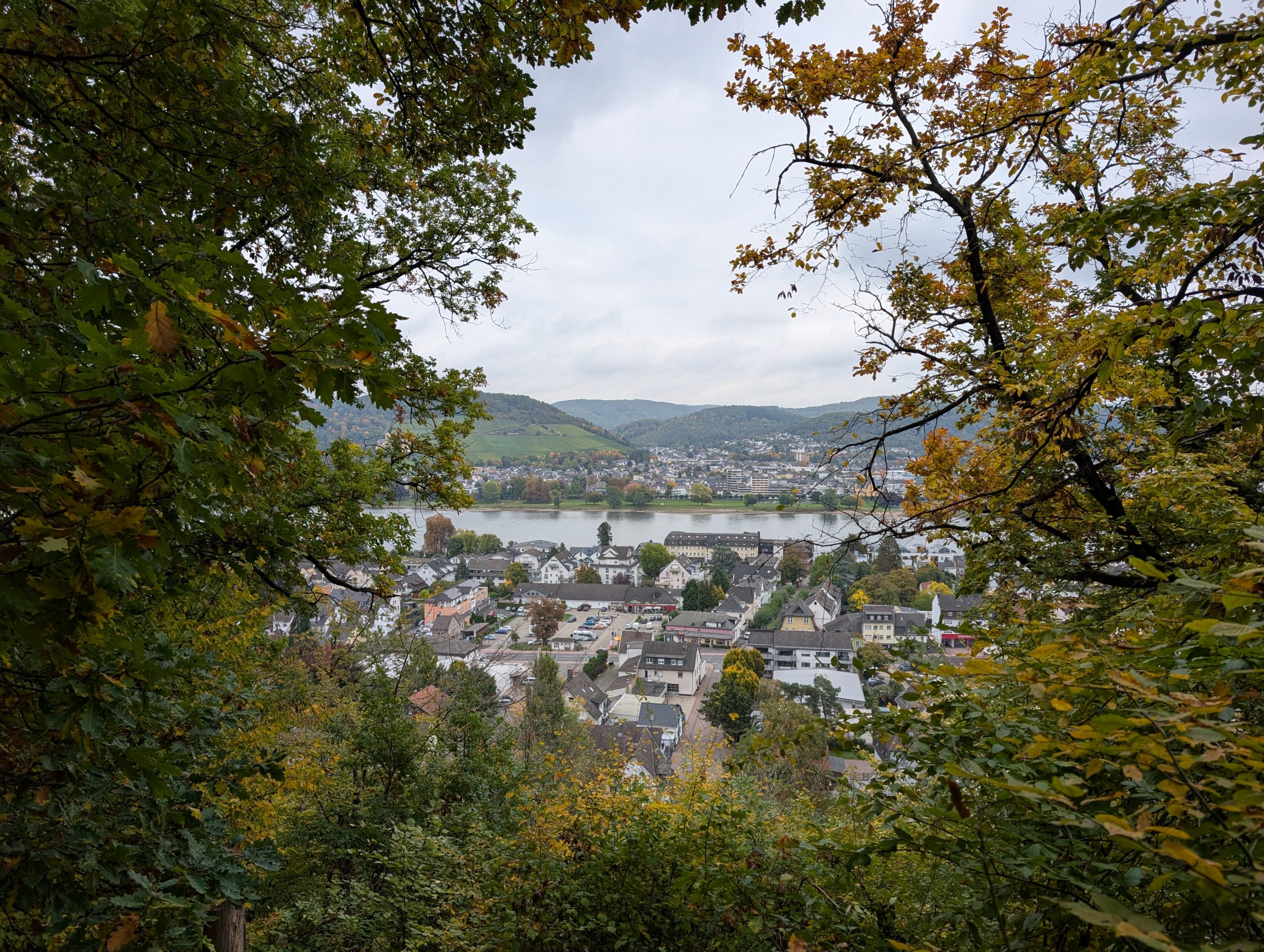 Es beginnt mit einem nieseligen Nebel Oktobertag und endet mit Sonnenstrahlen. Die Rheinetappe beginnt an der Autobahn am Mitfahrerparkplatz und für die ersten 3 Kilometer liefert die Bahn auch die Geräuschkulisse. Der Weg nach Bad Breisig tendiert bergab, aber in Waldorf wird einmal das Tal gewechselt und weil es so schön war auf Wallers gleich noch mal. Der Frankenbach muss auch noch überquert werden, weil die andere Hangseite dann eine Kesselbergzunge bis fast zum Rheintal bietet. Inzwischen ist im Rheintal dann auch nicht nur Nebel sondern auch Wasser zu sehen. Der bisherige Schlurflauf hat besonders die Füße und den Kopf ermüdet. Da der Absteig nicht wie geplant im Kurpark endet, wird auf die Rheinuferbesichtigung verzichtet und der Weg zurück zu den Höhen über Waldorf gesucht. Dabei geht es hinauf durch Oberbreisig, so werden die zwei Seitentälerquerungen vermieden. In den Laufschuhen leiden die Zehen vor allen Dingen bergab. Die Streckenlänge liegt an der Obergrenze der aktuell ohne Leiden zu bewältigenden Strecke.