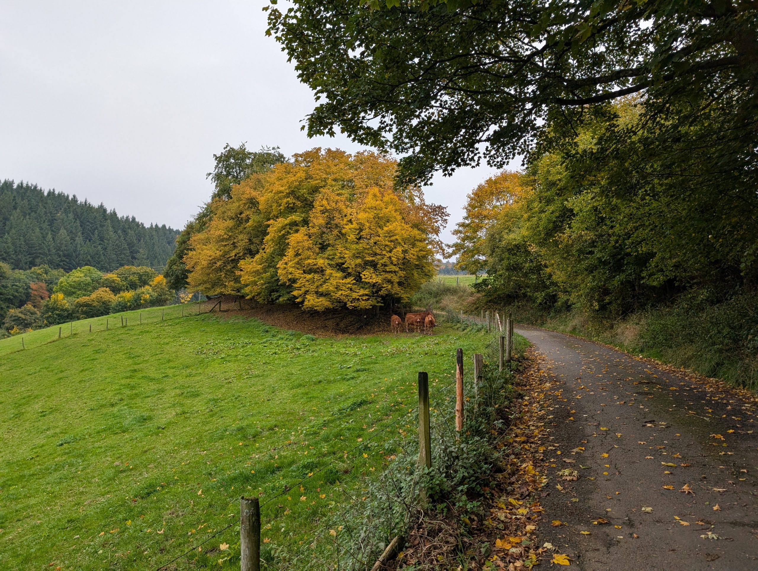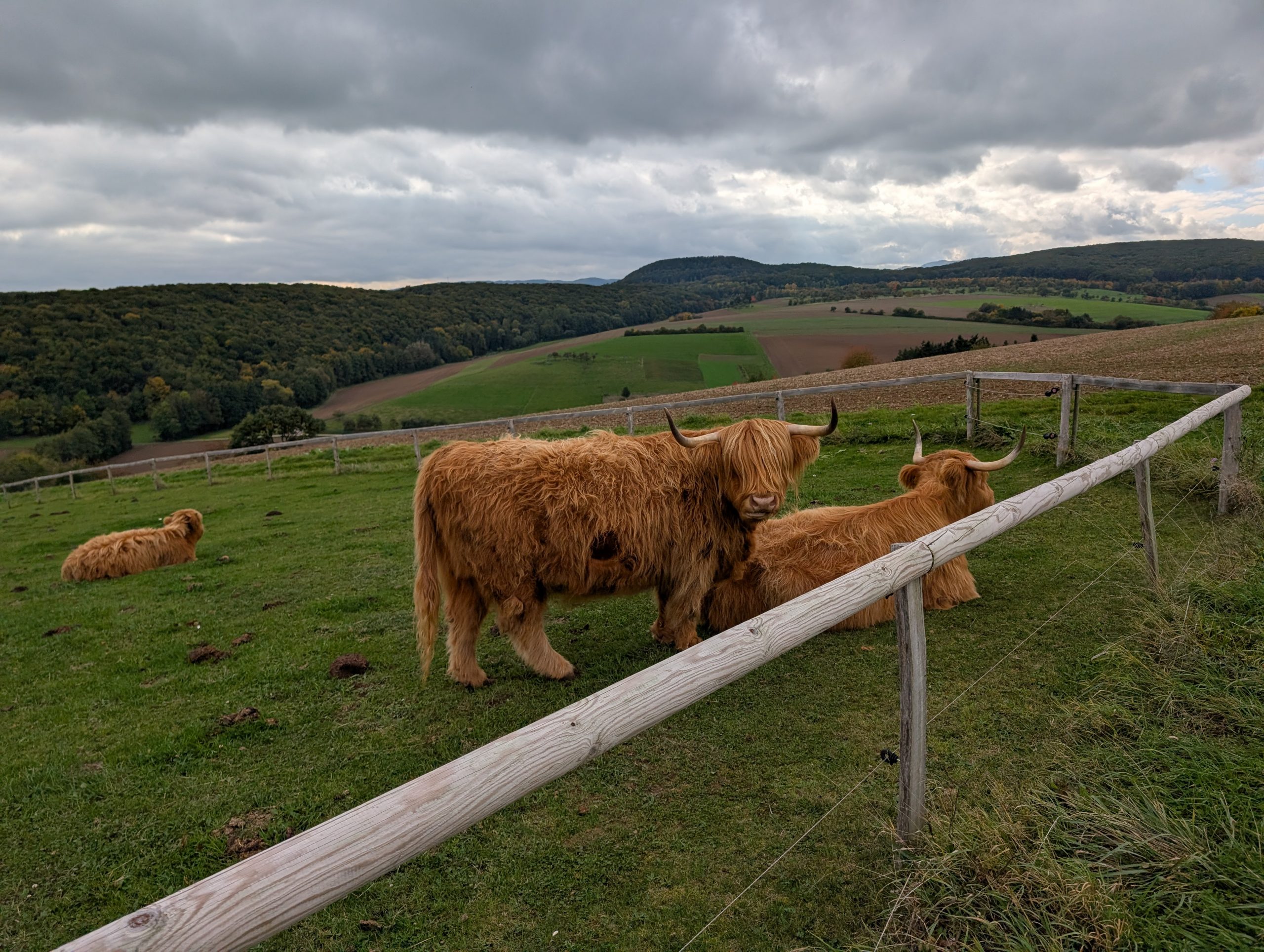 Die Strecke entlang eines Höhenrückens hatte trotz oder wegen des Wetters ihre magischen Momente und bis auf 4 Menschen waren unterwegs nur Kühe, Pferde und zwei imposante Lamas zu sehen.