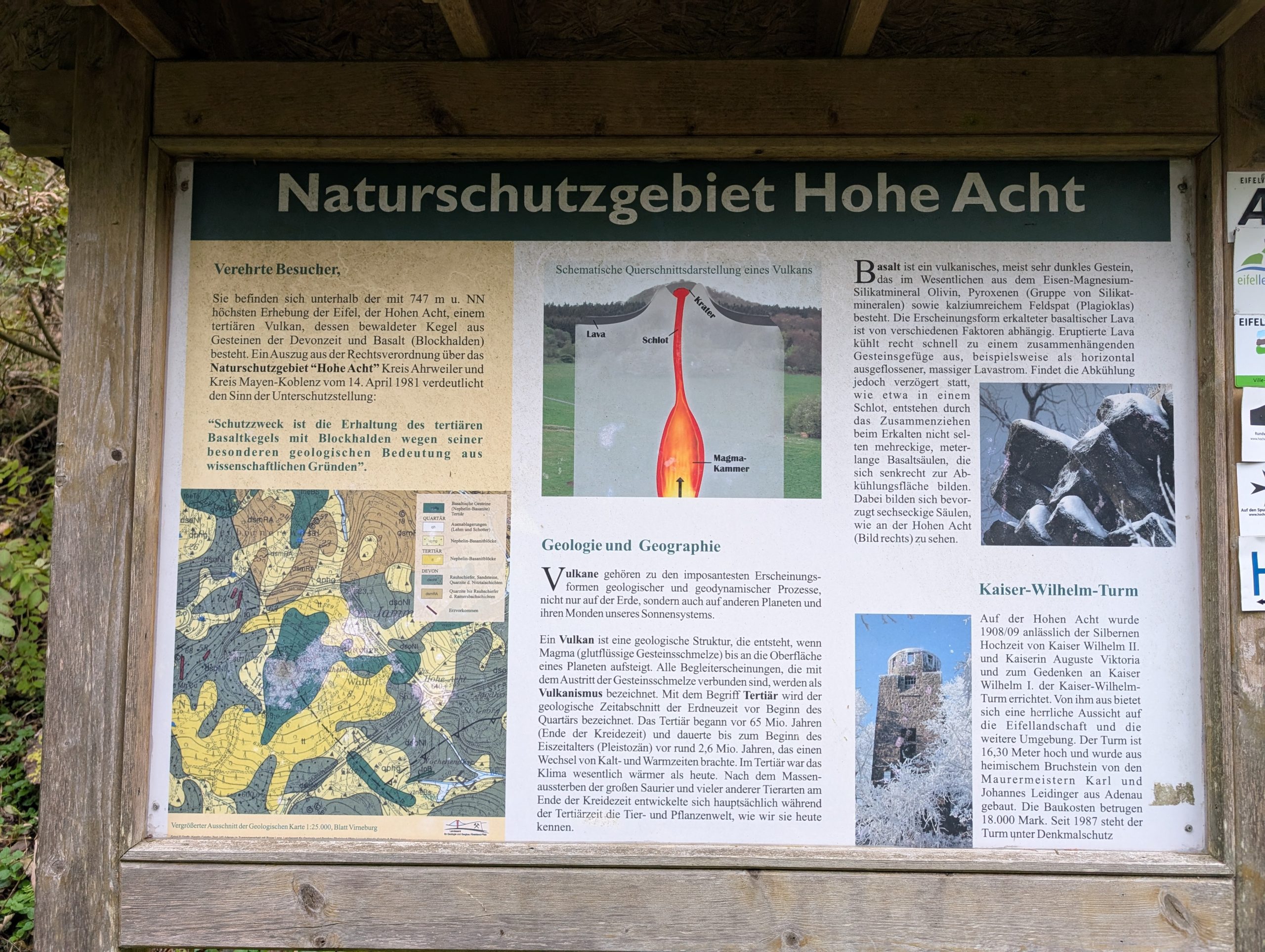 Diese Tour wird von Kunigunde und Kunibert wieder gemeinsam bewältigt. Für die insgesamt 16 Kilometer wird der Roller wieder mitgenommen. Gestartet wird am Wanderparkplatz Hohe Acht. Mit dem Wanderweg geht es durch den Wald bis zur de-Lassaulx-Hütte. Hier gibt es eine kurze Rast und einen guten Blick auf Adenau. Der Wanderweg führt von hieraus weiter den Berg hinunter bis Adenau, wir allerdings begeben uns ab der de-Lassalx-Hütte wieder auf den Rückweg.