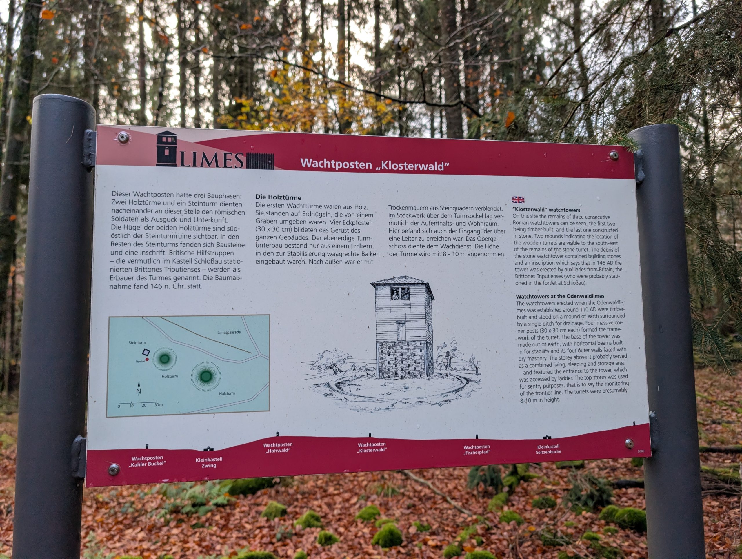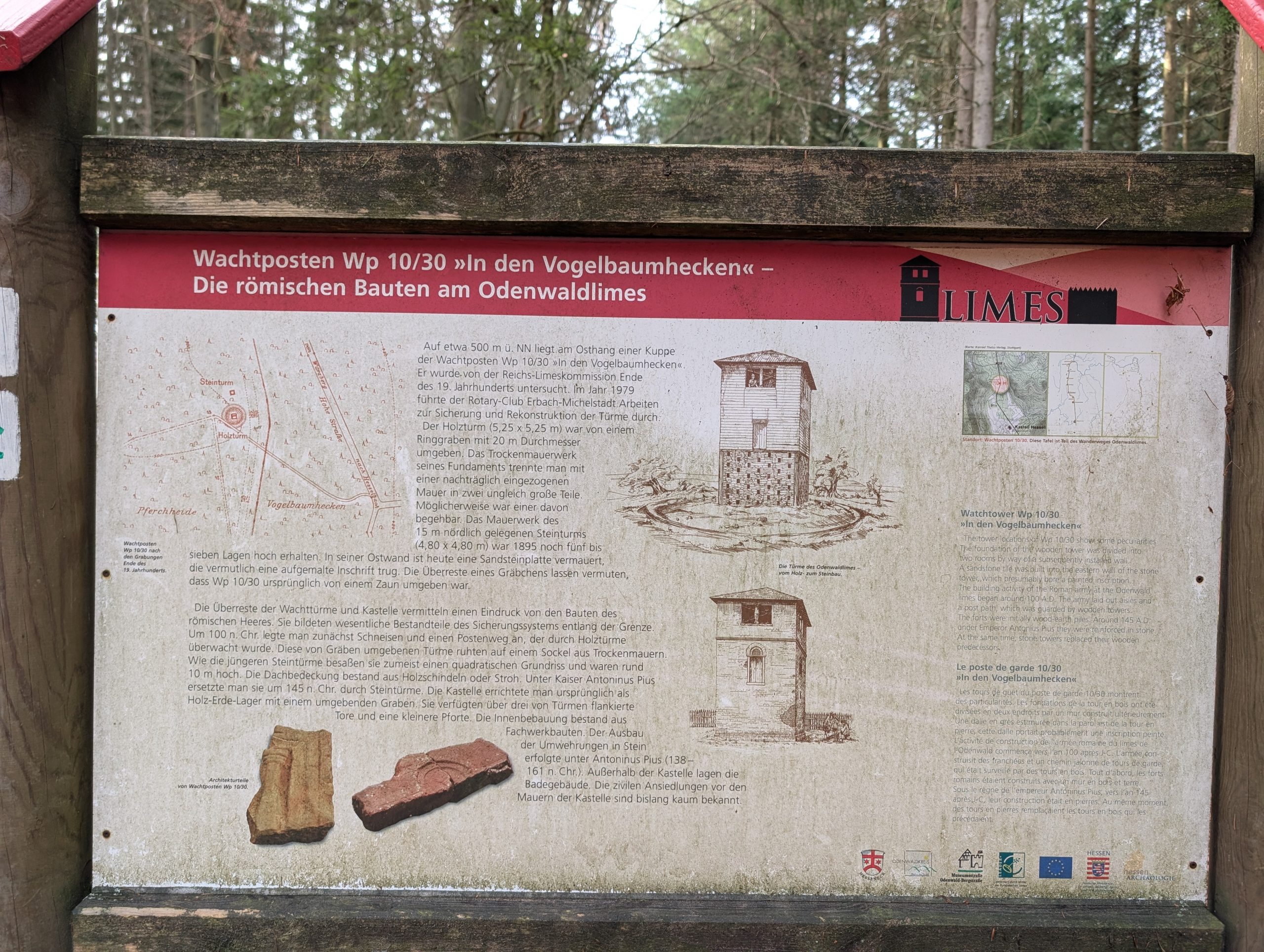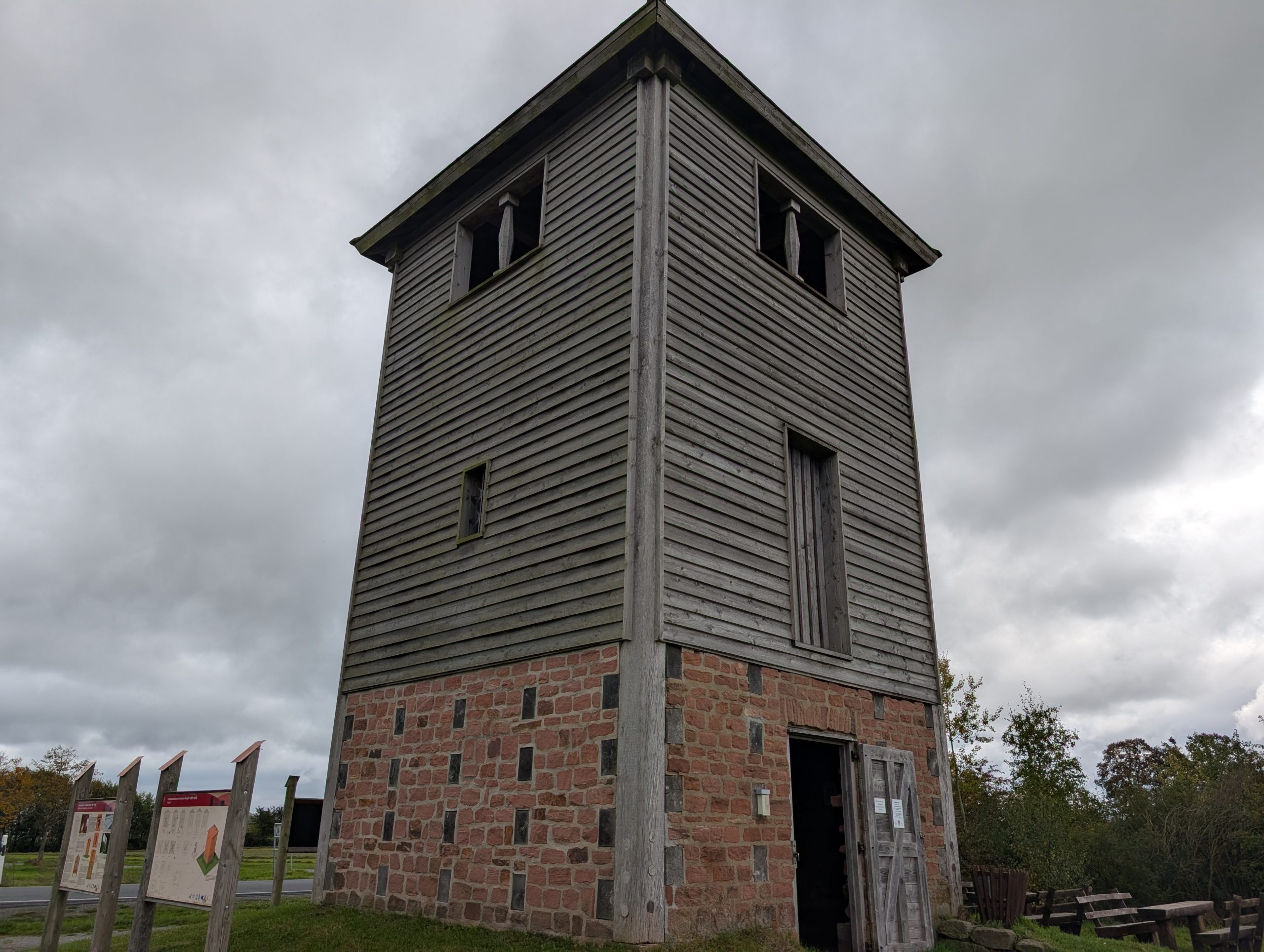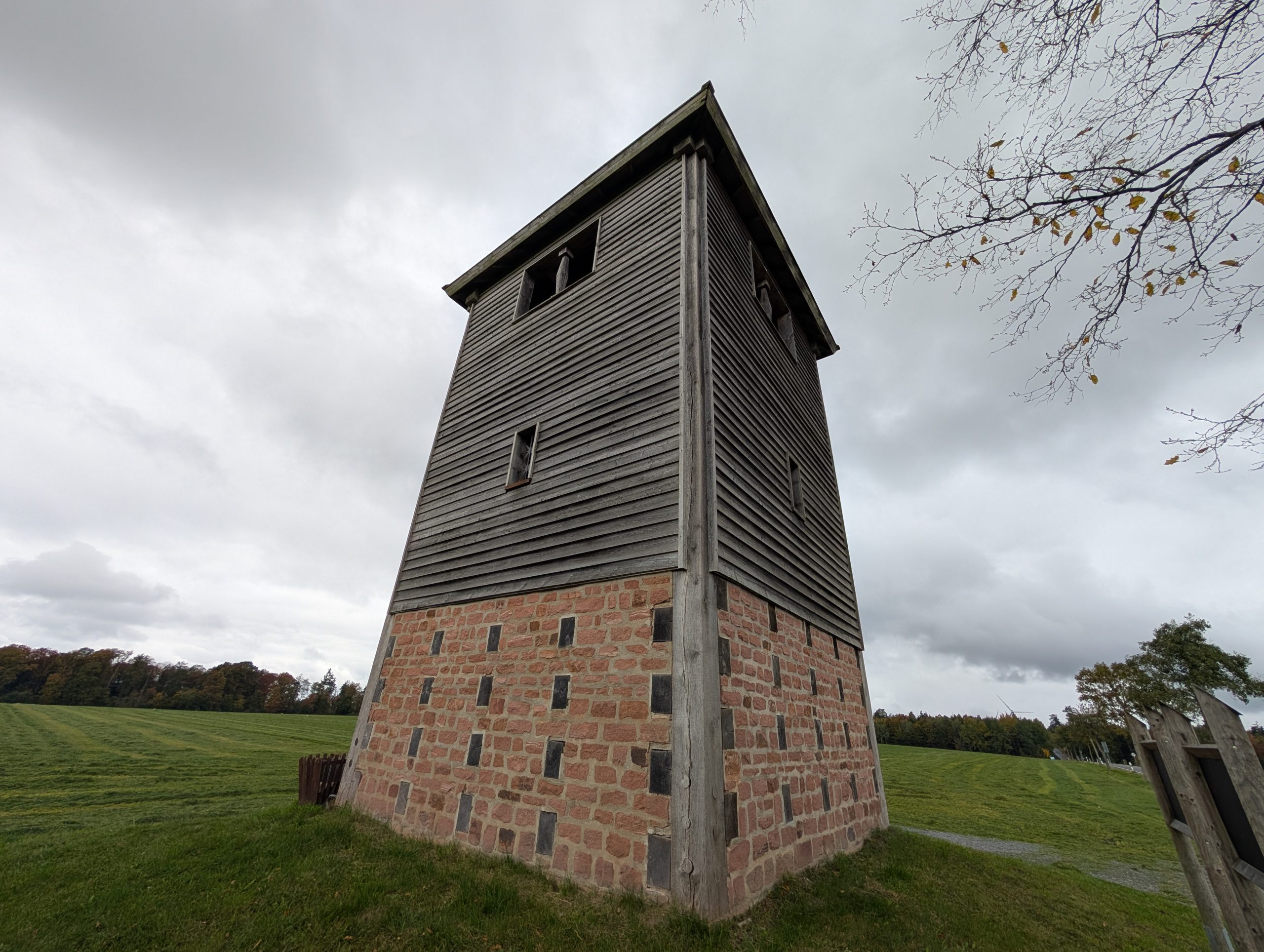 Erst bei der Nachbearbeitung der Strecke sehen wir, dass an der L3349 bei Vielbrunn ein wieder aufgebauter Römischer Limes-Wachturm steht, an dem der Limeswanderweg allerdings nicht vorbeigeführt hat. Bei einer späteren Anreise zum Campingplatz schauen wir uns den Wachturm noch einmal genauer an.