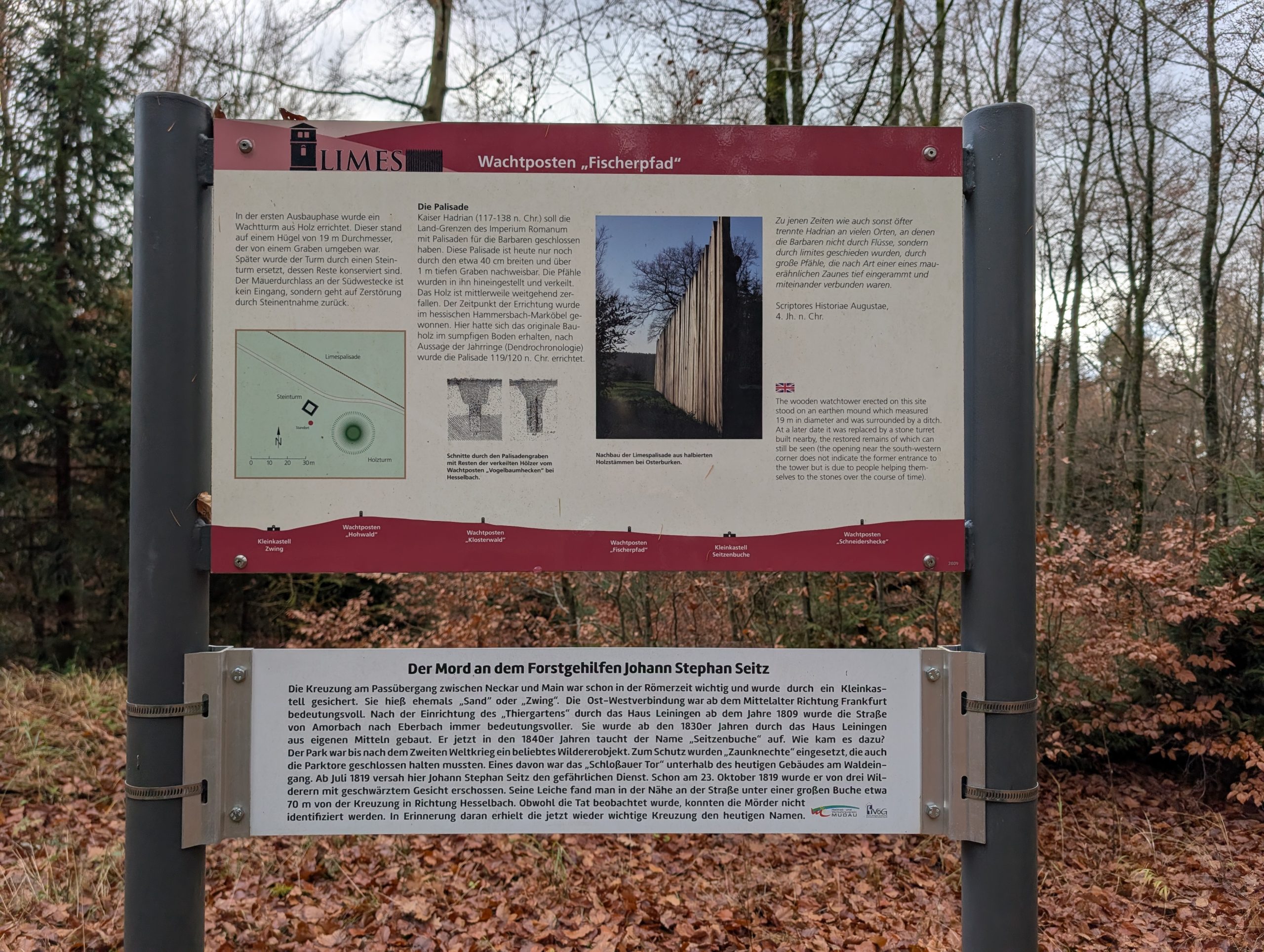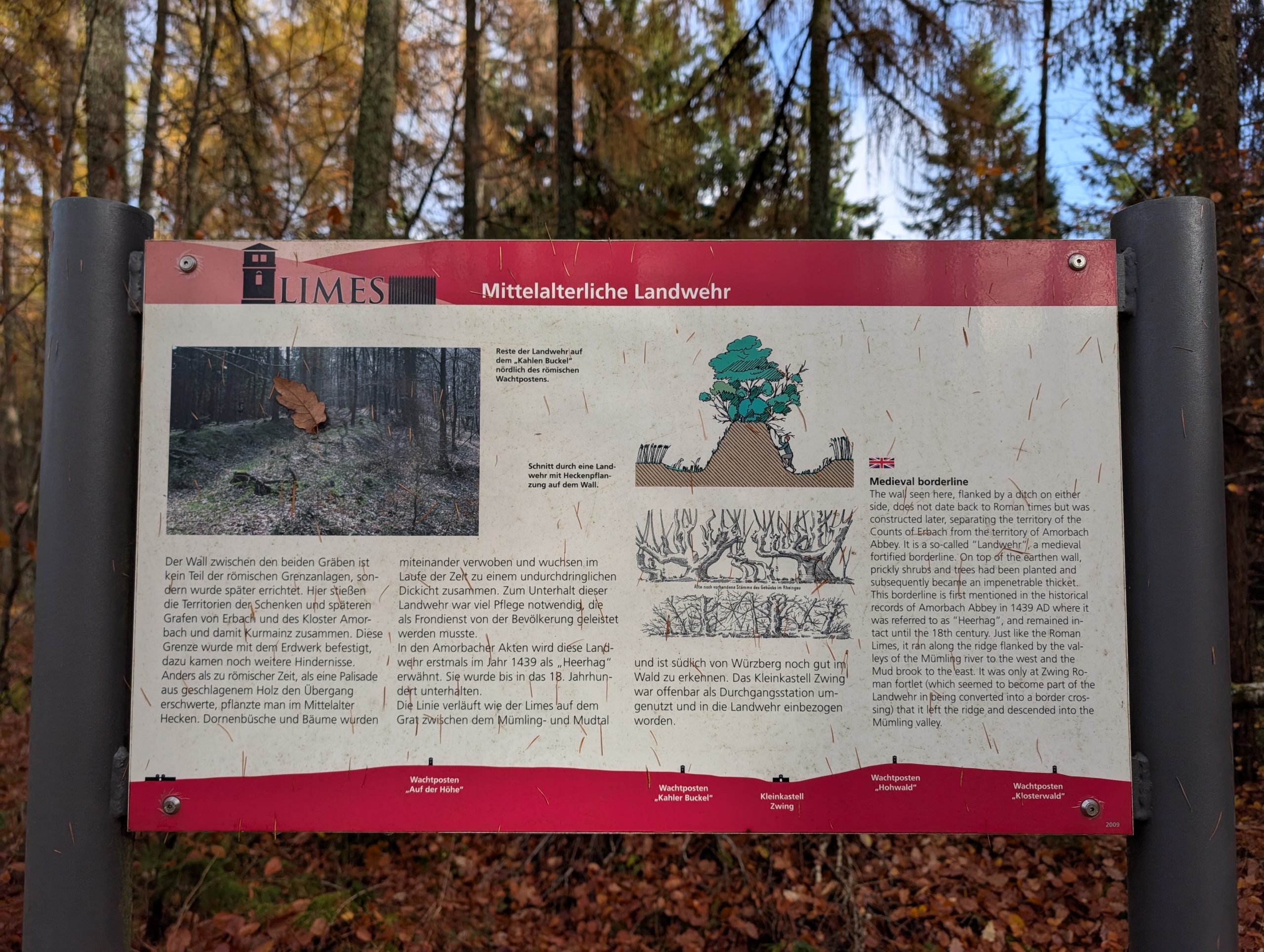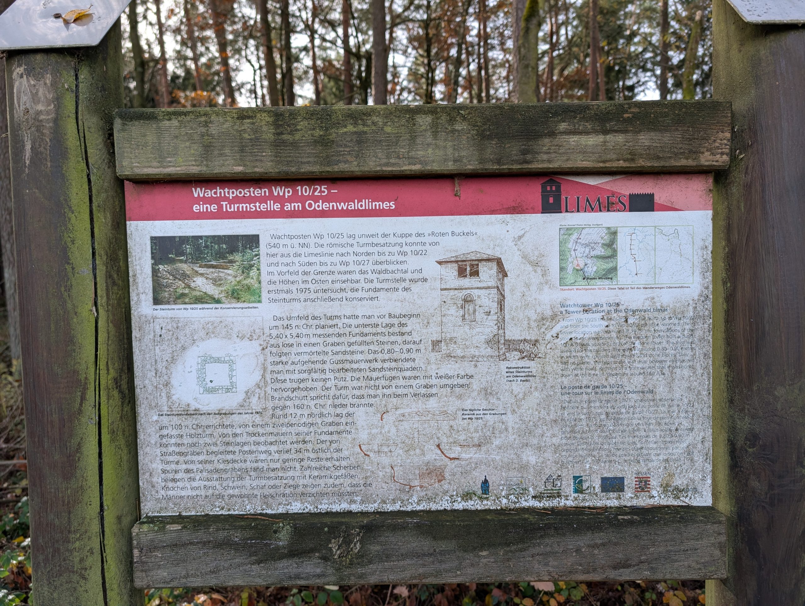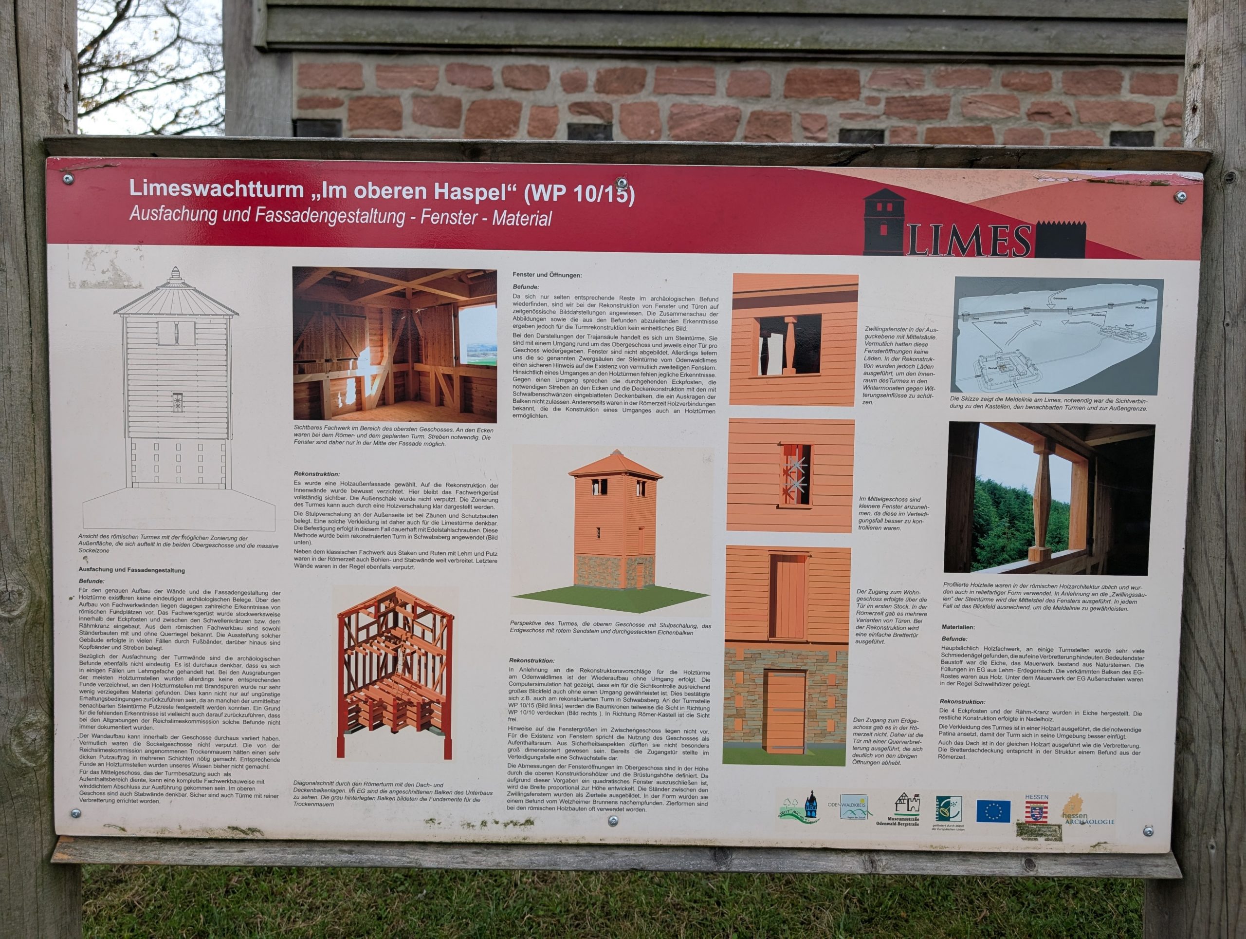 Erst bei der Nachbearbeitung der Strecke sehen wir, dass an der L3349 bei Vielbrunn ein wieder aufgebauter Römischer Limes-Wachturm steht, an dem der Limeswanderweg allerdings nicht vorbeigeführt hat. Bei einer späteren Anreise zum Campingplatz schauen wir uns den Wachturm noch einmal genauer an.