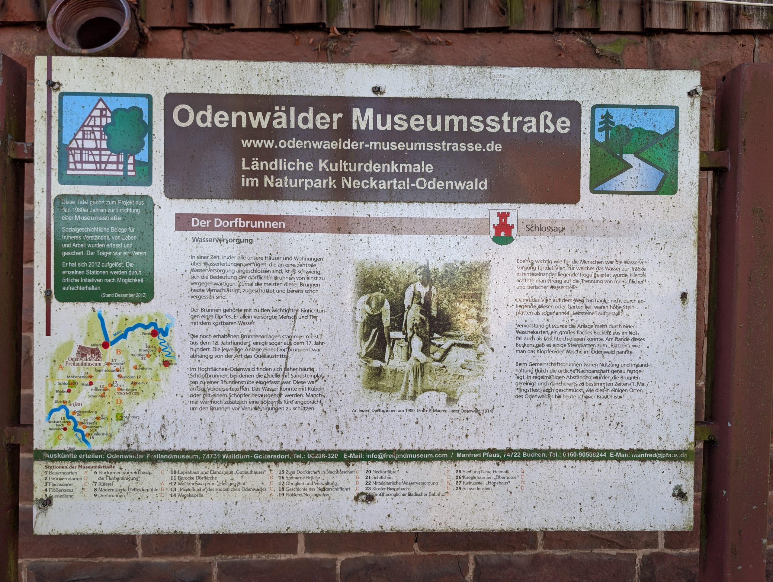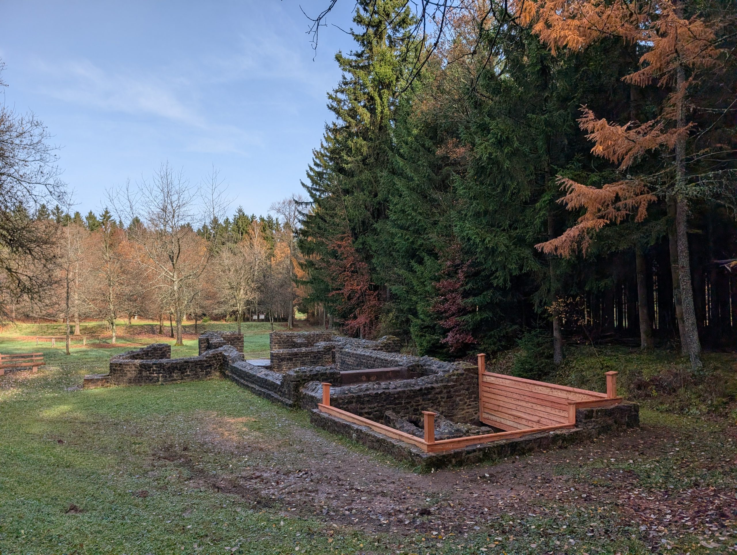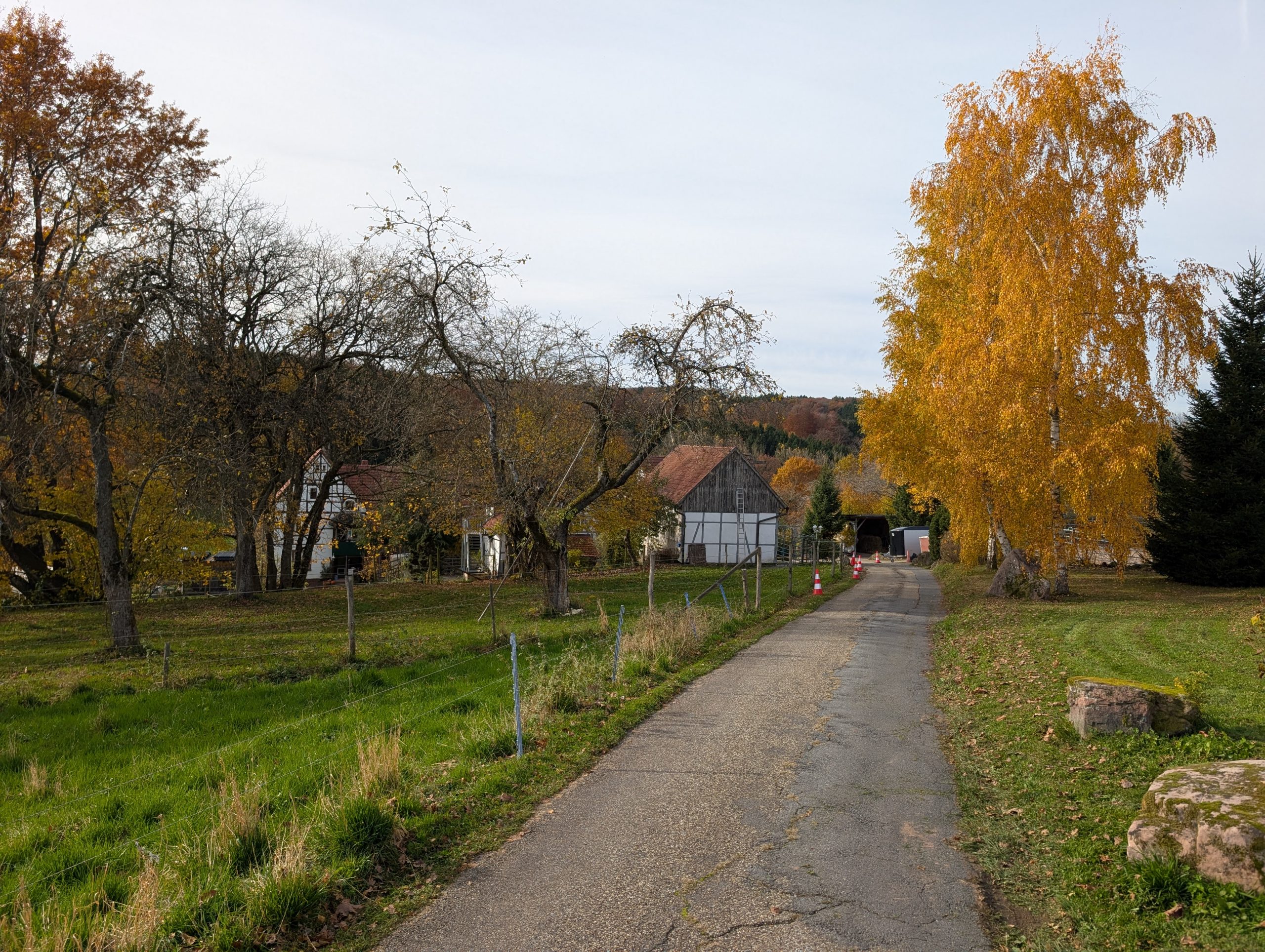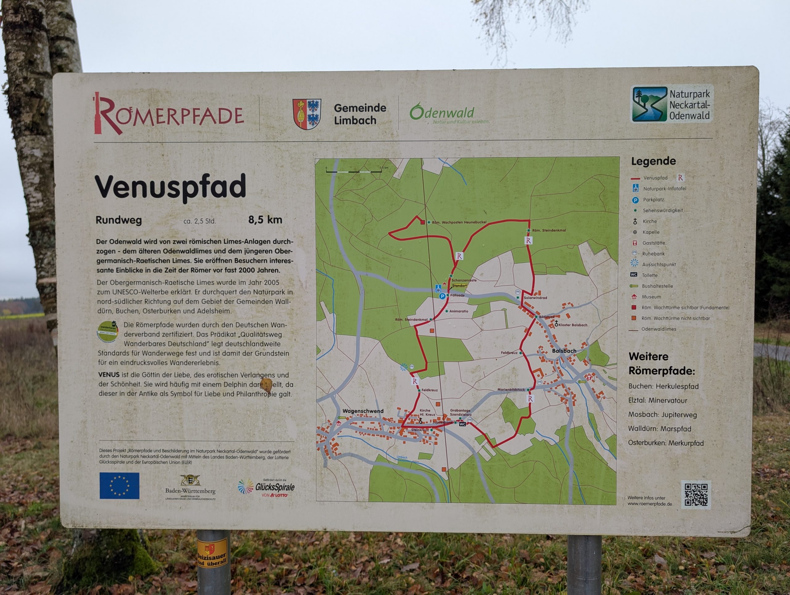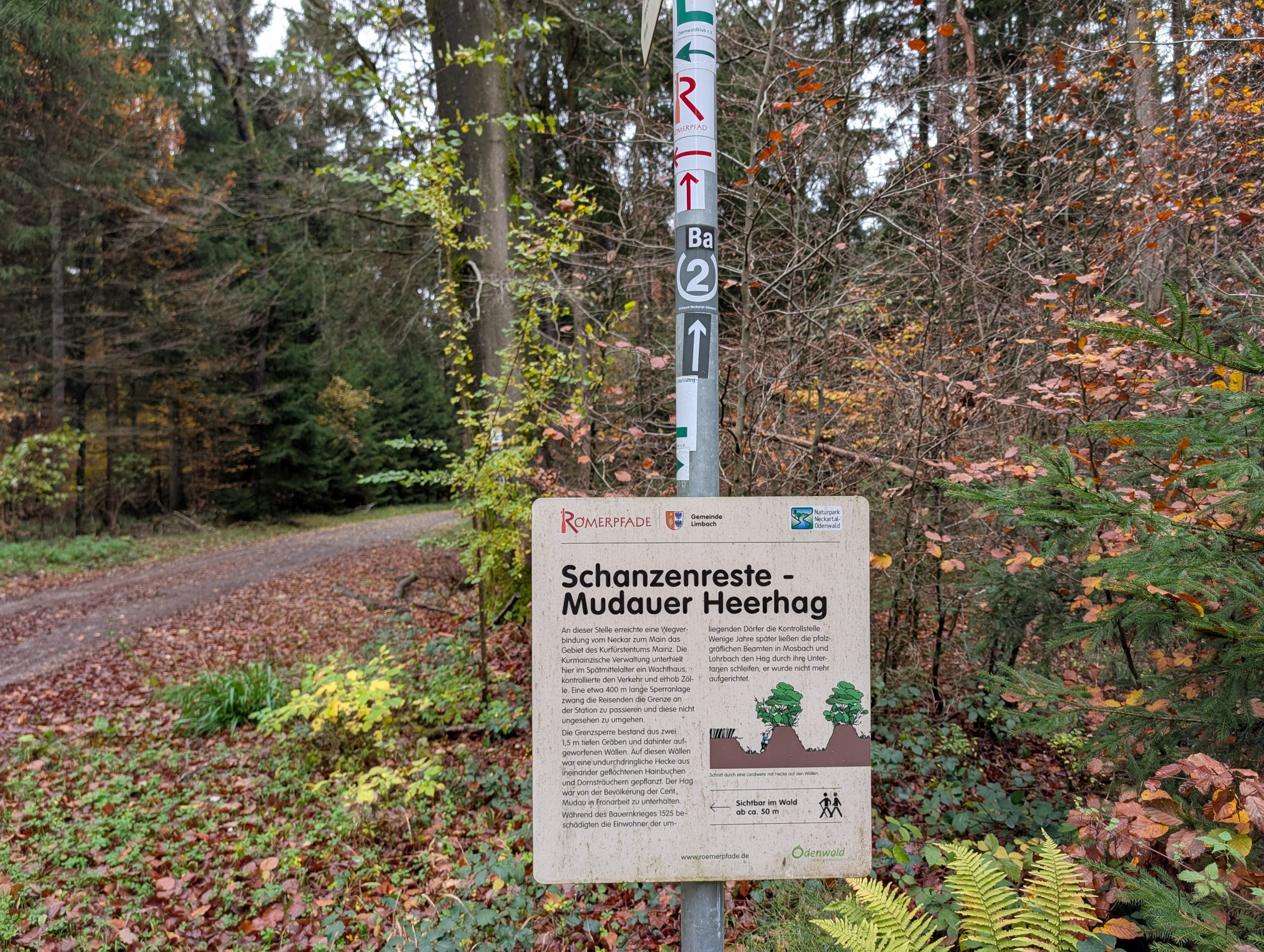 Wir starten wieder am Friedhofsparkplatz in Sattelbach. Im Dorf treffen wir auf unseren Limesweg, der uns ins Trienzbachtal führt. Im “Trienzgrund” verlassen wir den Westlichen Limesweg und wandern mit dem HW36 bis zur Ortsmitte von Fahrenbach. Dort stoßen wir auf den Main-Neckar-Weg HW33, der uns in Richtung Lohrbach führt bis zur Wanderbahn. Es ist eine ehemalige Bahnstrecke, die von Mosbach nach Mudau führte. Mit ihr geht es dann wieder zurück in Richtung Sattelbach.