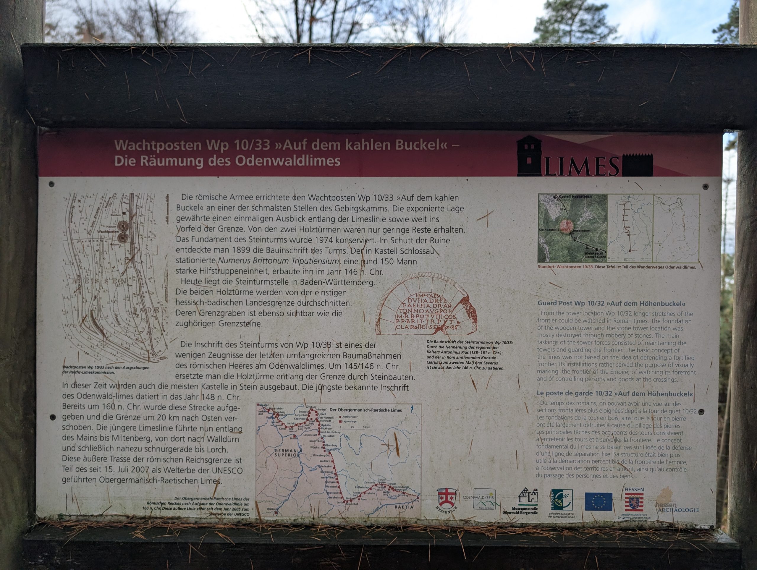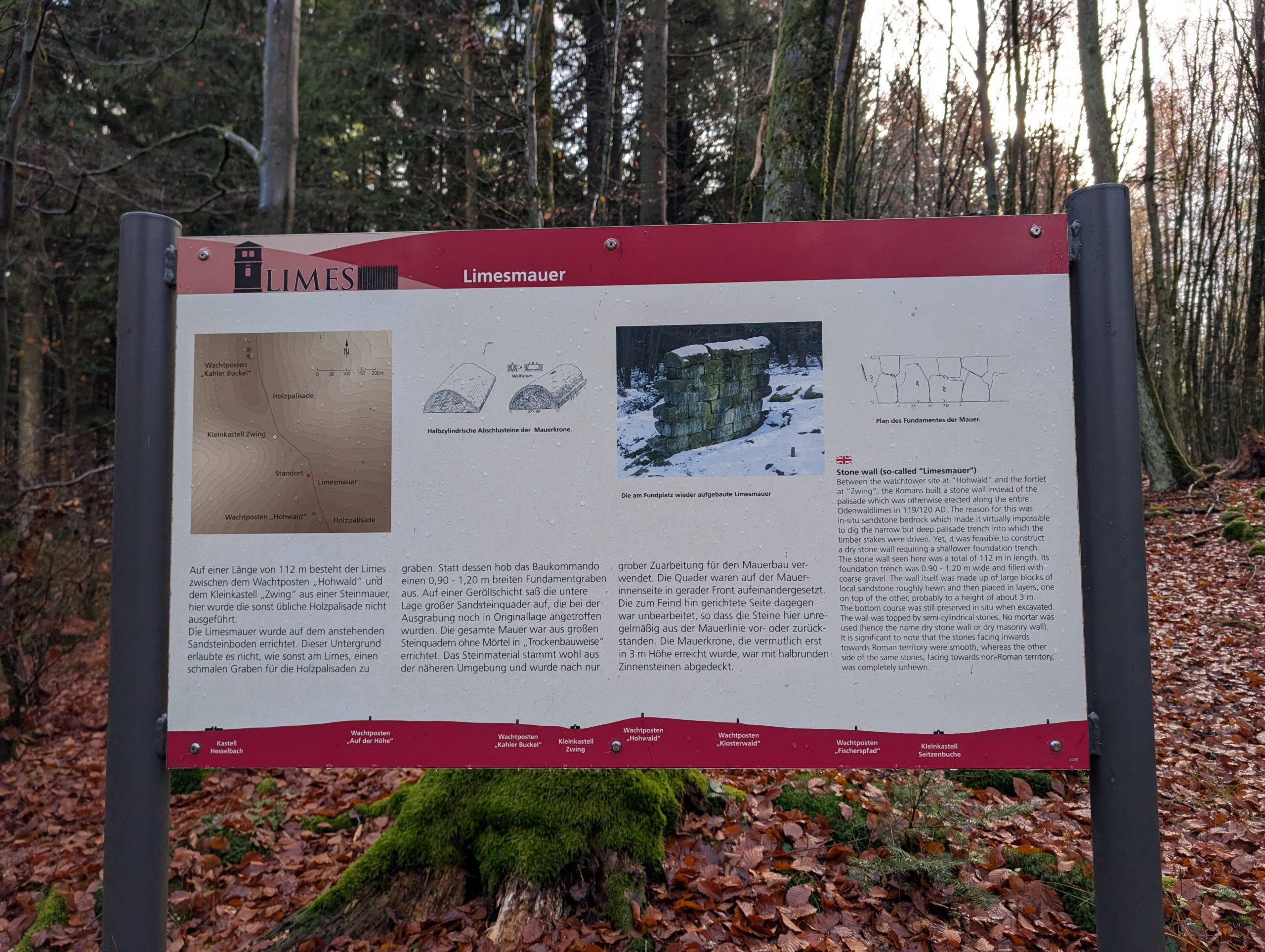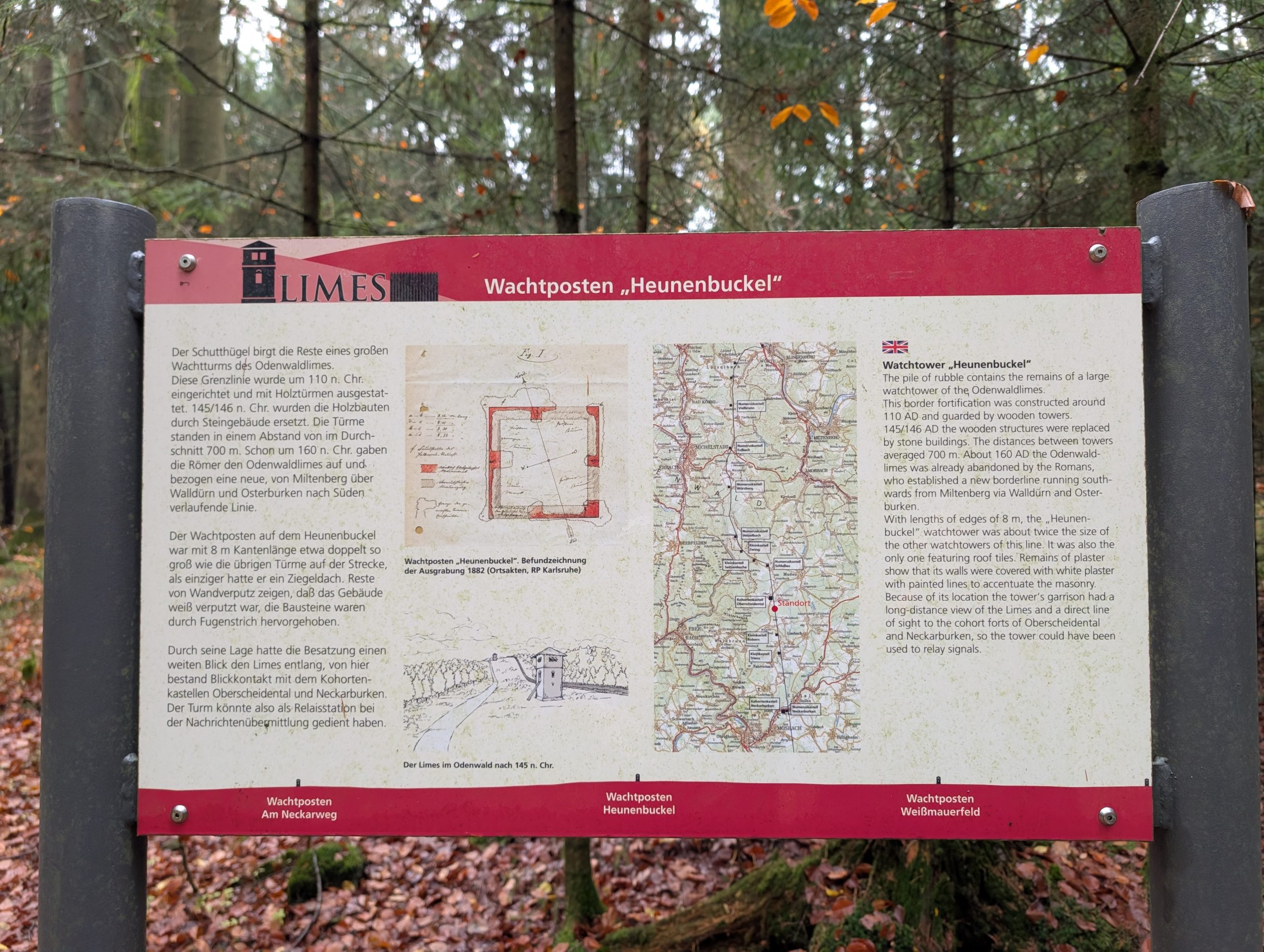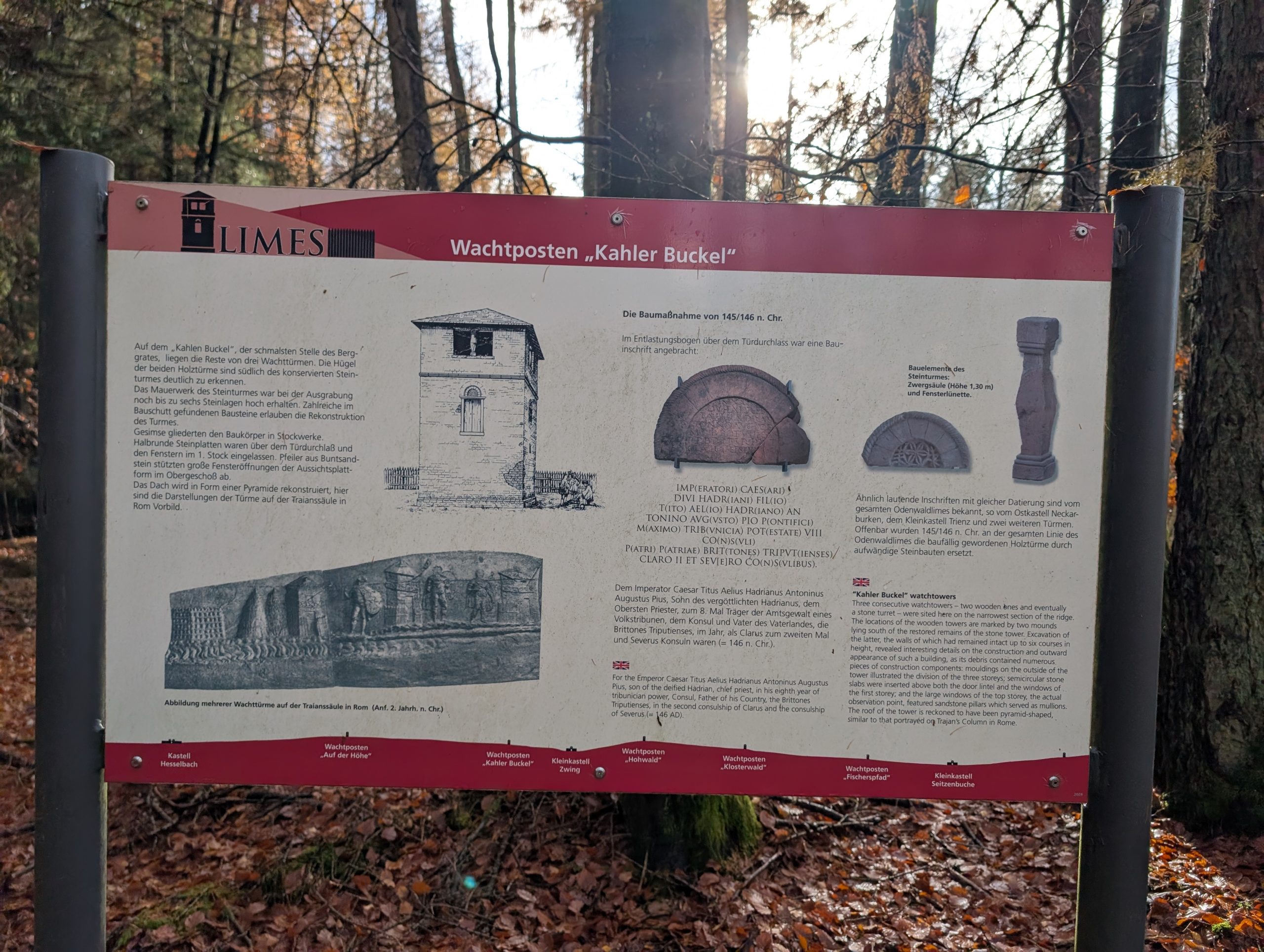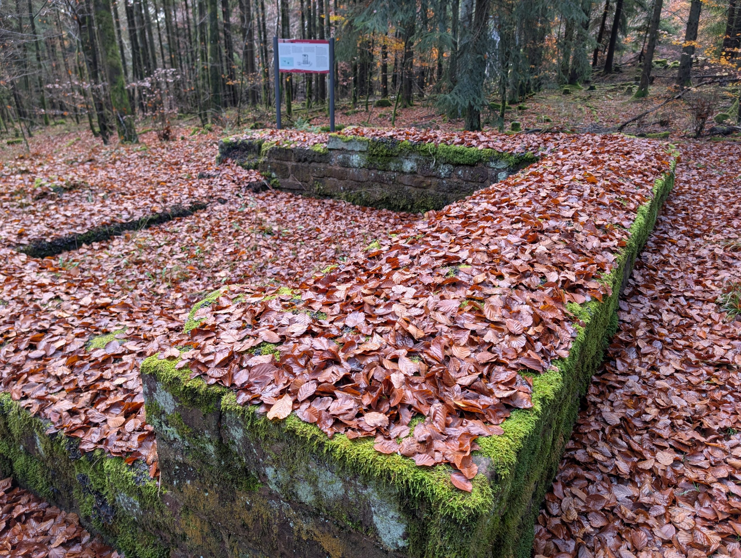 Wir starten wieder an denselben Wanderparkplatz wie zuvor. Mit dem Westlichen Limesweg geht es in Richtung Hesselbach. Dabei kommen wir an insgesamt 5 Wachposten, einer Limesmauer und einem Kleinkastell vorbei. Bei dem Berg “Hohe Langhälde” (548 m) stoßen wir auch auf dem Nibelungensteig, den wir in den letzten Jahren erwandert haben. Am Friedhof Hesselbach verlassen wir den Westlichen Limesweg und wandern mit den Örtlichen Wanderwegen 1,4,6 wieder zurück in Richtung Parkplatz, bis wir wieder auf unseren Hinweg stoßen. Auf dem Rückweg umgehen wir aber auch noch den “Hohwald” mit 552 m und können so ein paar Höhenmeter einsparen.
