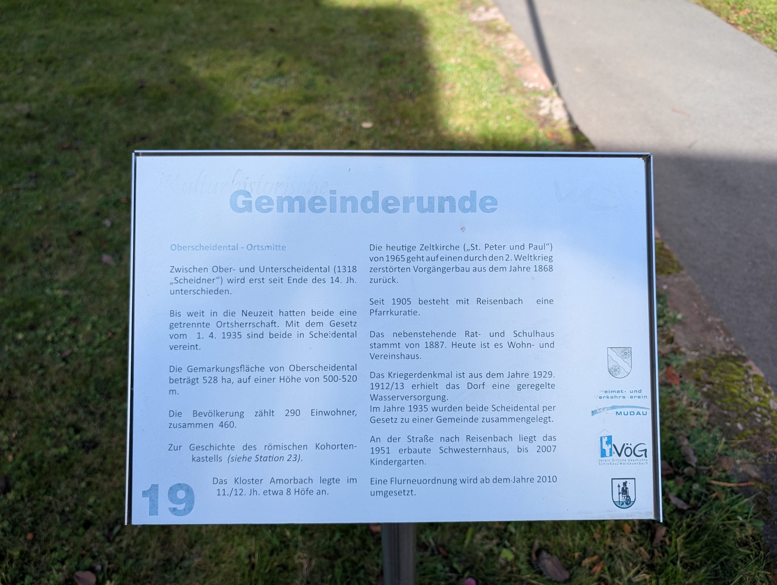 Wir parken auf einem großen Parkplatz am Sportplatz in Scheidental. Von dort wandern wir zuerst durch das Dorf und mit dem Westlichen Limesweg in Richtung Waldauerbach und weiter nach Schloßau. An der Kirche St. Wolfgang verlassen wir den Westlichen Limesweg und wandern weiter in Südwestlicher Richtung, vobei an einem Gedenkstein (Emich Fürst von Leiningen” und weiter durch den Wald bis wir auf den Rundwanderweg Reisenbach 4 stoßen. Mit ihm geht es wieder und zurück nach Scheidental.