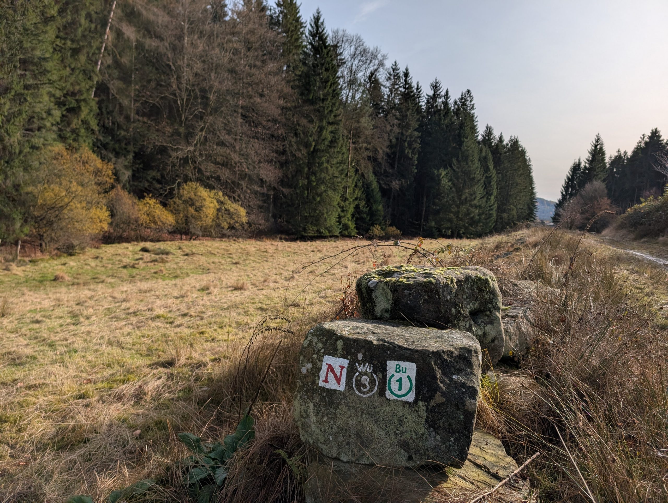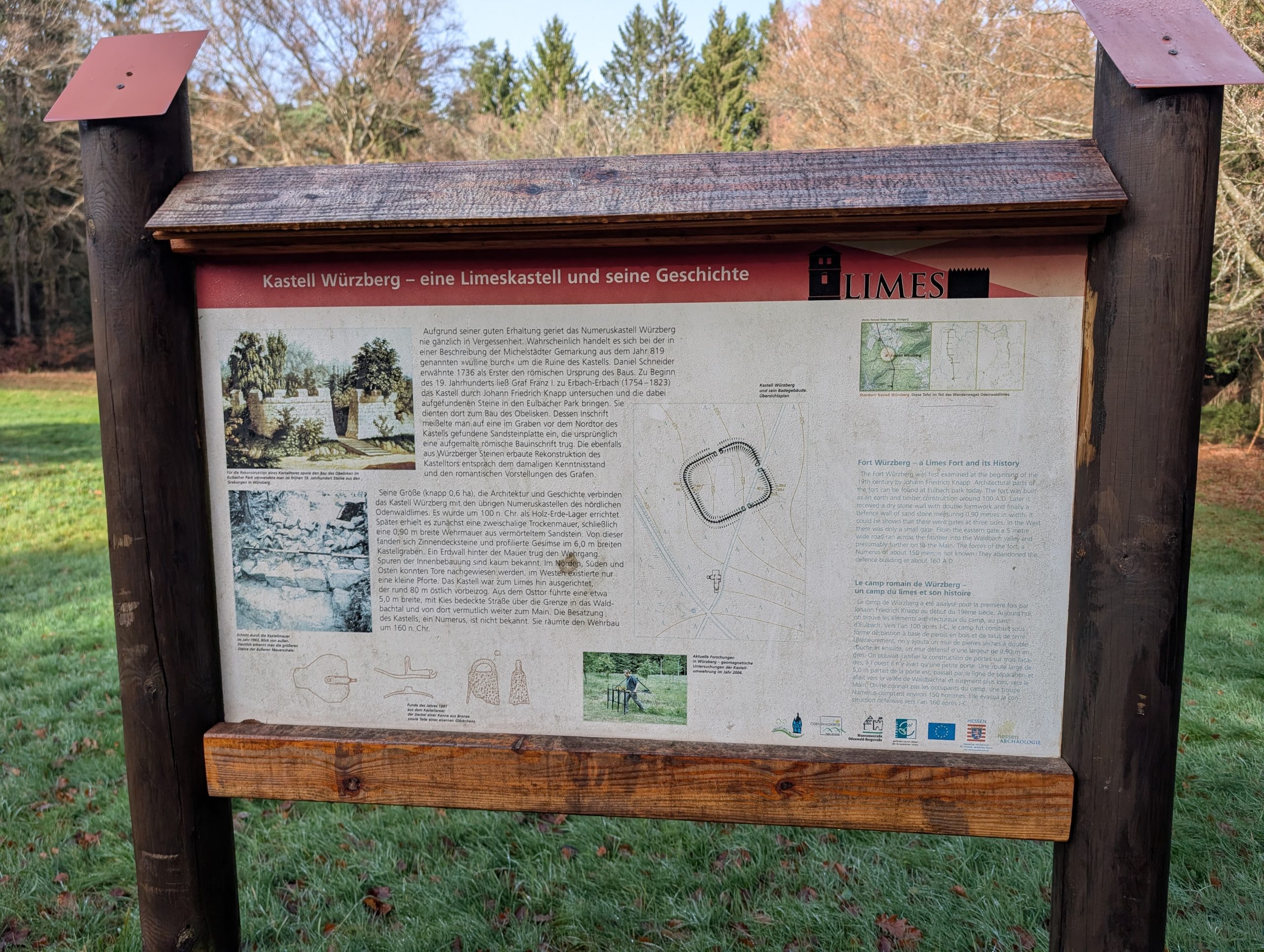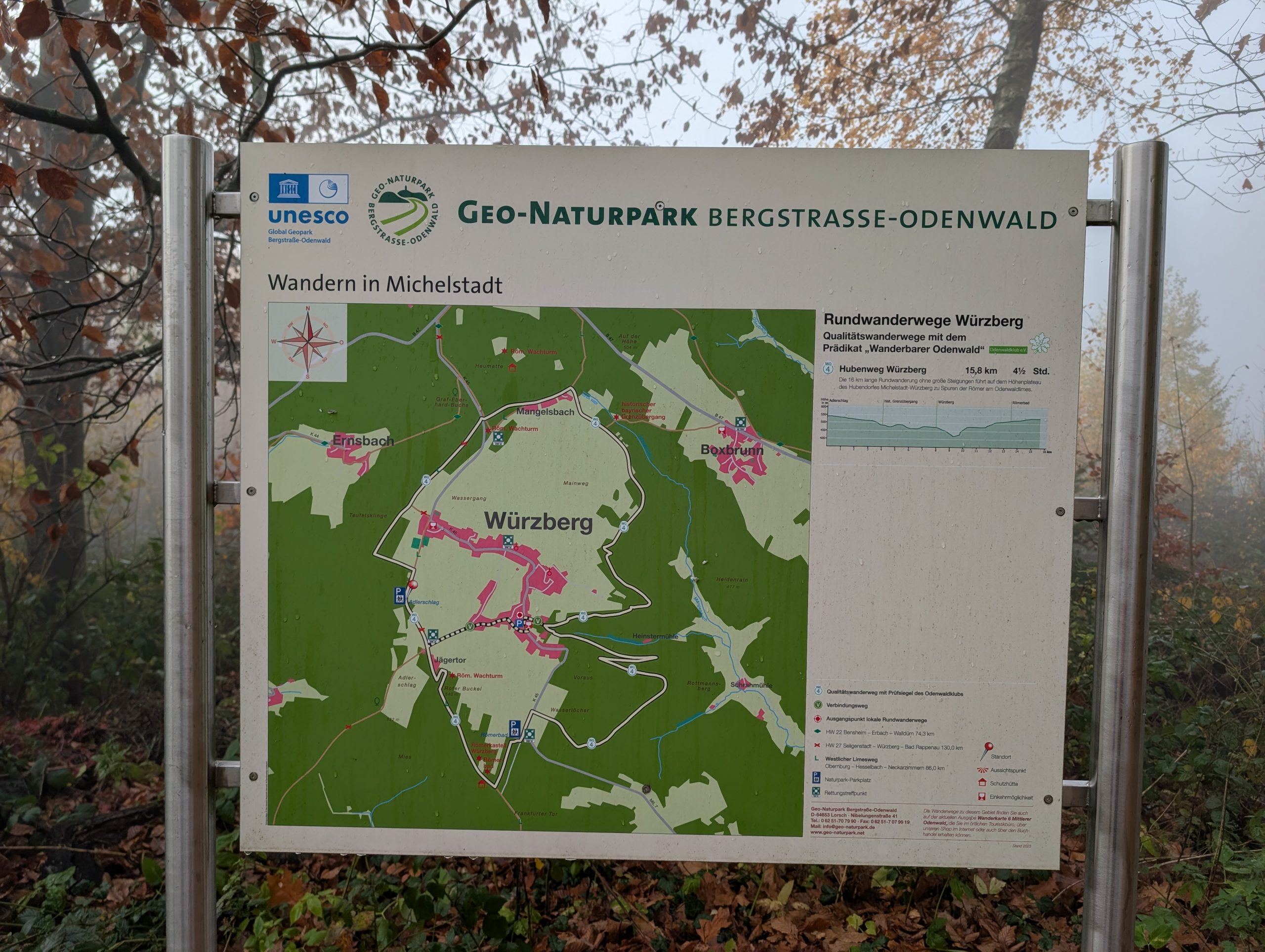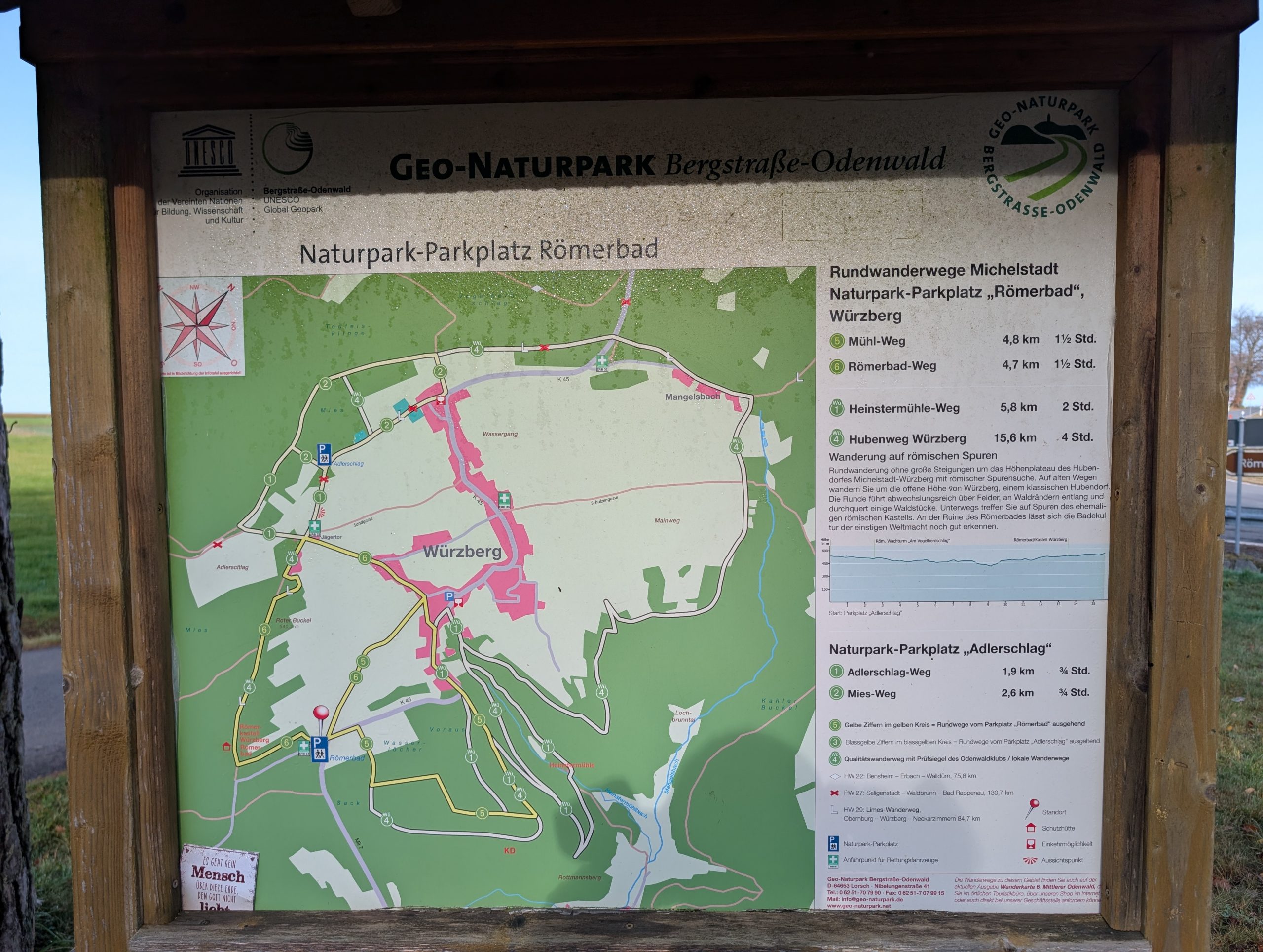 Startpunkt der Tour ist ein Wanderparkplatz bei Würzberg. Es ist ein kalter und sehr nebliger Tag und leider kommt die Sonne nicht hervor. Mit dem Westlichen Limesweg wandern wir in Richtung Mangelsbach. Hier biegen wir ab mit dem Rundwanderweg Würzberg 4 (Wü 4) und laufen im Uhrzeigersinn um Würzberg herum. Mit Wü 3 wandern wir anschließend durch Würzburg, bis wir zum Schluss wieder auf unseren Westlichen Limesweg stoßen. Er bringt uns zurück zum Parkplatz.