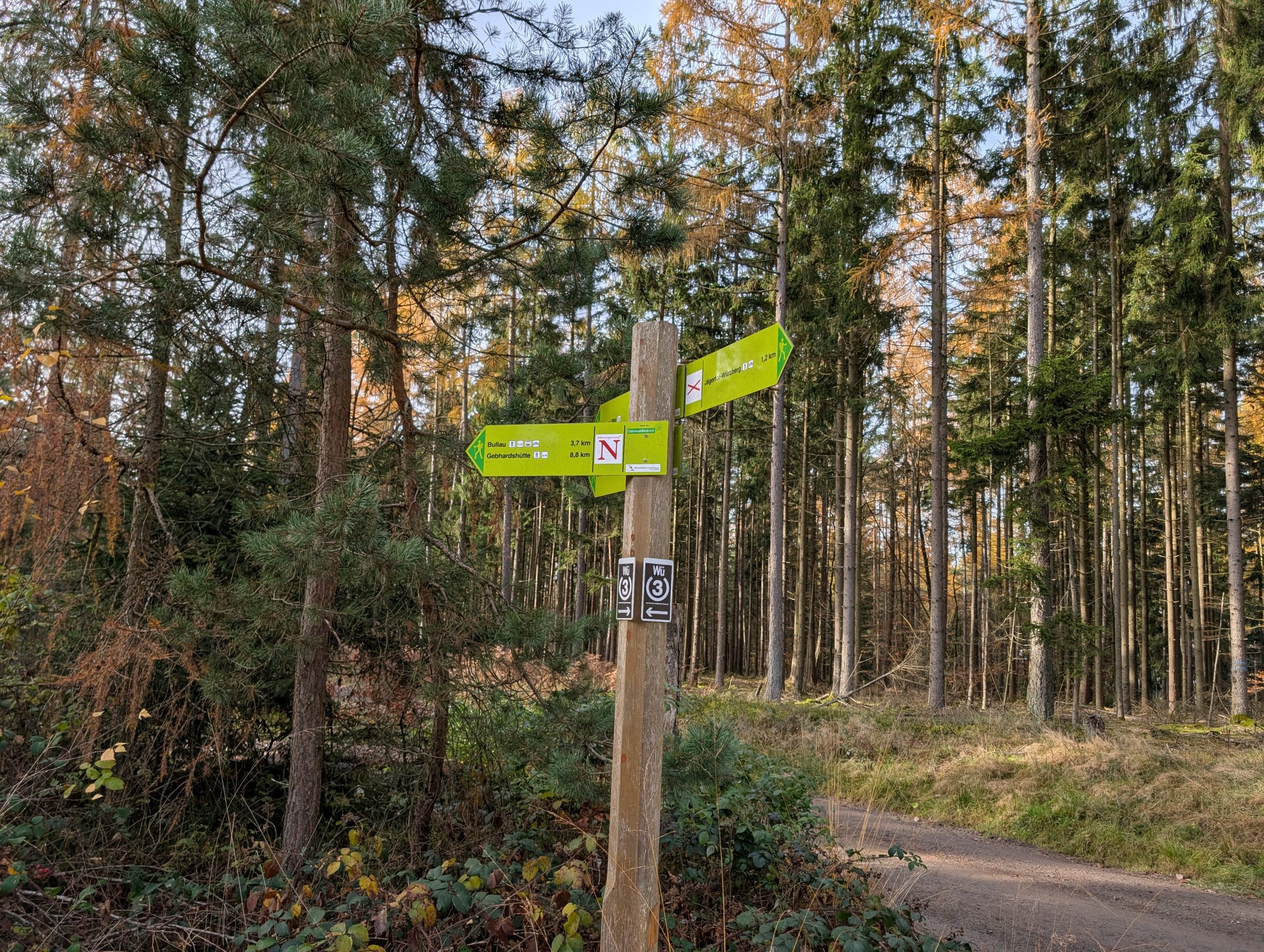 Diese Mal parken wir nicht am Jagdschloss Eulbach sondern auf einem Parkplatz an der B 47/L3349. Ein ganz kurzes Stück geht es entlang der Straße bis wir mit HW 20 und HW 22 in den Wald abbiegen und kurz darauf auf unseren Westlichen Limesweg stoßen. Ihm folgen wir in Richtung Vielbach. Dabei geht es vorbei an Windrädern und kurz vor dem Feriendorf Vielbrunn verlassen wir den Westlichen Limesweg wieder und wandern mit dem Rundwanderweg Vielbrunn 5 in einem großen Bogen zurück zu unserem Hinweg in Richtung der Windräder. Dann geht es zurück zum Parkplatz.