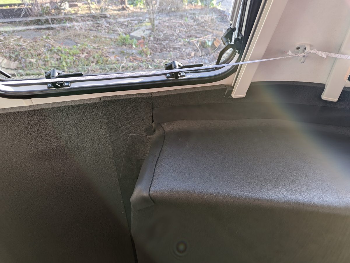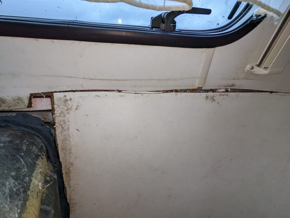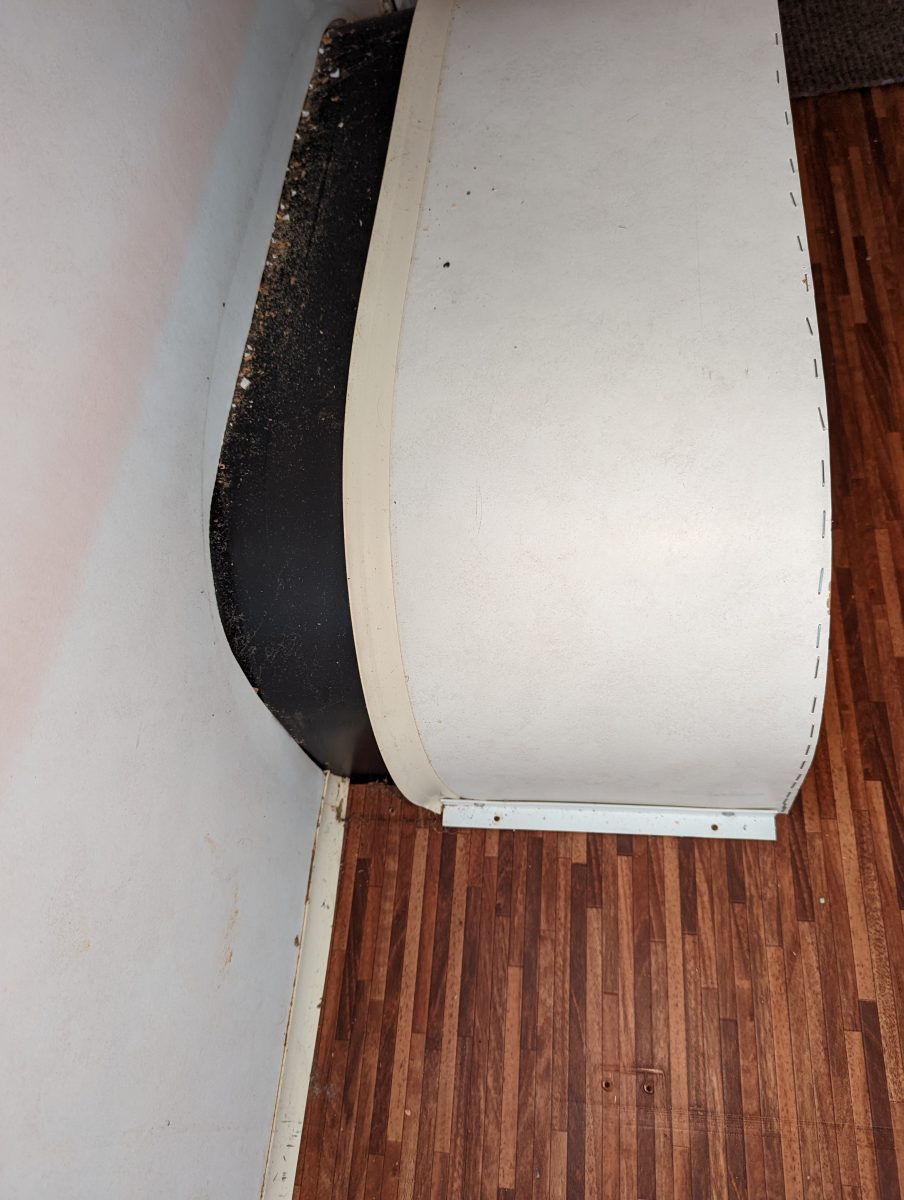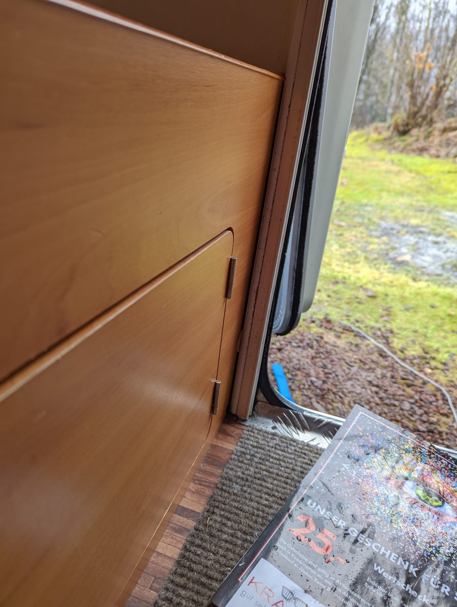 Die Wandverkleidung besteht aus beschichteter Holzfaser, die bei Kontakt mit Feuchtigkeit aufquillt. Das ist im Bereich des Gaskastens, um die Stauklappe und an der Schnittkante der Mittelschiene zu erkennen, auch wenn das Material nach der letzten Bewohnung vor 4 Wochen trocknen konnte.