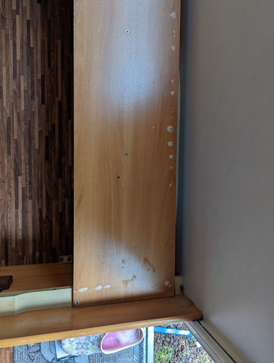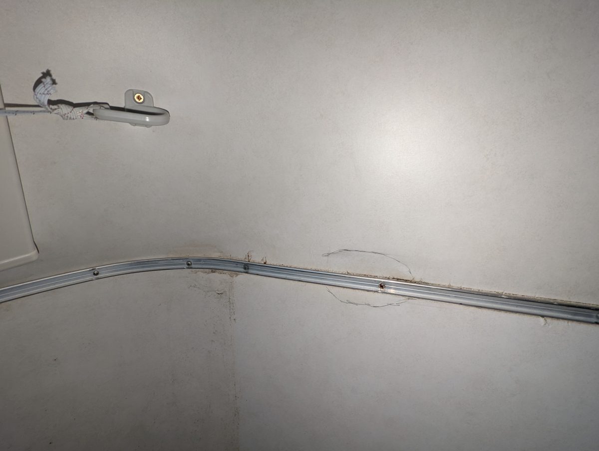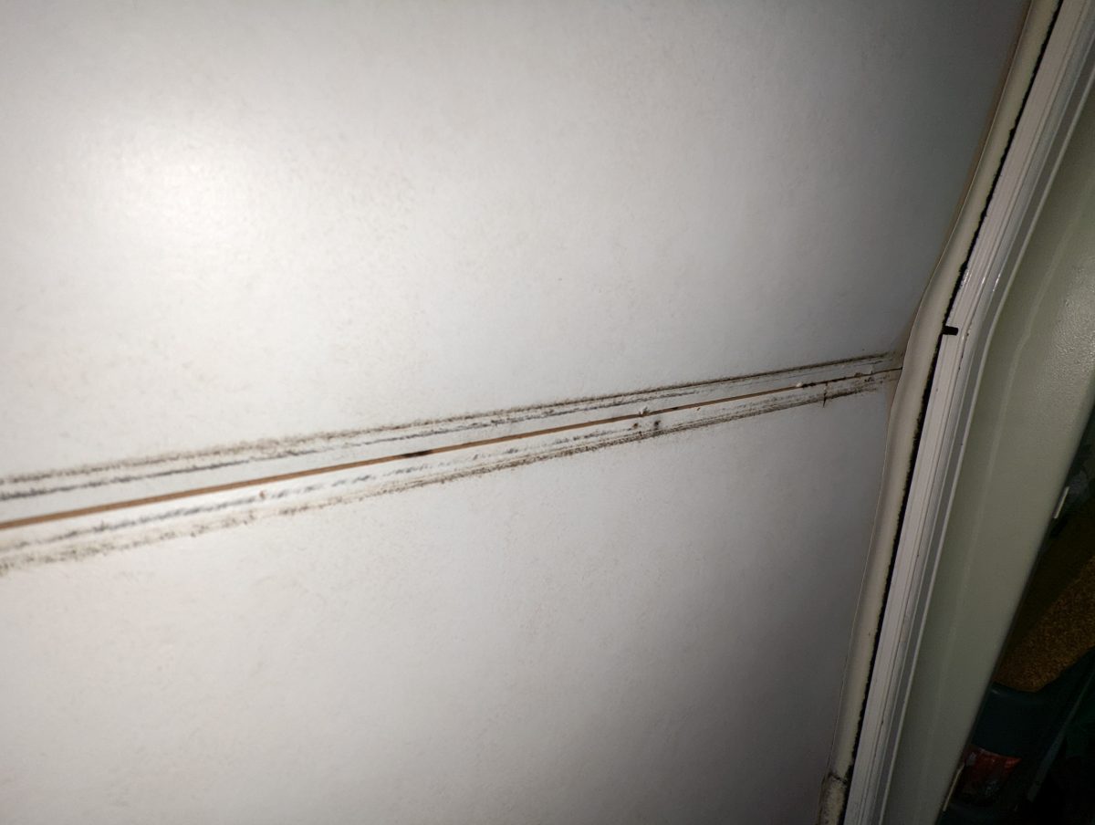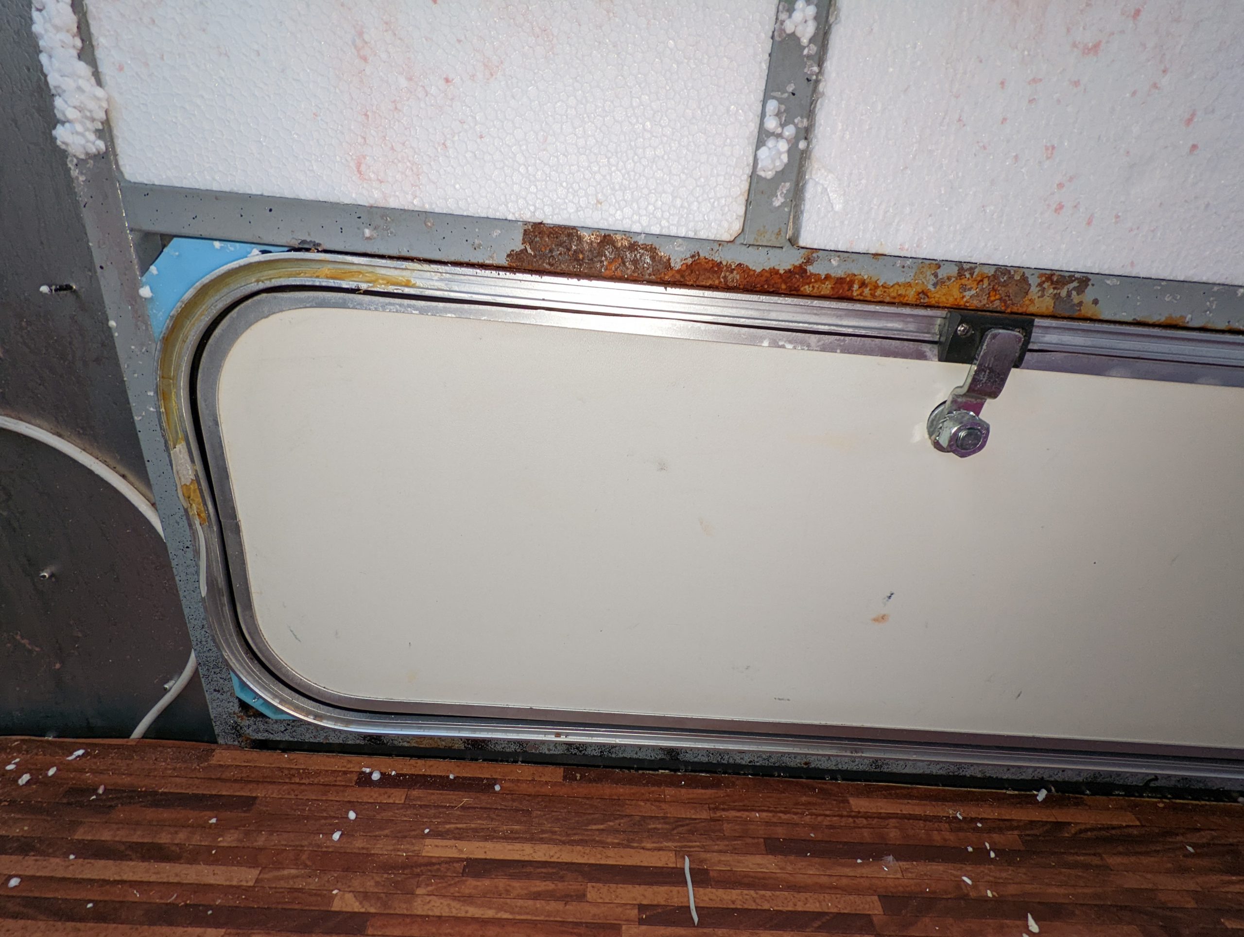 Die Wandverkleidung besteht aus beschichteter Holzfaser, die bei Kontakt mit Feuchtigkeit aufquillt. Das ist im Bereich des Gaskastens, um die Stauklappe und an der Schnittkante der Mittelschiene zu erkennen, auch wenn das Material nach der letzten Bewohnung vor 4 Wochen trocknen konnte.