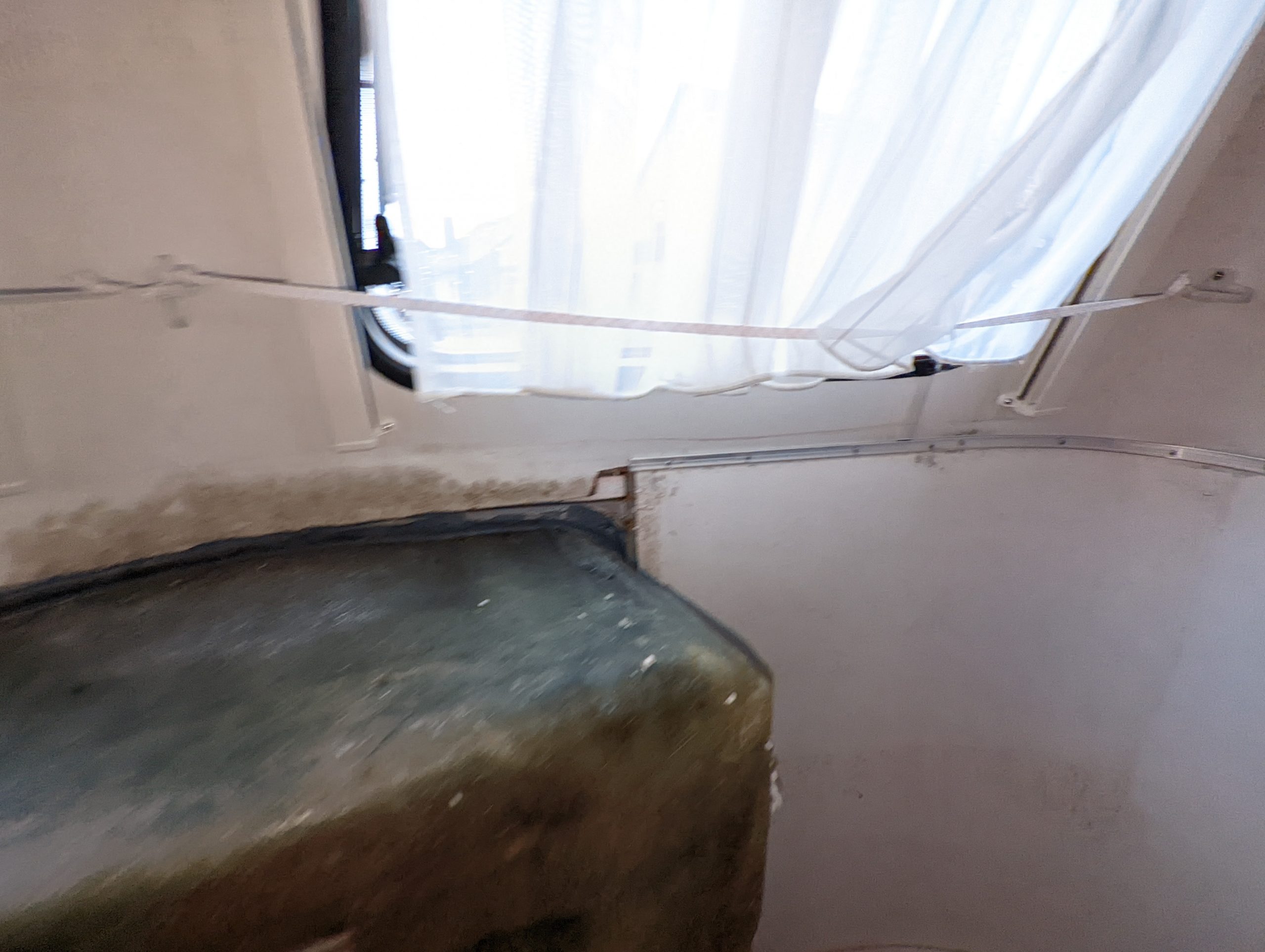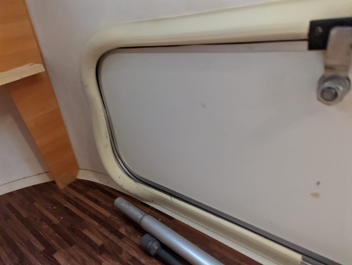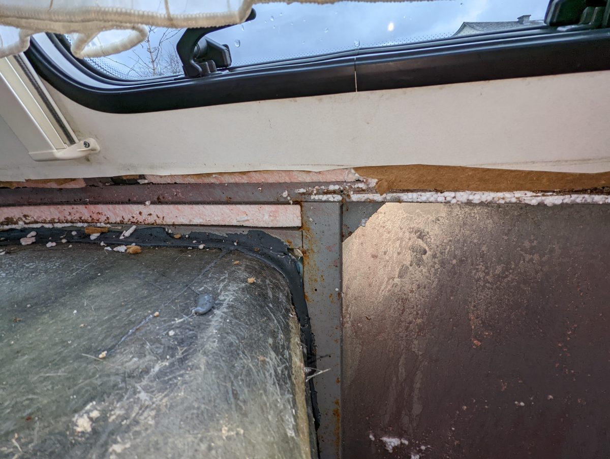 Die Feuchtigkeit ist Schwitzwasserkondensat aus der Innenluft, ein Wassereintritt über die Außenhülle ist nirgends zu erkennen. Die Kondenswasserbildung ist im Bereich des Gaskastens besonders stark, weil dort durch mangelhafte Abdichtung zwischen Gaskasten und Alu-Außenhaut bis zu 1 cm durchmessende Öffnungen reichlich kalte Frischluft hereinlassen. Da im verwinkelten Bugstauraumschrank die warem Luft schlecht zirkuliert bleibt es hier bei Bewohnung im Winter dauerhaft feucht mit abwischbaren Schimmelbefall auf den Verkleidungsflächen.