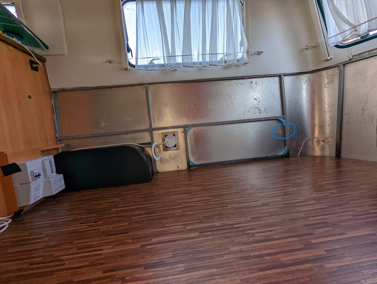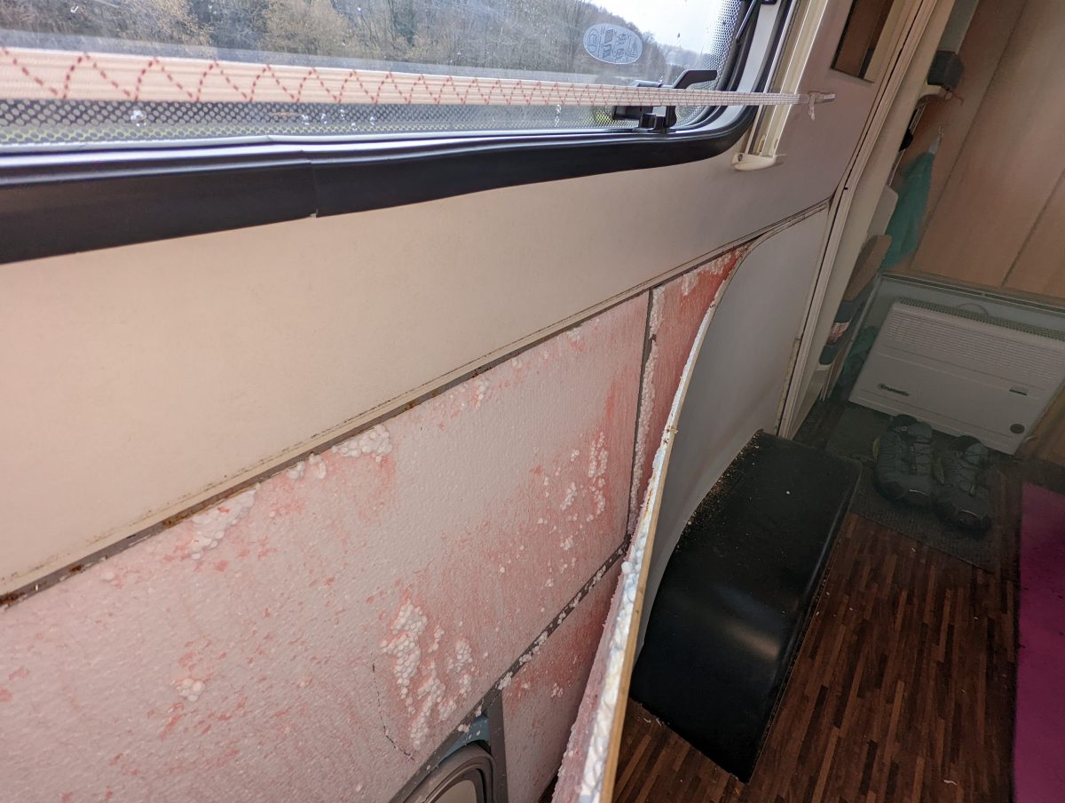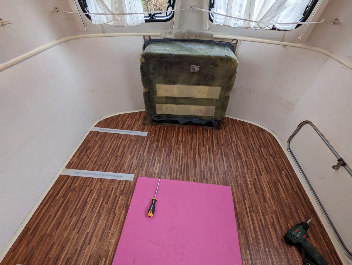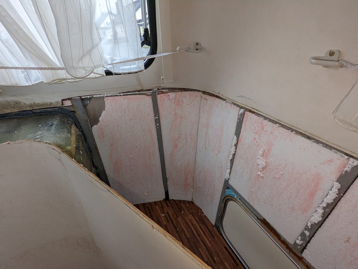 Unser Puck 235 GT Legend zeigte bei Winterbewohnung an den Seitenwänden unterhalb der Seitenfenster feuchte Stellen und aufgequollende Seitenverkleidung. Bei Nachtemperaturen um 0 Grad ist Schwitzwasser ein Problem und nach dem Wasserschaden am Kamin wollen wir im Wohnraum links der Tür, im Bug rund um den Deichselkasten und auf der linken Seite weiter bis zum Kühlschrank vernünftig isolieren und Liege- und Sitzmöbel einbauen, die eine Hinterlüftung ermöglichen.