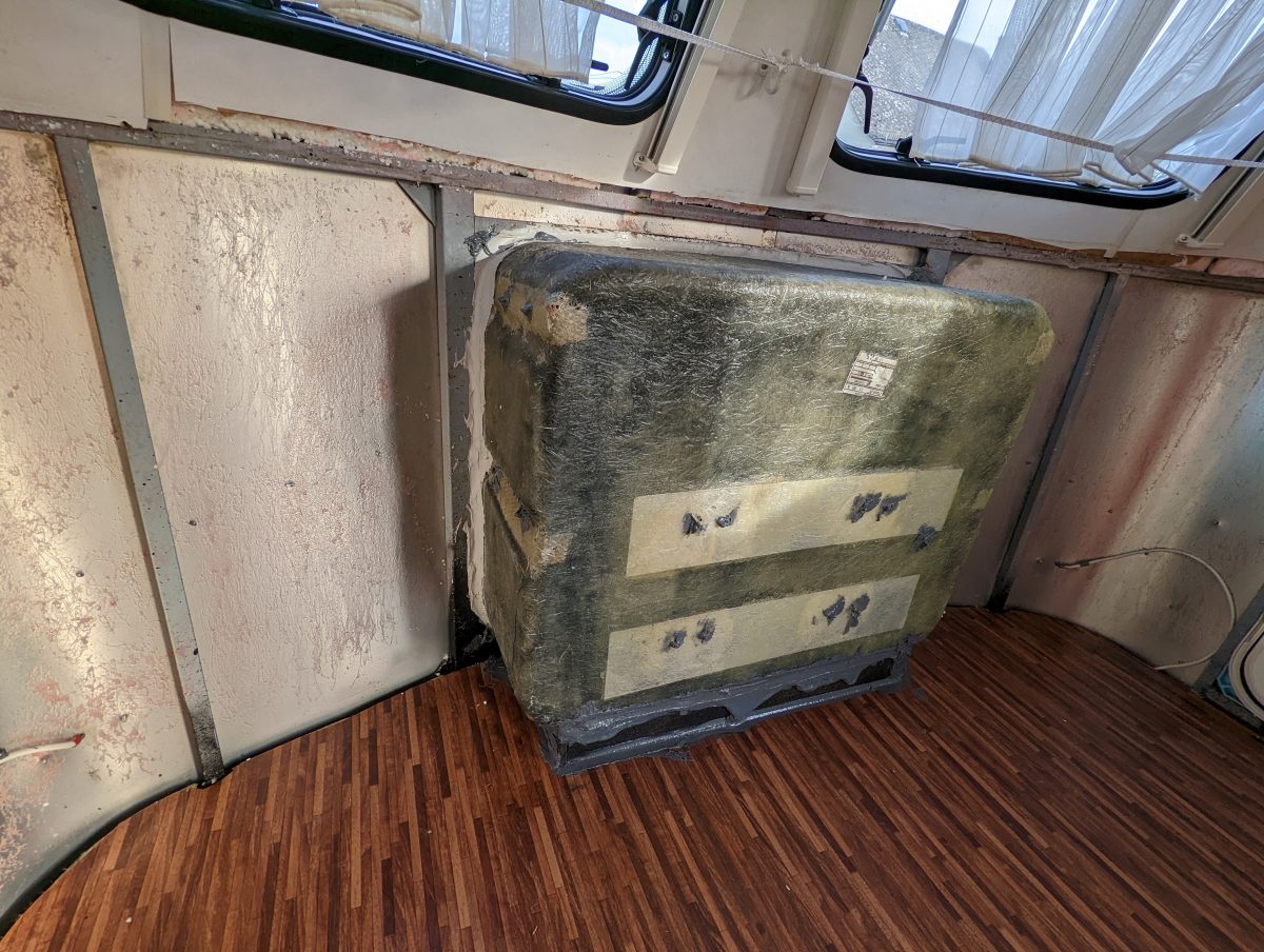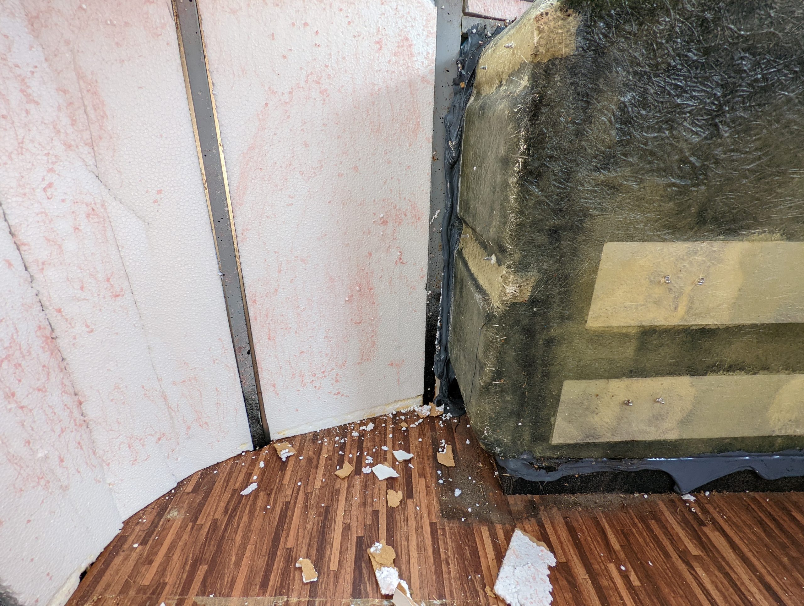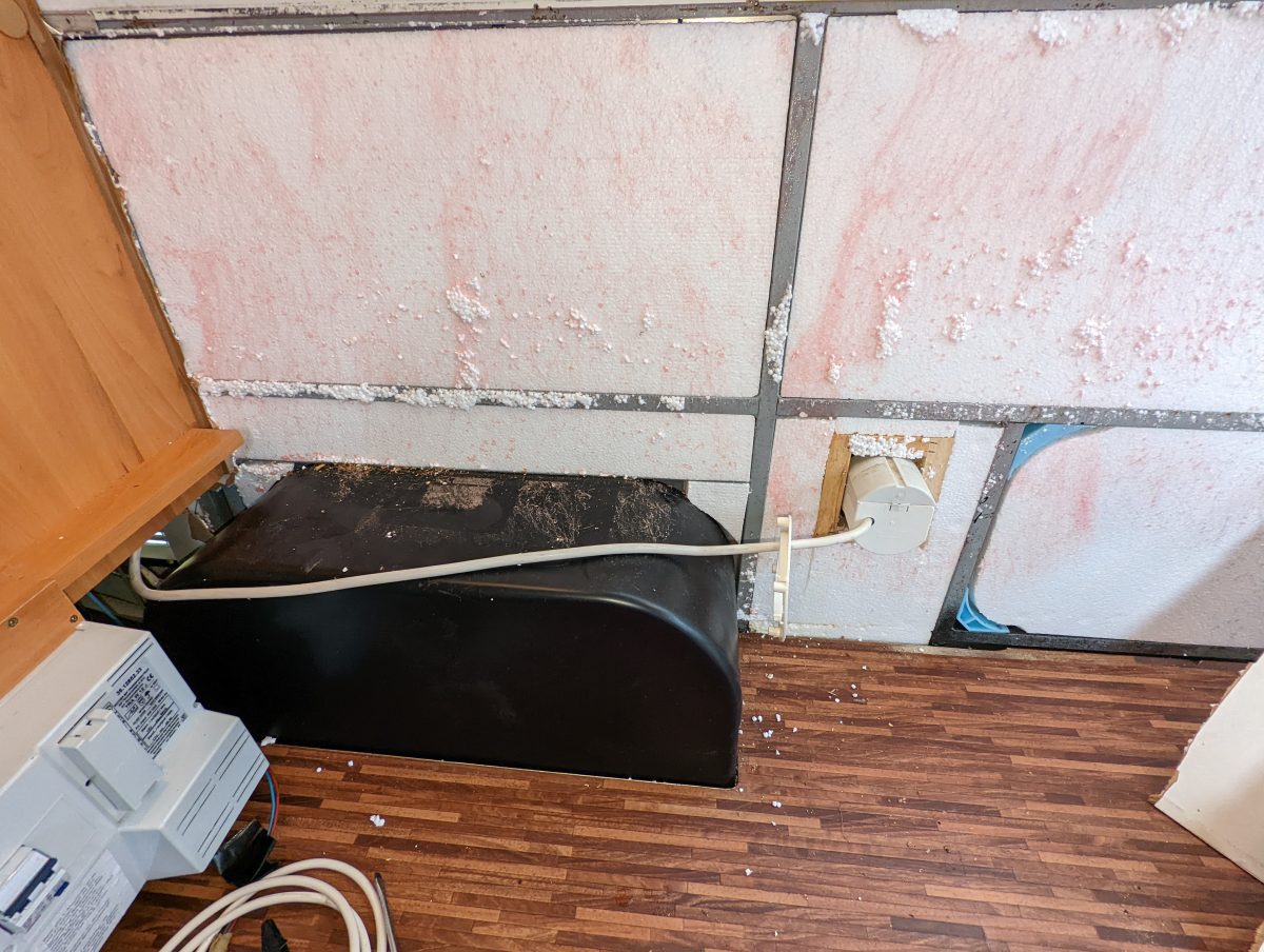 Zum Kühlschrank hin wird unterhalb des Lüftungsgitters ebenfalls die Wandverkleidung entfernt. Die Bodenplatte und die Stahlkäfigstrebe zeigen keine Feuchtigkeits- oder Rostspuren. Die Isolierung soll hier unterhalb des Ausschnittes mit erneuert werden.