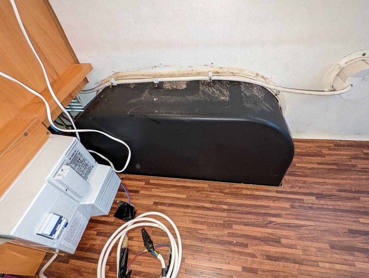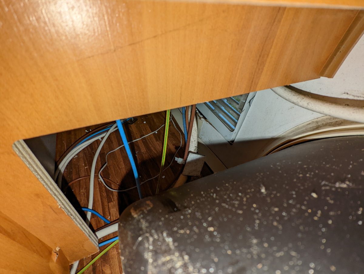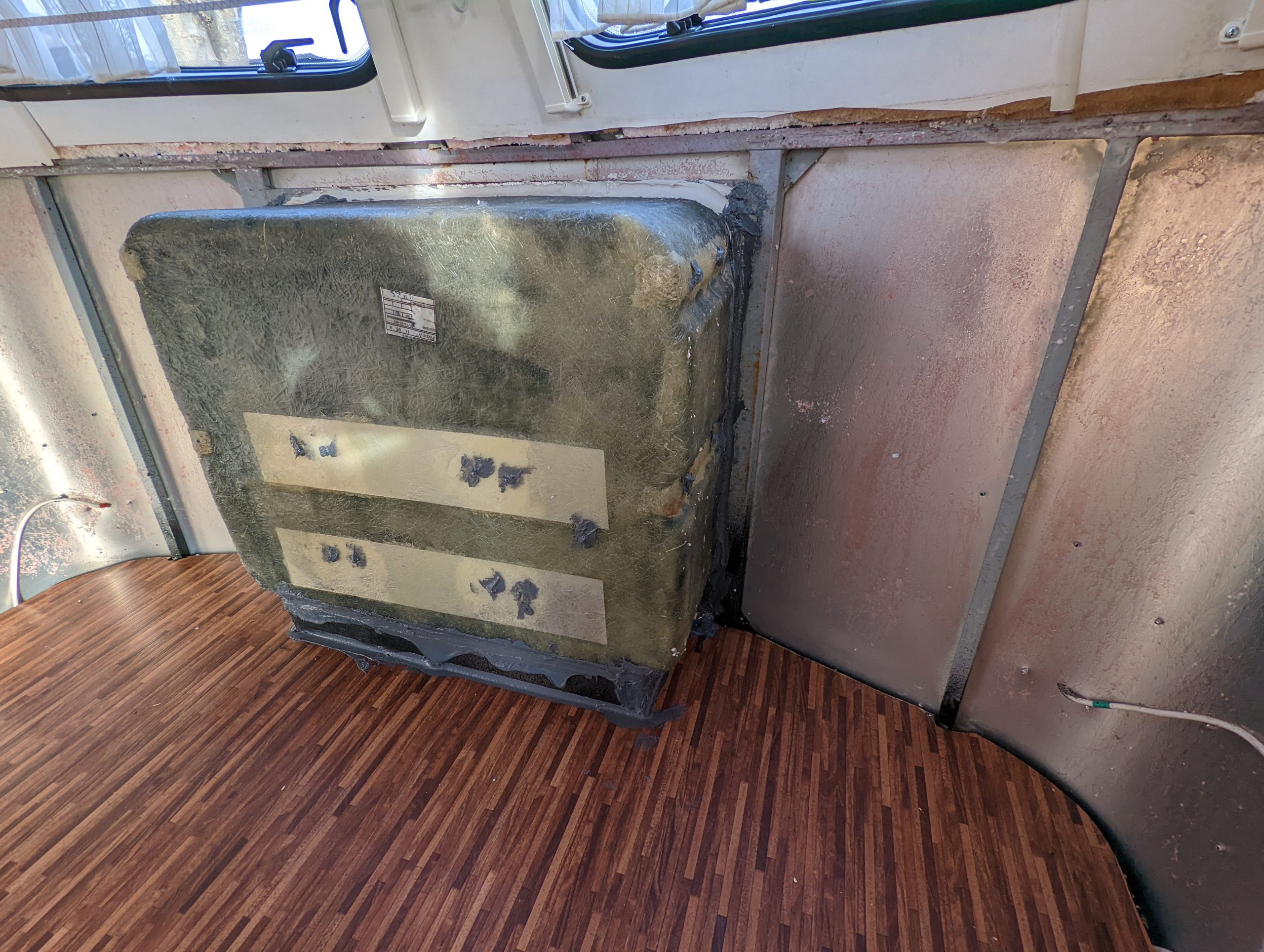 Zum Kühlschrank hin wird unterhalb des Lüftungsgitters ebenfalls die Wandverkleidung entfernt. Die Bodenplatte und die Stahlkäfigstrebe zeigen keine Feuchtigkeits- oder Rostspuren. Die Isolierung soll hier unterhalb des Ausschnittes mit erneuert werden.