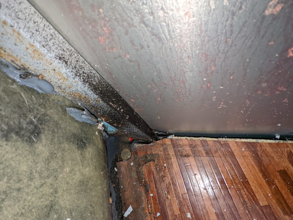 Ab 10 cm oberhalb der Unterkante des Stahlrahmenkäfigs ist das Rohr mit schwarzer Schutzfarbe eingesprüht. Das unterste ringsherum verlaufende Stahlrohr des Käfigs liegt auf Niveau der Unterseite der Bodenplatte, die zum Käfigrohr 5 mm Luft hat und ist durch den seitlichen Spalt nicht optisch zu prüfen. Da die Bodenplatte an keiner Stelle aufgequollen ist oder Wasserspuren zeigt, gehen wir davon aus, dass die Bodenkonstruktion von Innen keinen Schaden genommen hat.