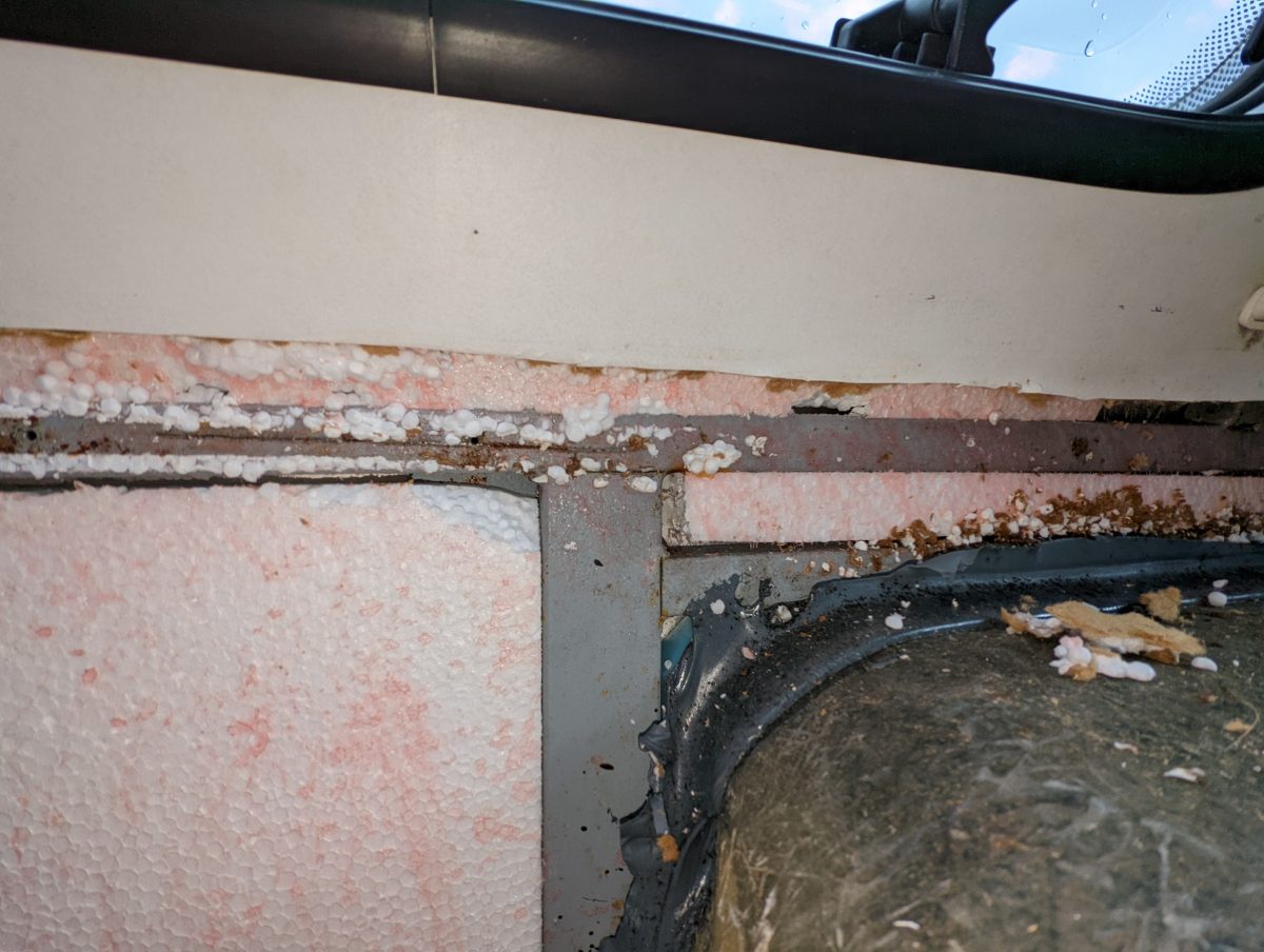 Die Abdeckung der Radkästen und der Verkleidung des Gaskastens wird ebenfalls nach dem Lösen von ein paar Schrauben entfernt. Da die Isolierung nur unterhalb der Fensterlinie erneuert werde soll, wird die mittig rundrum verlaufende Aluschiene, die die obere und untere Wandverkleidung verbindet und als Abdeckung der Stoßkante dient, entfernt. Die eingeklipste optische Abdeckung bricht dabei und muss bei Erstellung der Innenverkleidung neu gestaltet werden.