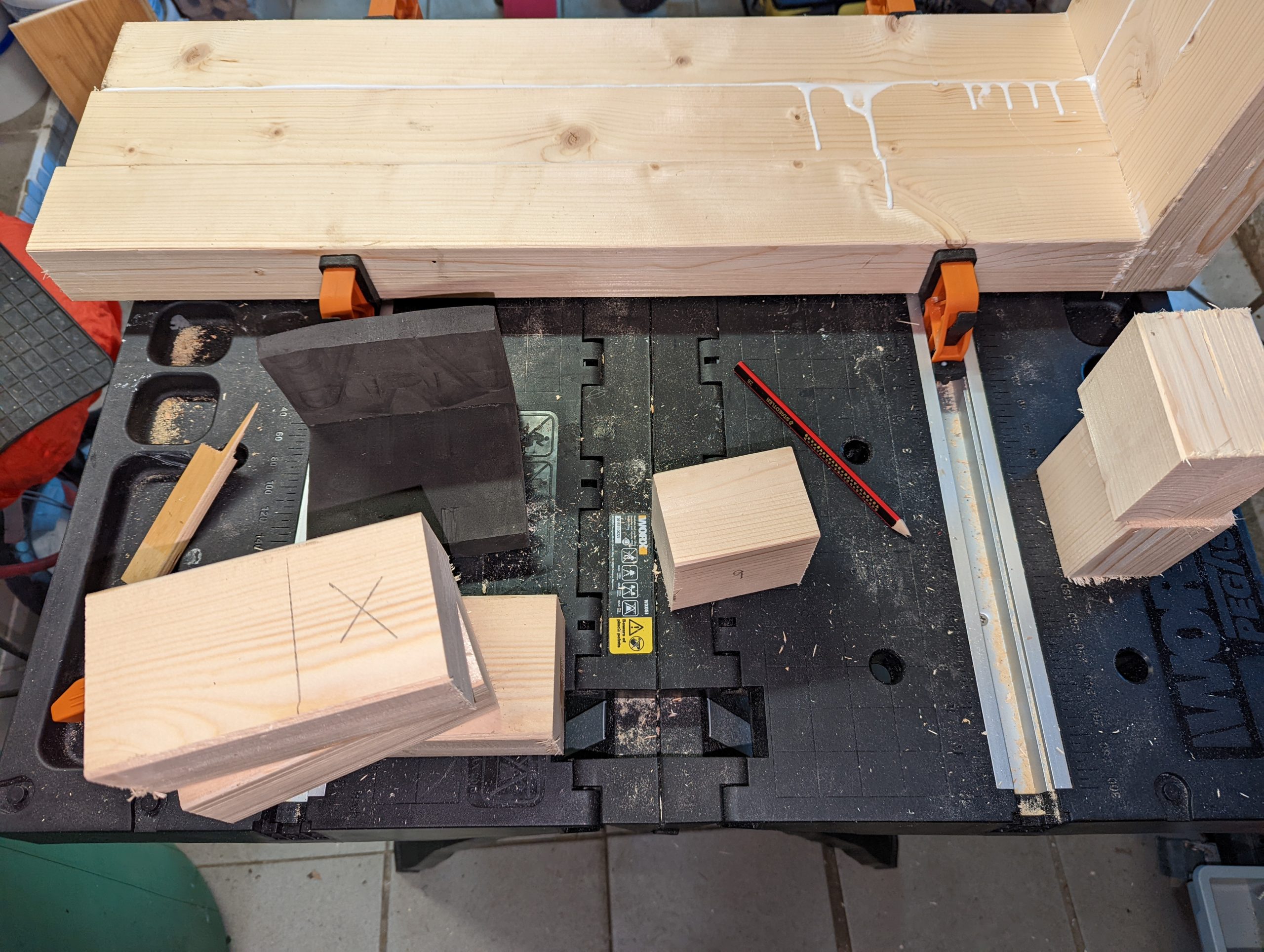 Der Unterbau wird auf Leimholzbalken 6×8 cmin drei Lagen aufeinander geleimt. Die vierte Lage in 32 cm Höhe stellt dann die Auflage für die Sitzpolster zur Verfügung. Für das Bett haben wir so 4 Füße erstellt, mit der vierten Lage einen Bettrahmen hergestellt und eine Lattenrostauflage (90 cm Breite) an der Innenseite aufgeschraubt.
