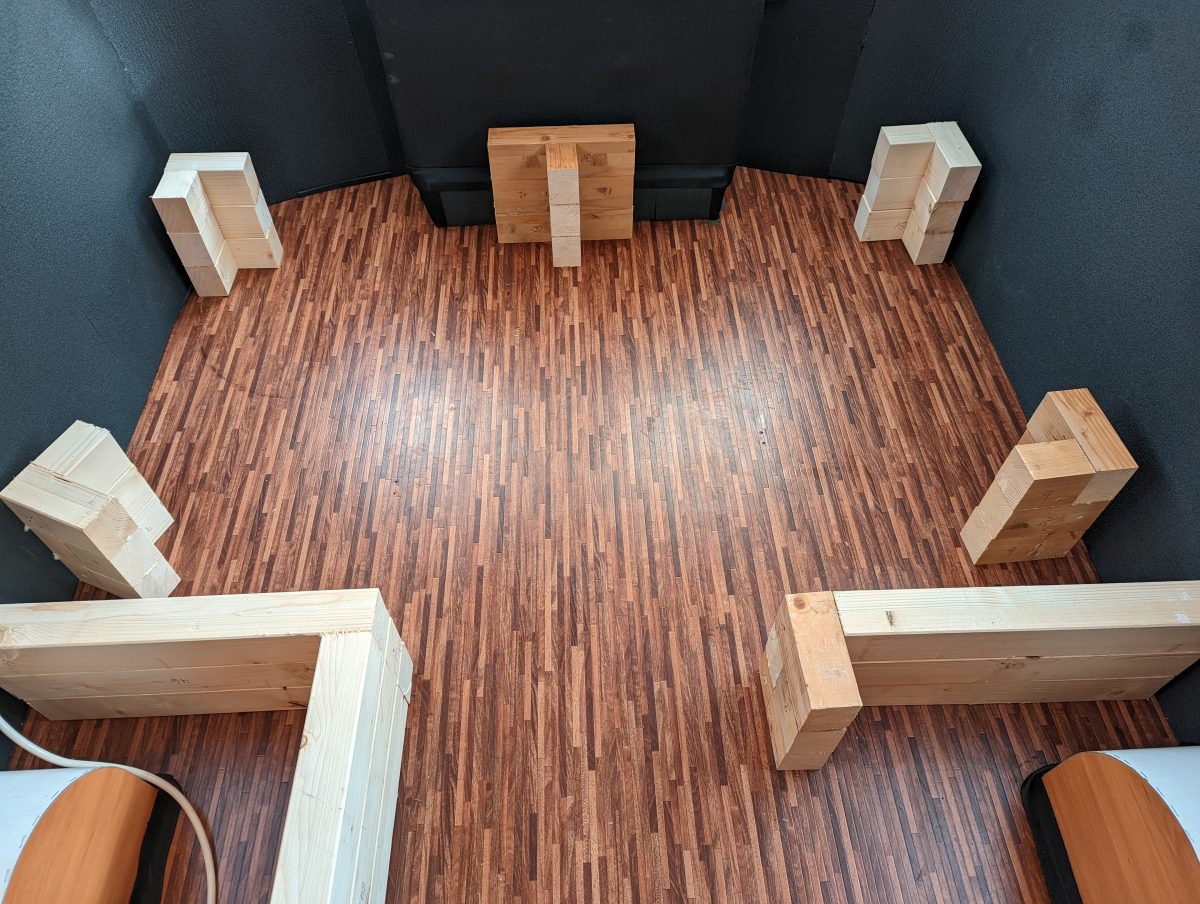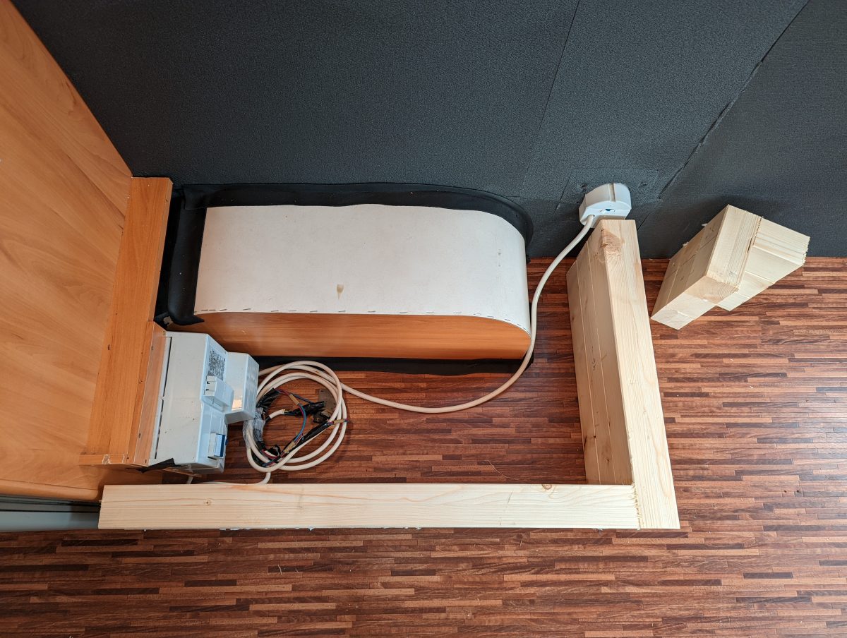 Dazwischen aus Resthölzern eine Kiste, damit zwei als Schlaffläche dienende Platten größer als die Ladefläche des Anhängers (51×71) sein dürfen. Die zwei Platten (80×90) und die Oberfläche der Kiste (50×80) ergeben aneinander gehangen eine 2,30 Meter lange und 0,8 Meter breite Liegefläche. Die zwei Platten werden links und rechts auf die Kiste aufgelegt, nachdem die Räder entfernt wurden. Auf der anderen Seite stützen sich die Platten auf jeweils zwei Tischbeine (38 cm) ab.