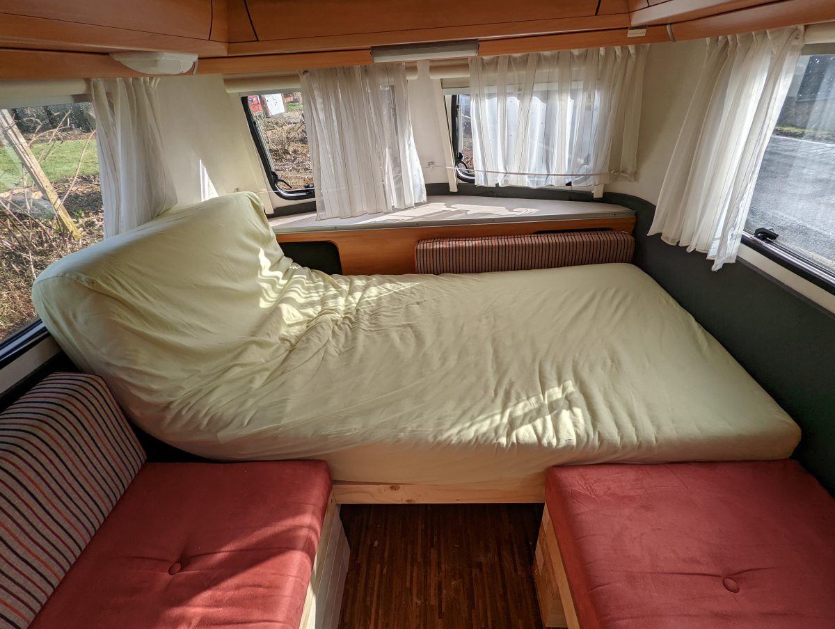 Wir haben die geteilte Sitz/Liegefläche von 180cm x 160cm vorher auch schon zweigeteilt genutzt. Die Polterteile im Bug wurden in Schlafstellung behalten und nur der Teil zur Tür hin wurde tagsüber zur Sitzgelegenheit umgebaut.