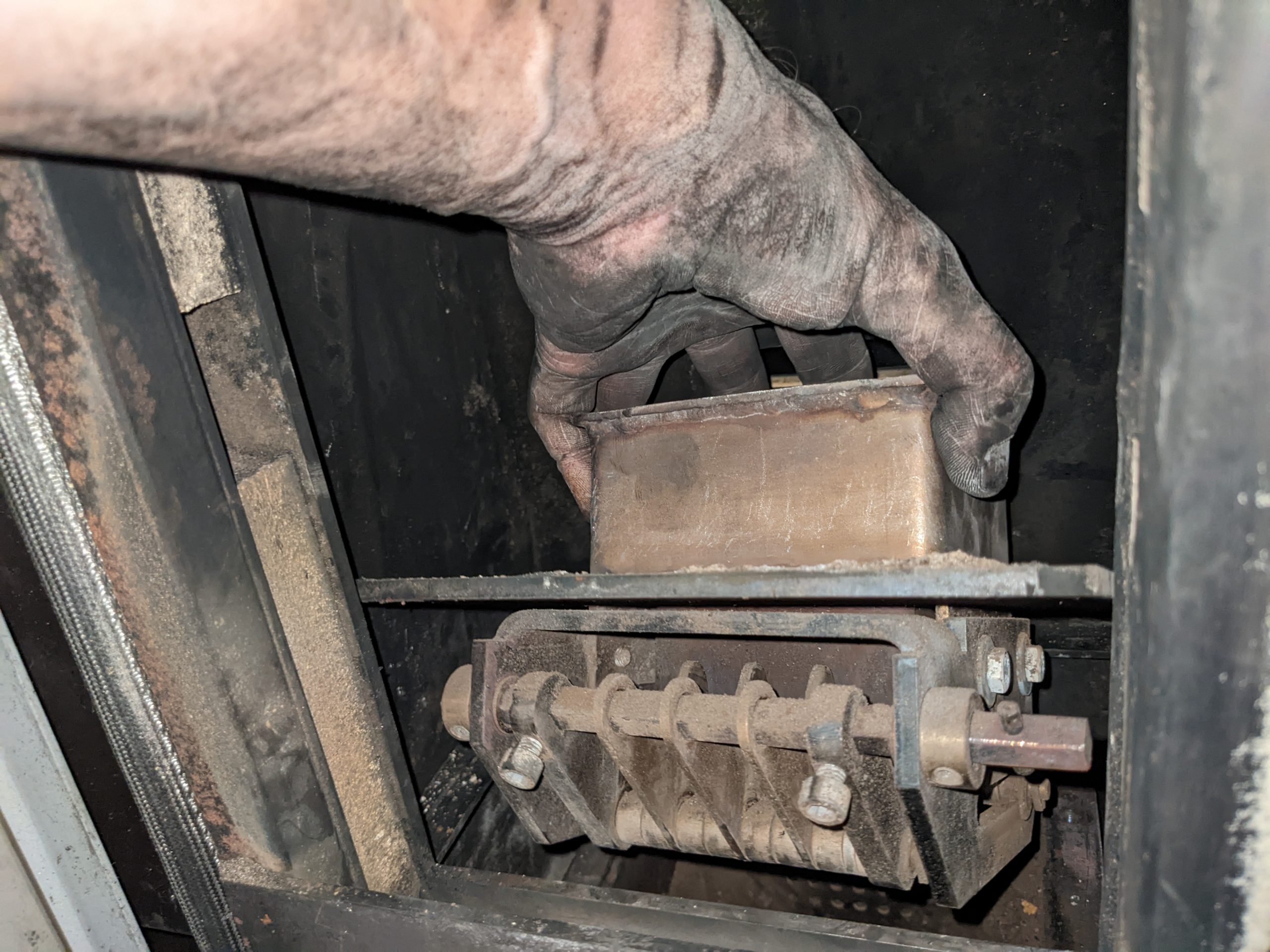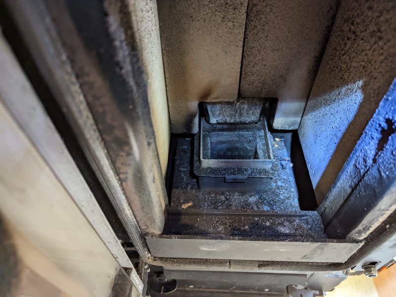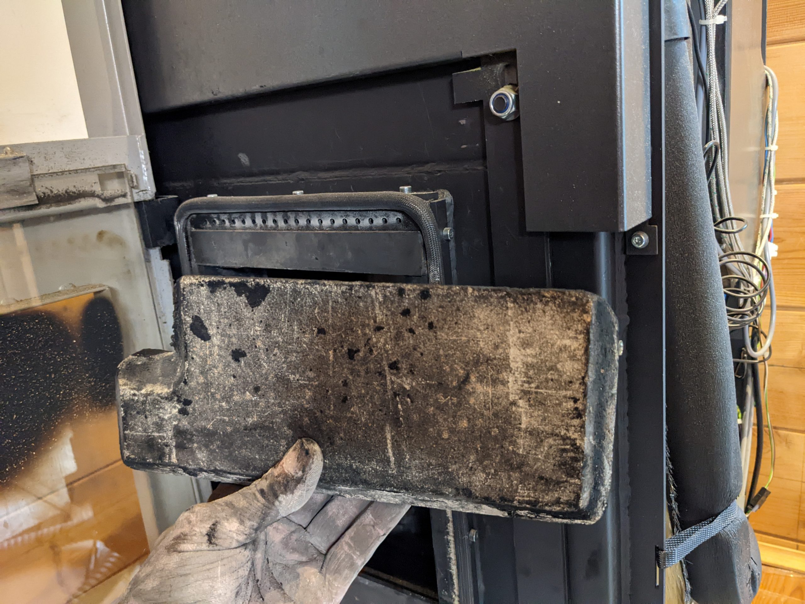 Beim Ausbau unterstütz einen dabei die Schwerkraft, bei Einbau muss der Rost mit einem Schraubenzieher gegen die Schwerkraft zusammengeschoben werden, damit der Brenntopffuß an dem Pelleteinwurf vorbei passt. Das Teil ist schwer und die Brennraumöffnung scharfkantig. Der Rost hat Belüftungslöcher, die wollen von Schlacke befreit werden. Das geht bei vielen der Öffnungen auch bei der monatlichen Reinigung, aber nicht alle Löcher sind im eingebauten Zustand mit einer Büroklammer gut erreichbar.