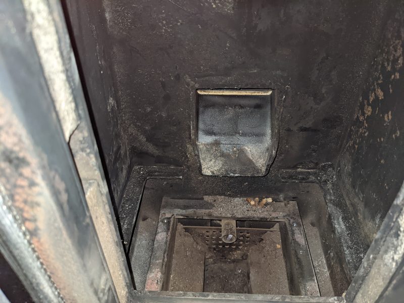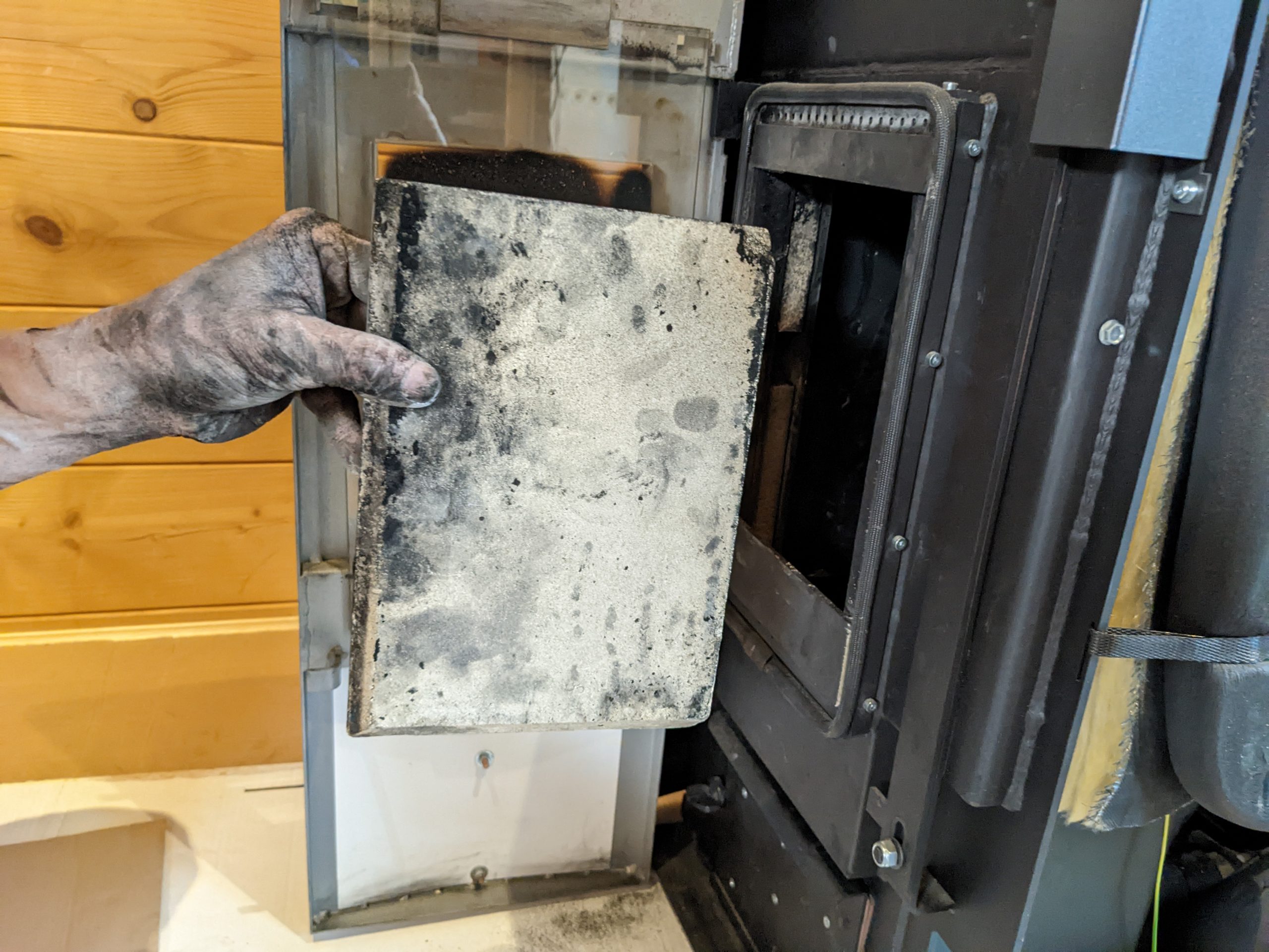 Stufe 1 alle 6-8 Wochen: Reinigung des Wärmetauschers und des Abgaszuges auf der linken Ofenseite.
