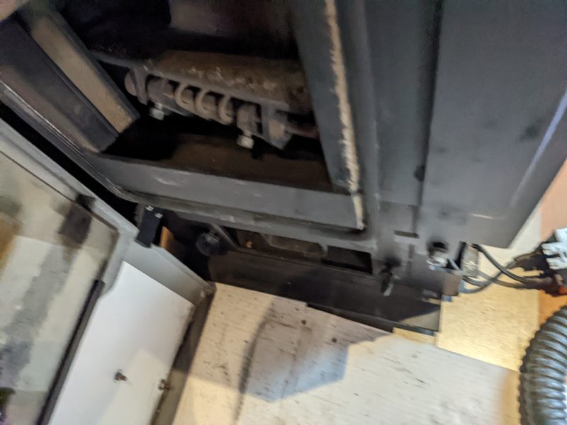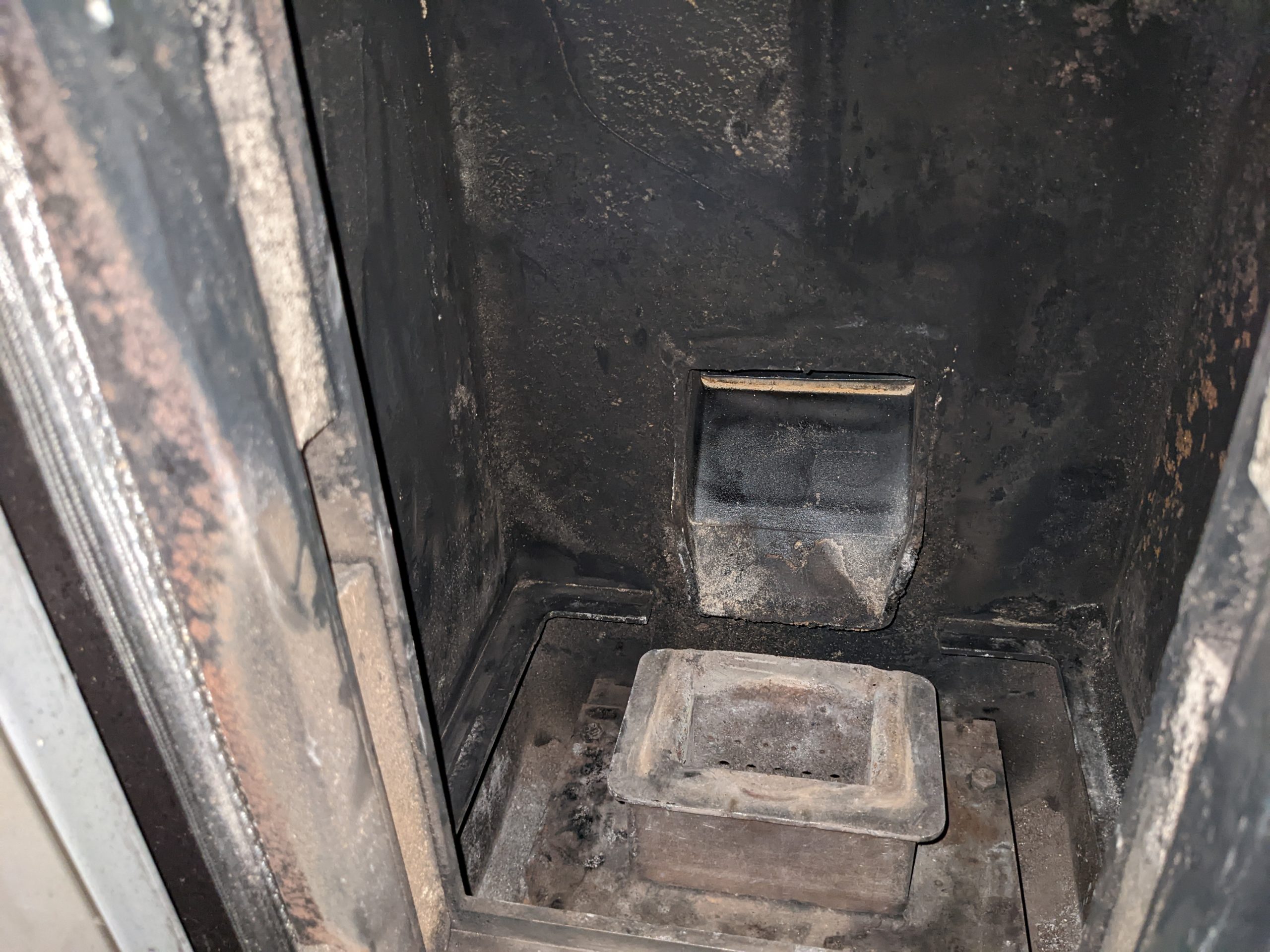 Der Ausbau des Brenntopfes wäre eigentlich kein großes Problem, wenn der Sockel etwas kleiner wäre. Die Schrauben konnen noch einfach gelöst werden. Dann den Brenntopf anheben und nach vorn kippen und gleichzeitig von unten durch die Ascherutsch versuchen, den beweglichen Rost so anzuwinkeln, dass der durch die Rostöffnung passt und nach oben aus dem Brennraum gezogen werden kann.