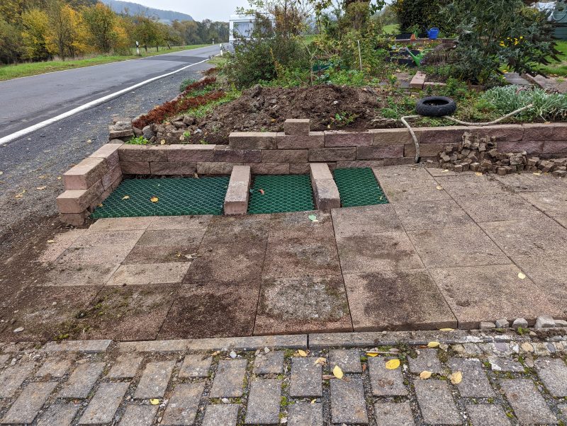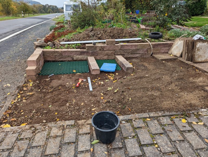 Der Boden zwischen den Steinreihen wird mit Rasengitter ausgelegt, die sollen dann mit Kies gefüllt werden.