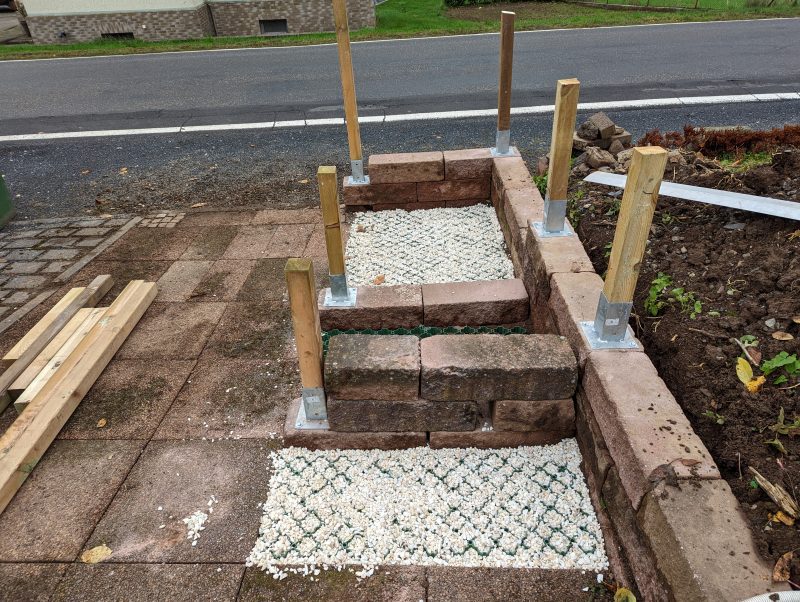 Die Betonmauersteine wurden neu positioniert. Sie sollen als Basis für die neuen Pfosten dienen.